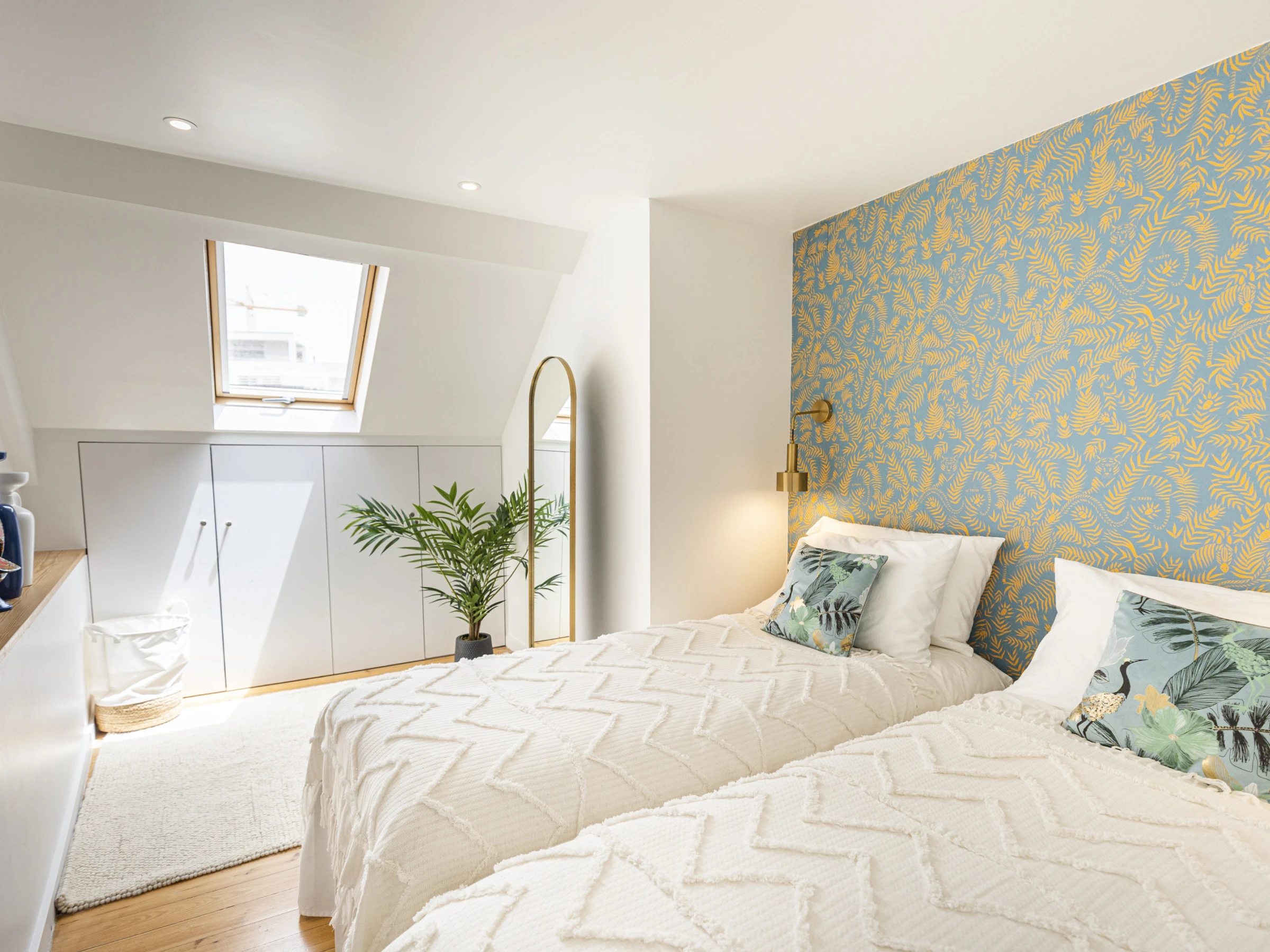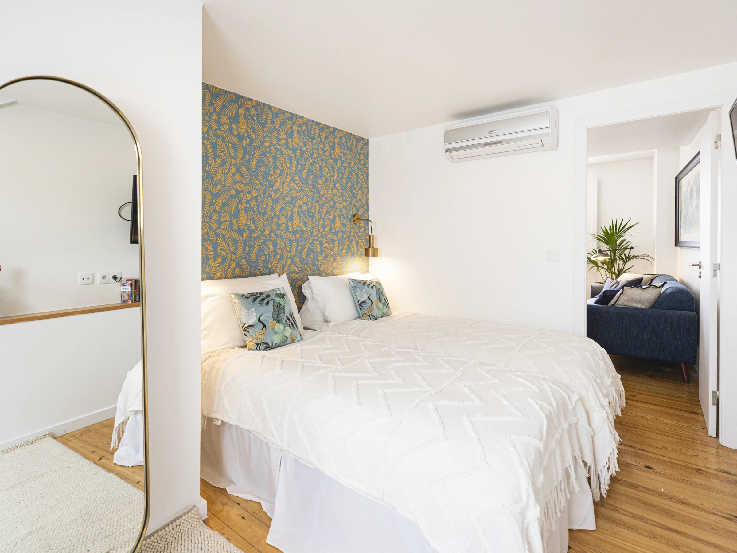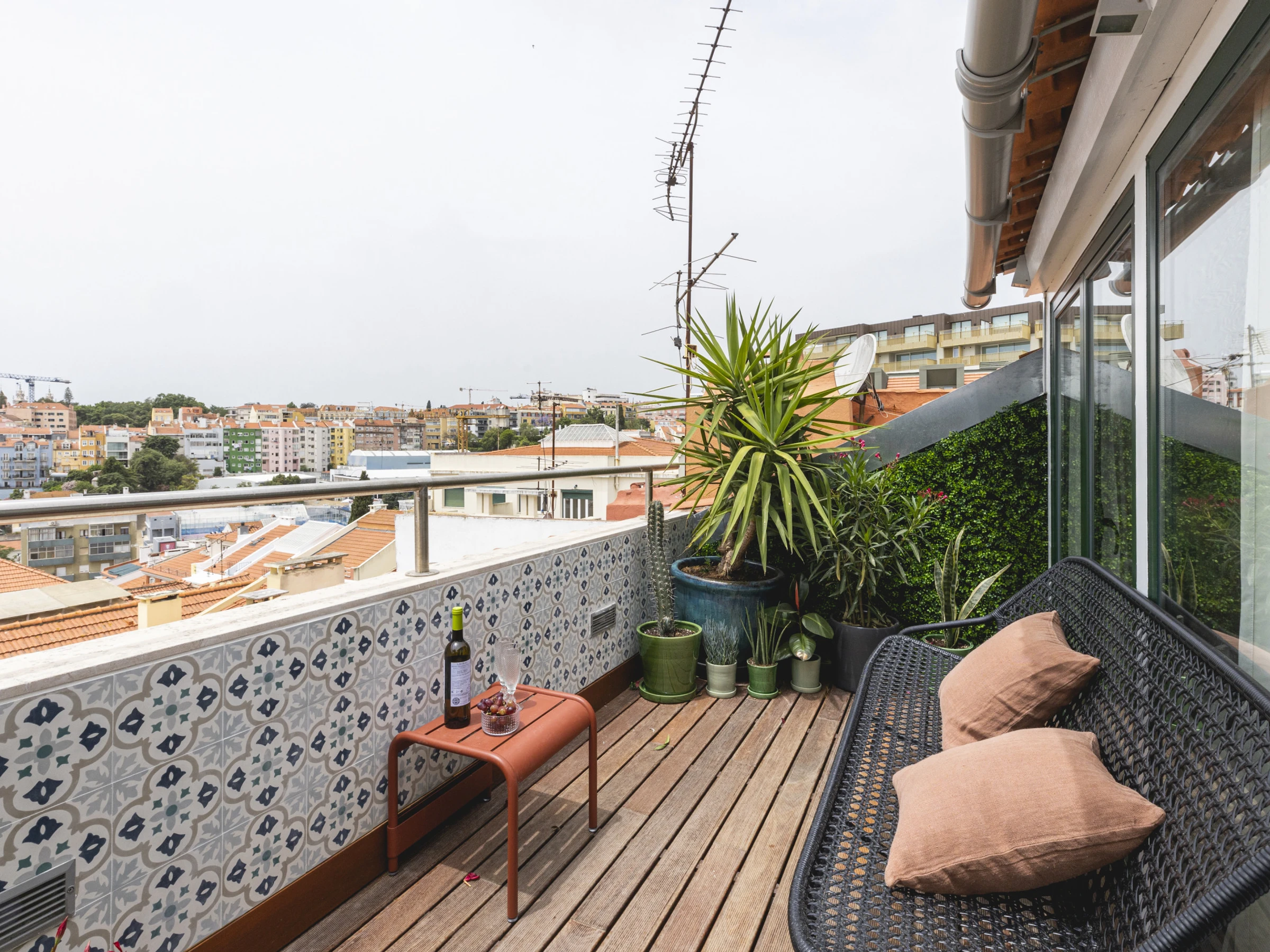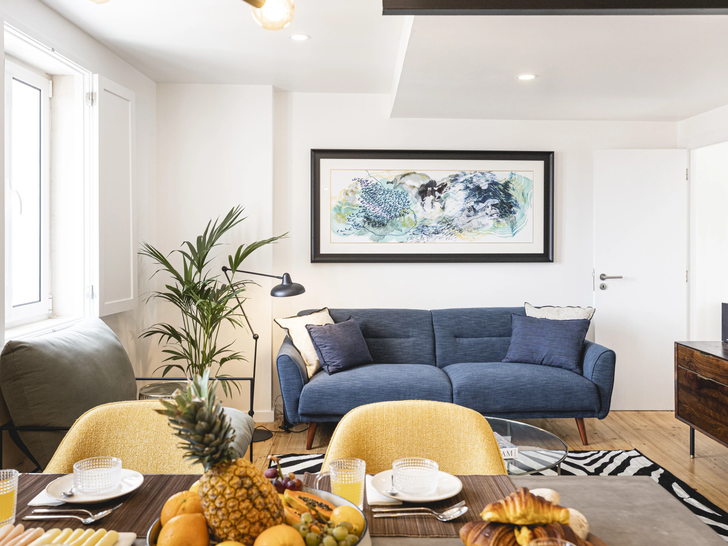 Soft yellow chairs are positioned around the table, adding a cheerful feeling to the apartment. The bathrooms are in keeping the rest of the flat: modern, comfortable and stylish. Different shades of blue tiling are juxtaposed with the white amenities to create a feeling of utter cleanliness. The roof terrace is arguably this flat’s most amazing feature, with a bench for you to sit on and enjoy your morning coffee or an evening sundowner whilst watching the world go past and the sea in the background. This apartment is comfortable, chic and accessible, and offers the most unforgettable spot to explore Lisbon from.