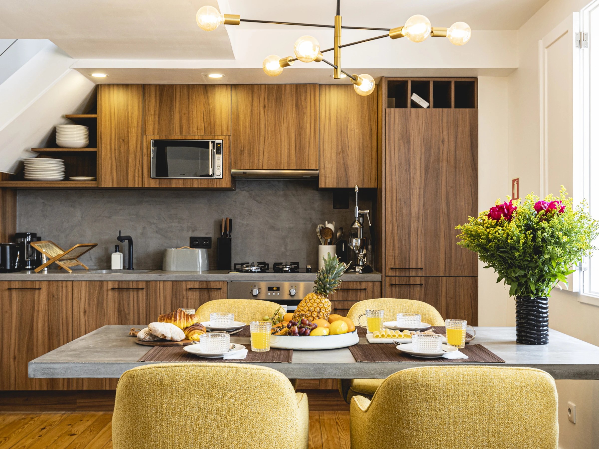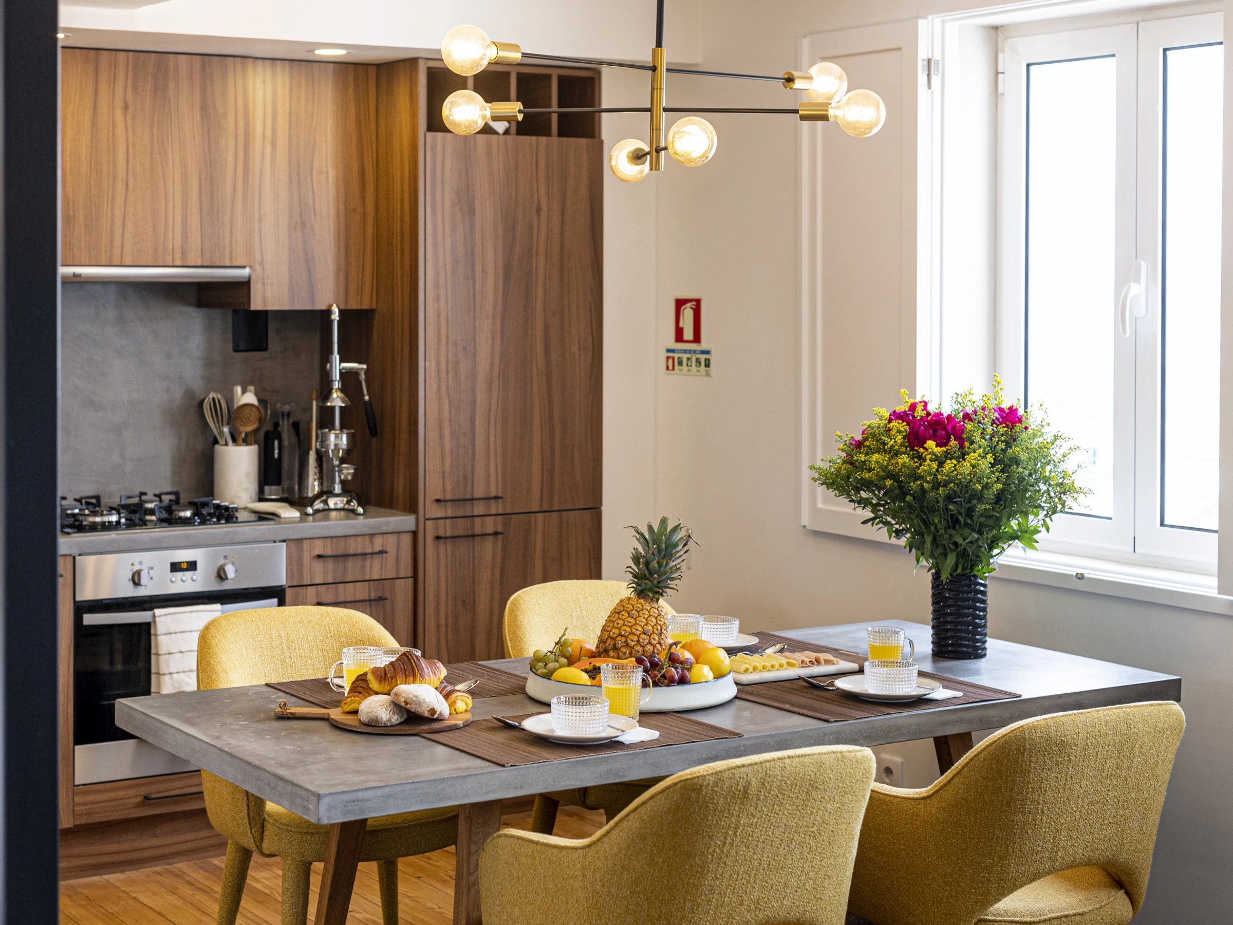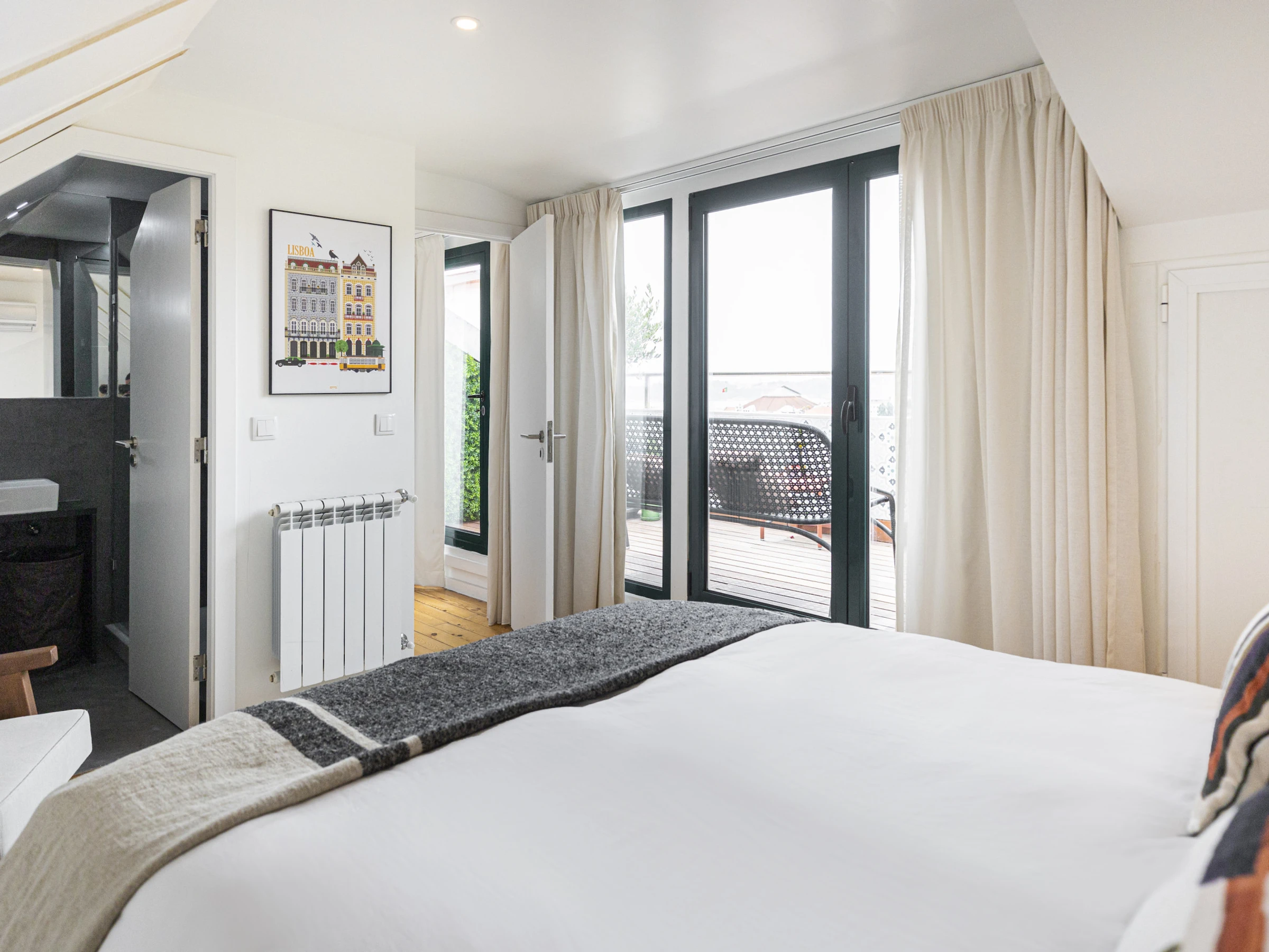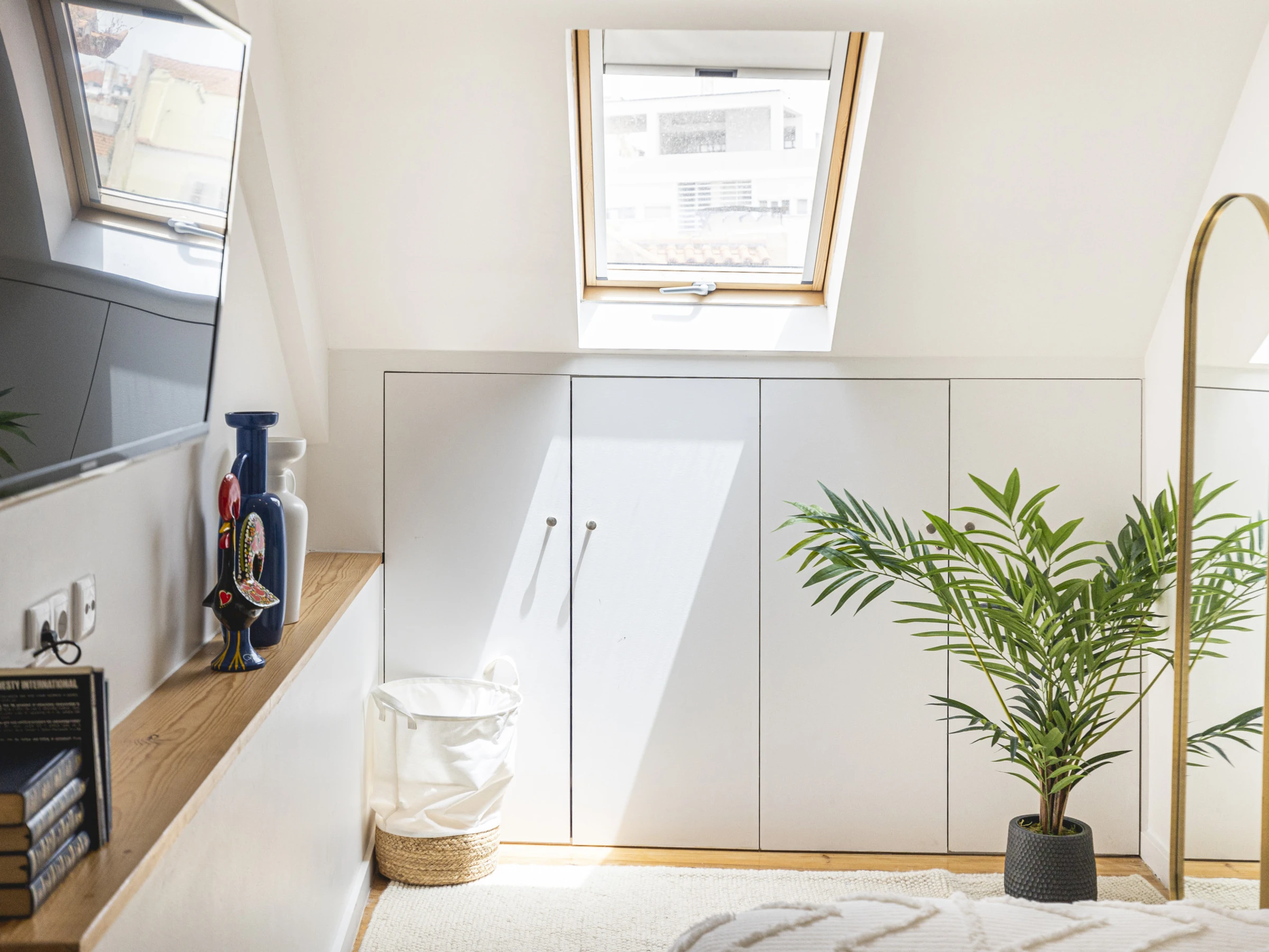 Soft yellow chairs are positioned around the table, adding a cheerful feeling to the apartment. The bathrooms are in keeping the rest of the flat: modern, comfortable and stylish. Different shades of blue tiling are juxtaposed with the white amenities to create a feeling of utter cleanliness. The roof terrace is arguably this flat’s most amazing feature, with a bench for you to sit on and enjoy your morning coffee or an evening sundowner whilst watching the world go past and the sea in the background. This apartment is comfortable, chic and accessible, and offers the most unforgettable spot to explore Lisbon from.