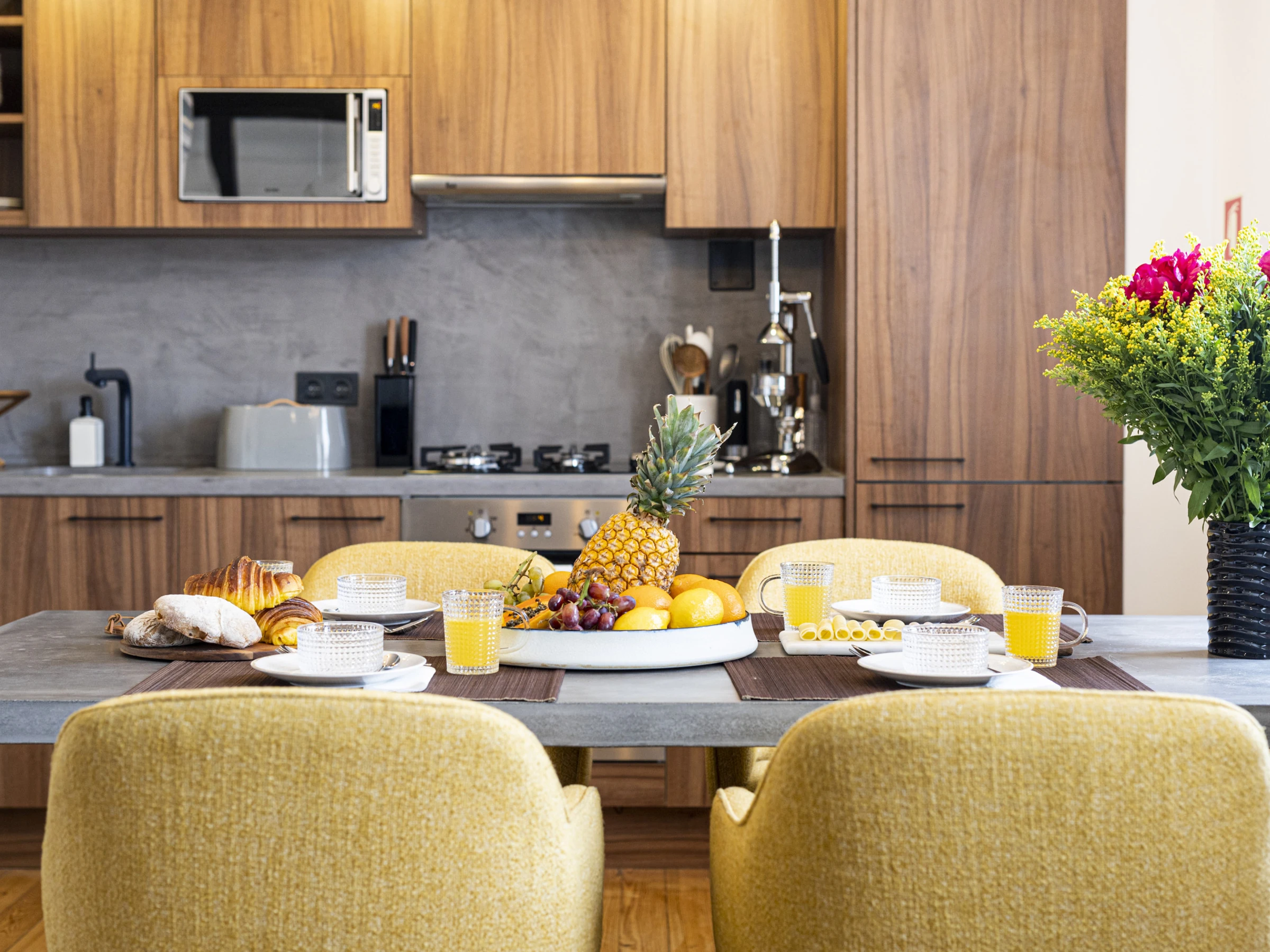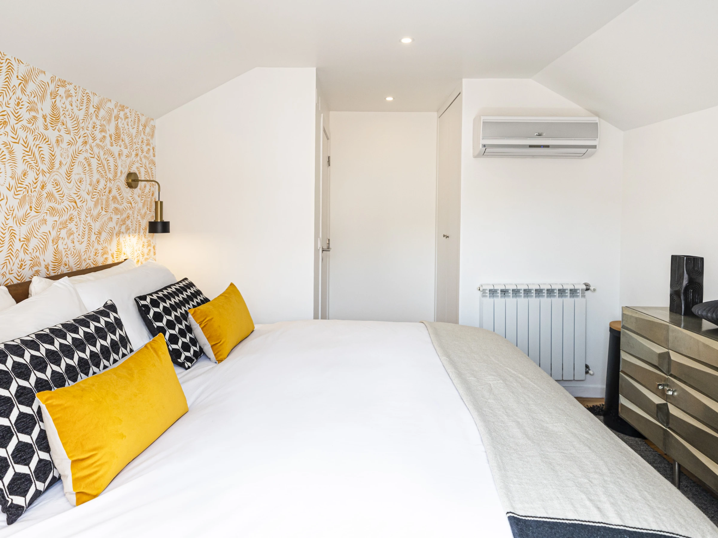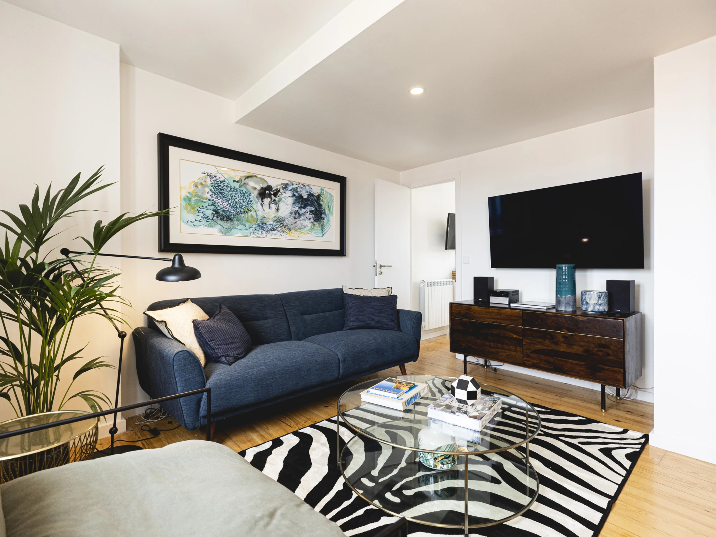 On the ground floor there is one room with a double bed and another with 2 singles. The third bedroom is on the first floor and is a double. The interiors are delightful: with exceptional wall printing in the bedrooms above the beds, carefully chosen bed furnishings to suit the colour scheme of each room and large windows allowing sunlight to filter into the apartment. Full length mirrors, flat screen TVs and modern light fixtures can be found throughout. The living area is chic and inviting, with a zebra print floor rug and spacious navy sofa.