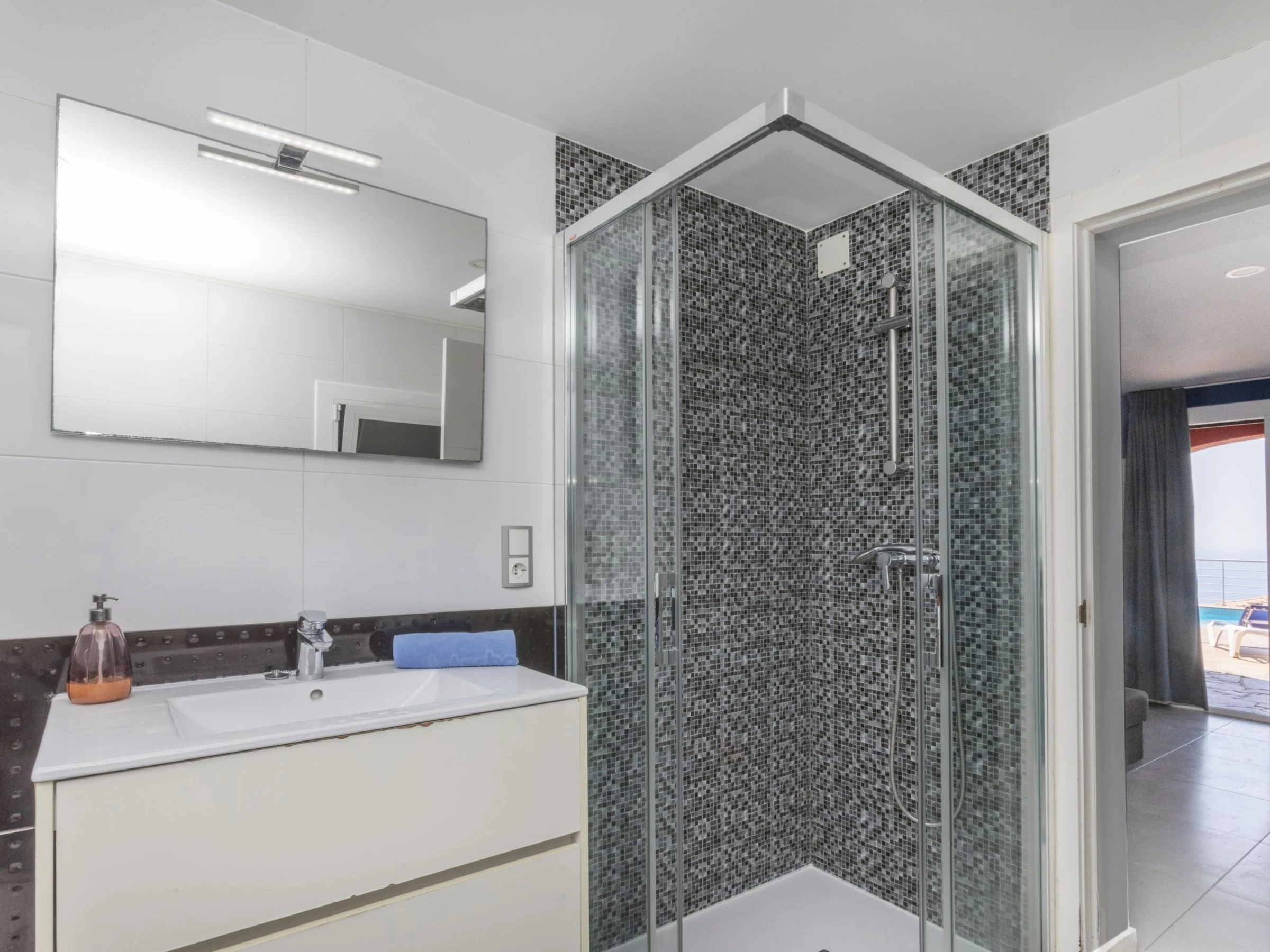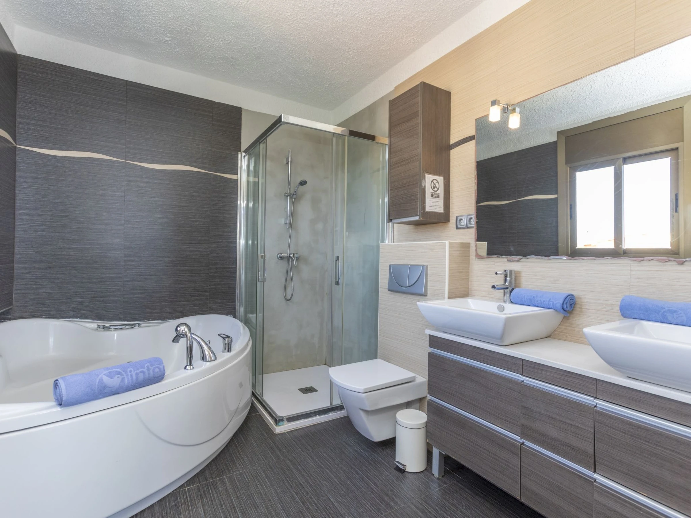 "Solar", maison 5 pièces 160 m2. Séjour/salle à manger. Cuisine ouverte (4 plaques de cuisson, four, lave-vaisselle, grille-pain, bouilloire électrique, micro-ondes, congélateur, cafetière électrique) avec table pour les repas et Télévision numérique. Sortie sur la terrasse. WC séparé. À l'étage inférieur: séjour avec 1 lit pliant (90 cm, longueur 190 cm), Télévision numérique et air-conditionné. Sortie sur la terrasse, sur la piscine. 1 chambre double avec 1 grand-lit (150 cm, longueur 190 cm). Sortie sur la terrasse, sur la piscine. 1 chambre double avec 1 grand-lit (135 cm, longueur 190 cm). Douche/WC. À l'étage supérieur: 1 chambre double avec 1 grand-lit (150 cm, longueur 190 cm), bain/douche et air-conditionné. 1 chambre double avec 1 grand-lit (150 cm, longueur 190 cm), douche/WC et air-conditionné. Meubles de terrasse, barbecue, chaises longues, loggia. Vue panoramique sur la mer. A disposition: lave-linge, fer à repasser, sèche-cheveux. Internet (Connexion WIFI, gratuit). Garage (1 Voiture). [hidden]