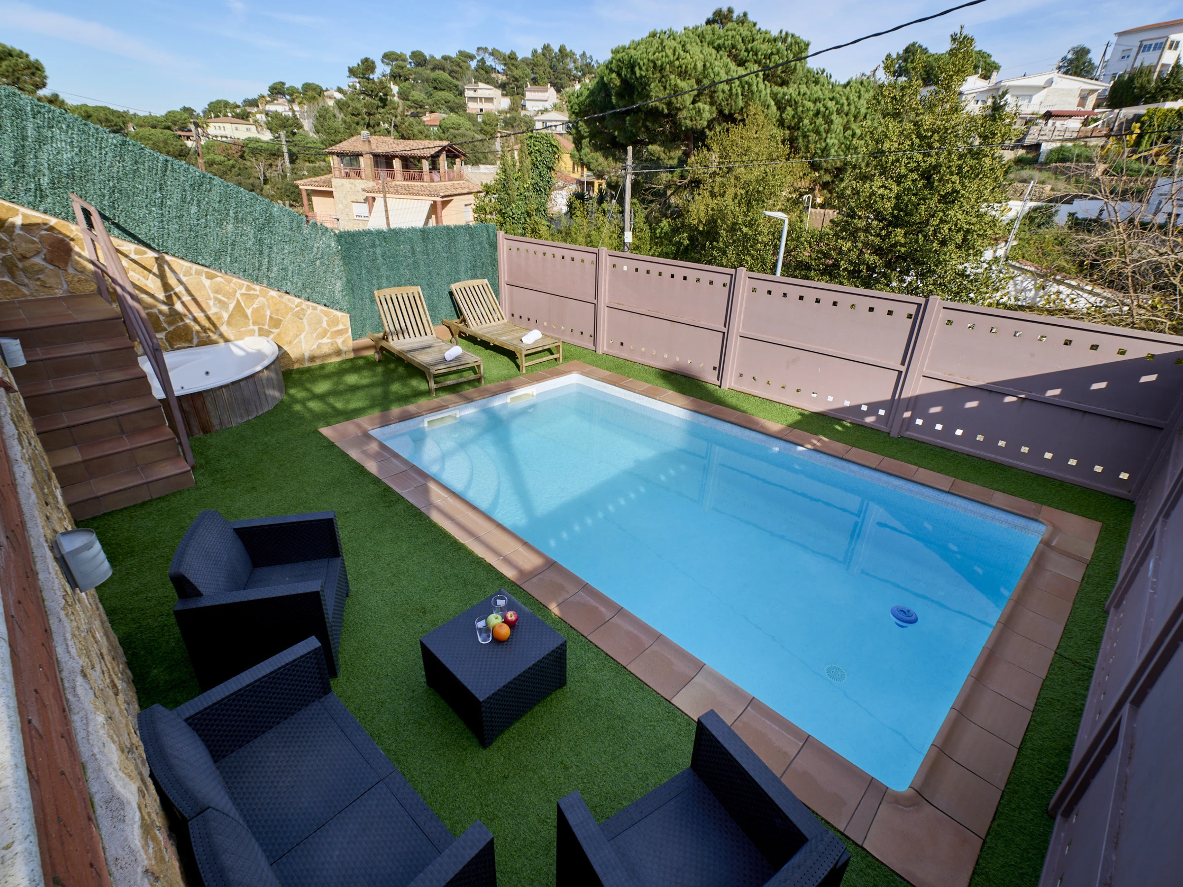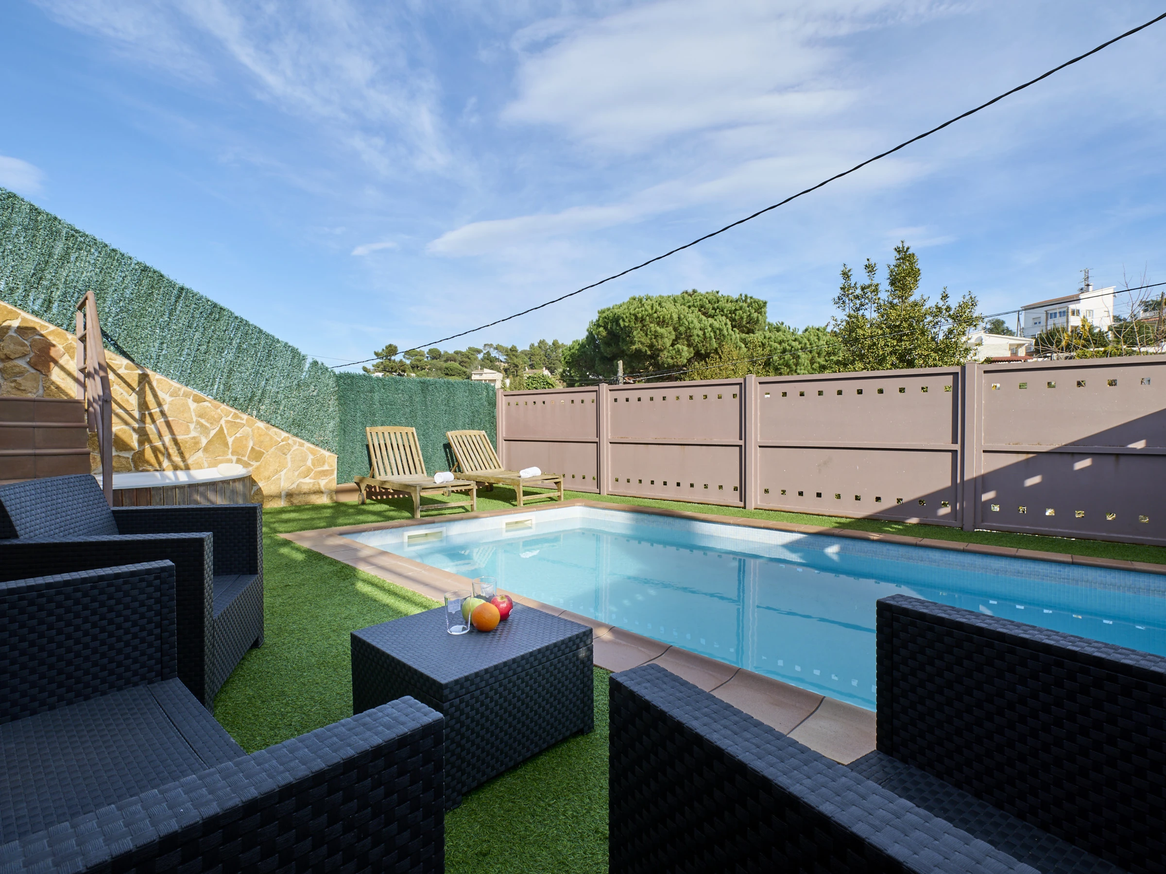 Espace extérieur avec piscine privée (6x3,5m) entourée de terrasses.