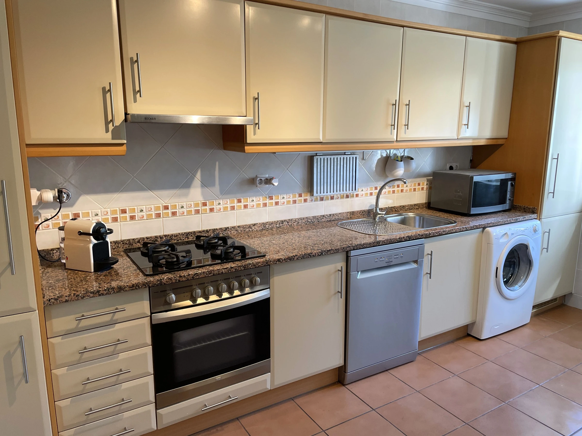 La cuisine indépendante, à gaz, est équipée avec réfrigérateur, micro-ondes, four, congélateur, lave-vaisselle, vaisselle/couverts, ustensiles/cuisine, cafetière, friteuse, grille pain, bouilloire, presse-agrumes et cuisinière.