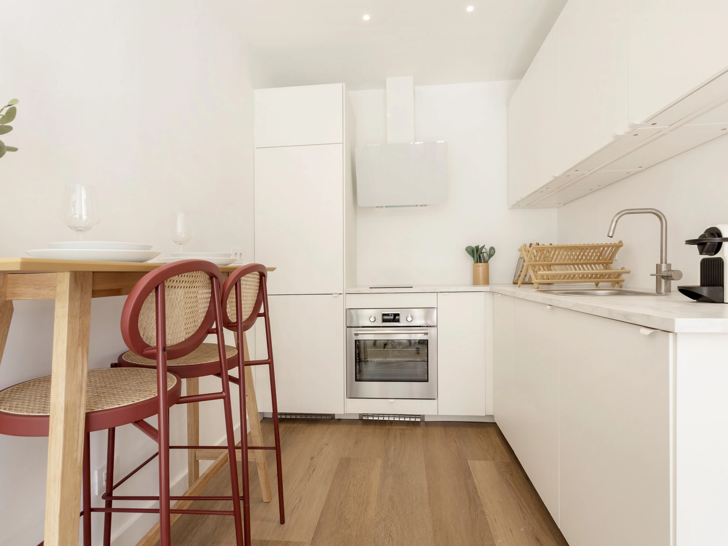 La cuisine, est équipée avec réfrigérateur, micro-ondes, four, congélateur, lave-vaisselle, vaisselle/couverts, cafetière, grille pain et presse-agrumes.