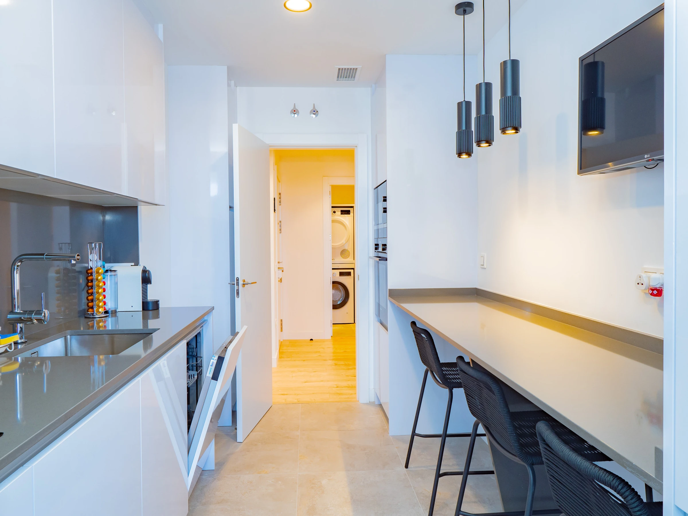 L'appartement dispose d'une cuisine indépendante entièrement équipée avec des appareils électroménagers modernes tels que réfrigérateur, micro-ondes, four, lave-vaisselle, cafetière et plus encore, parfaite pour préparer vos plats préférés. Le salon-salle à manger est spacieux et lumineux, équipé d'une Smart TV pour le divertissement en streaming, et s'ouvre sur une terrasse de 12 m² où vous pourrez profiter du lever du soleil sur la ville. De plus, il dispose d'un lave-linge, sèche-linge, fer à repasser, chauffage central et climatisation dans tout l'espace pour votre confort pendant toute l'année.