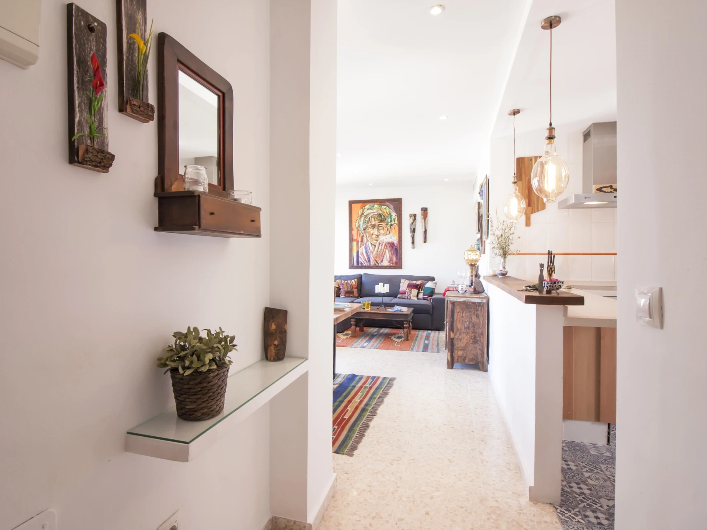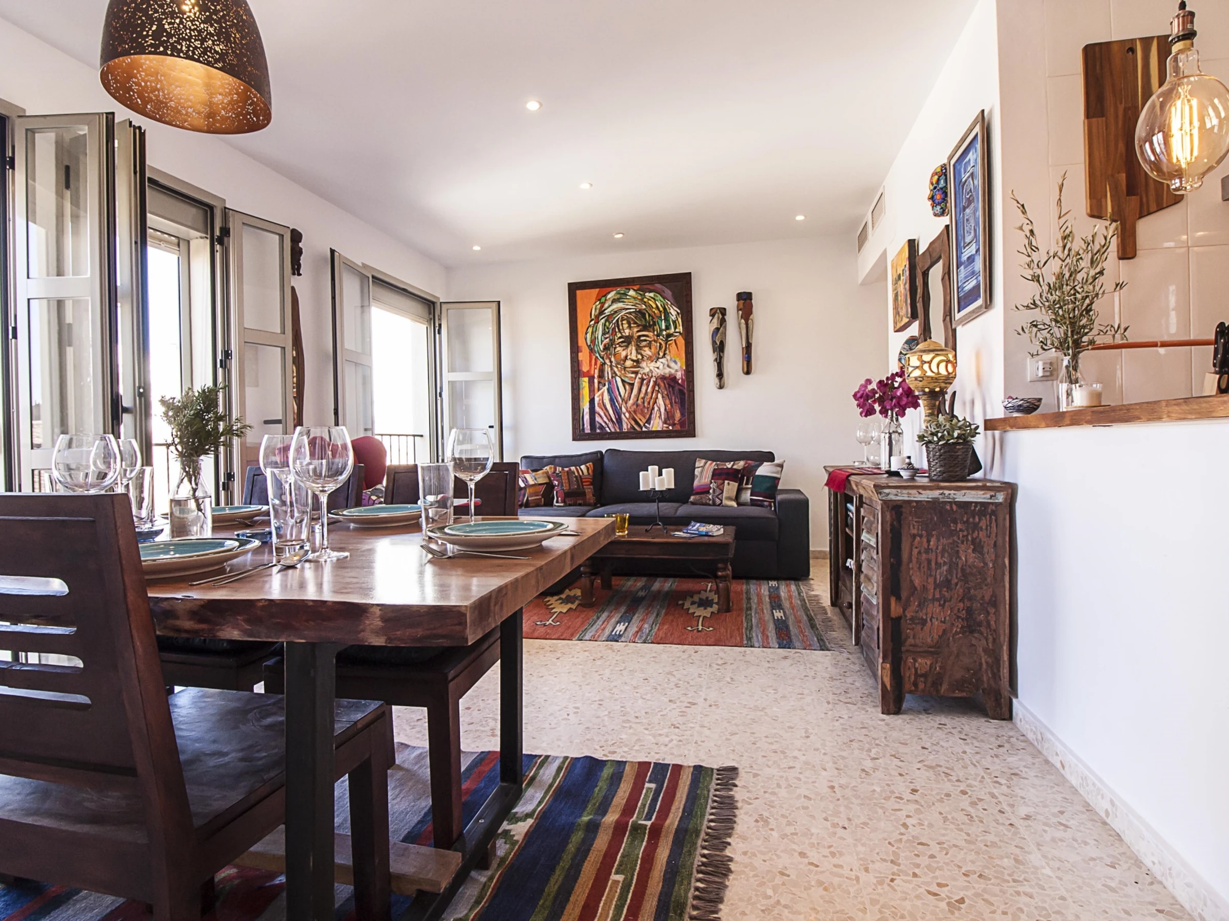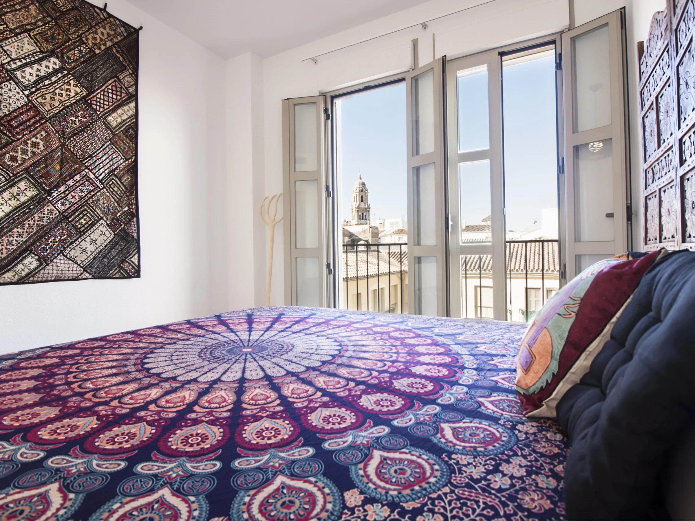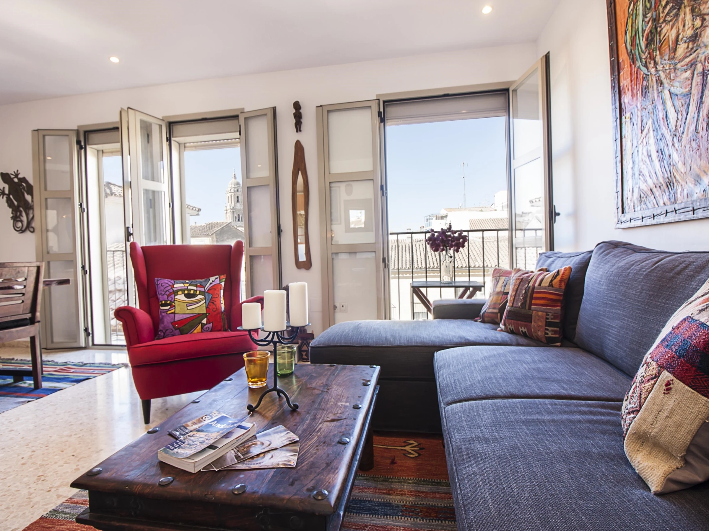 Luminoso apartamento con decoración étnica, de dos dormitorios con camas extra grandes, recién reformado, con vistas a la Catedral de Málaga, en pleno centro peatonal.