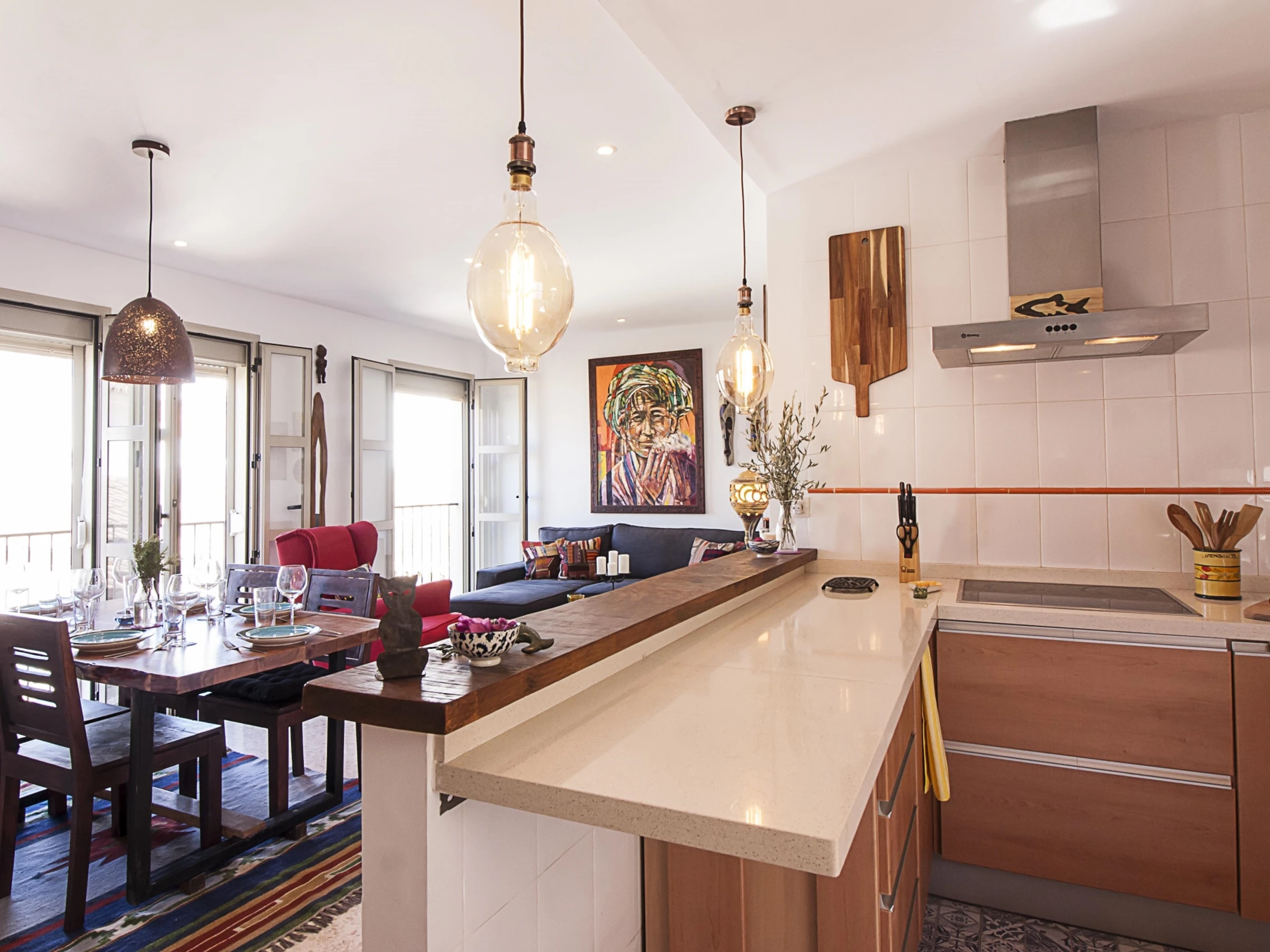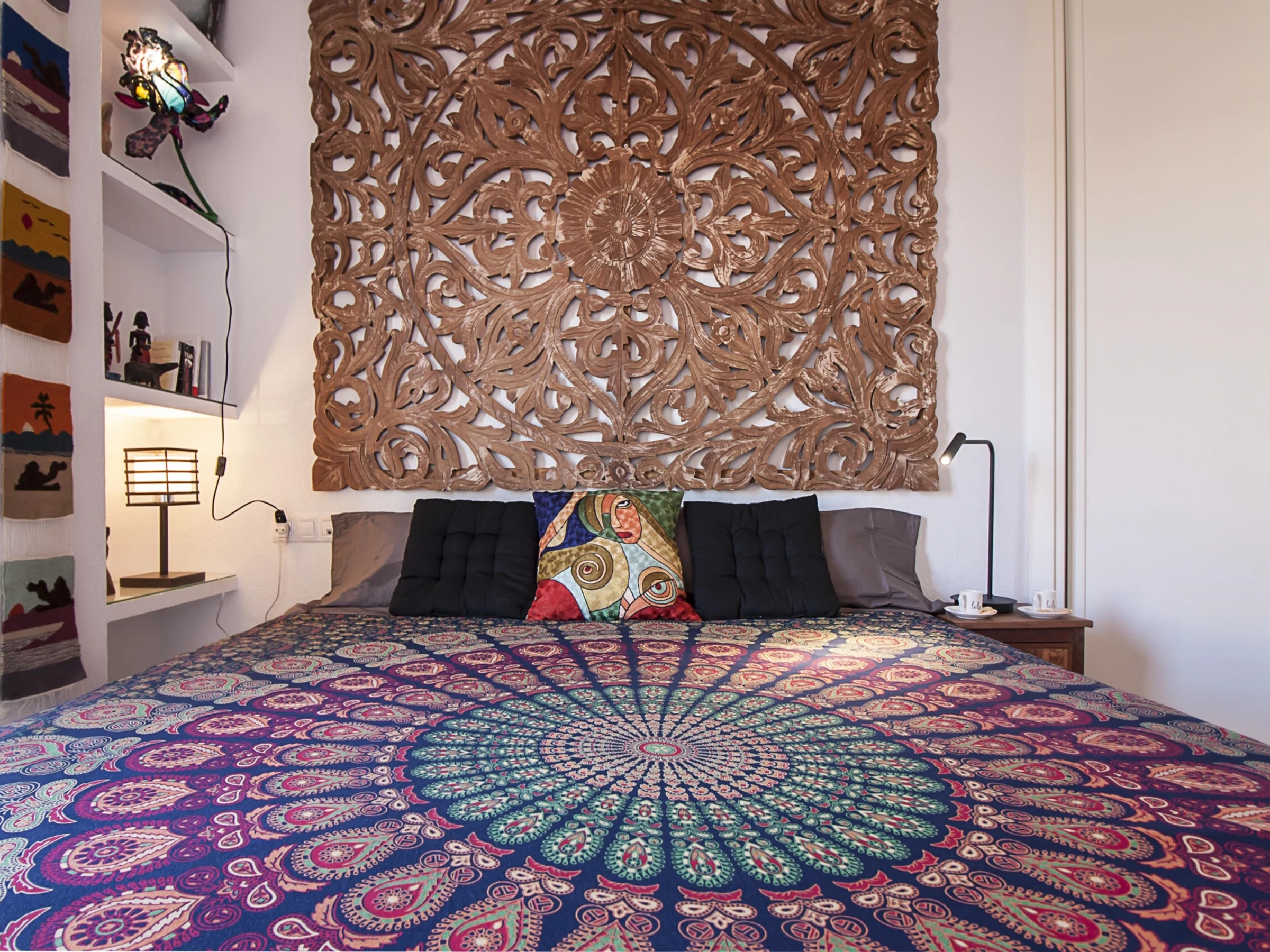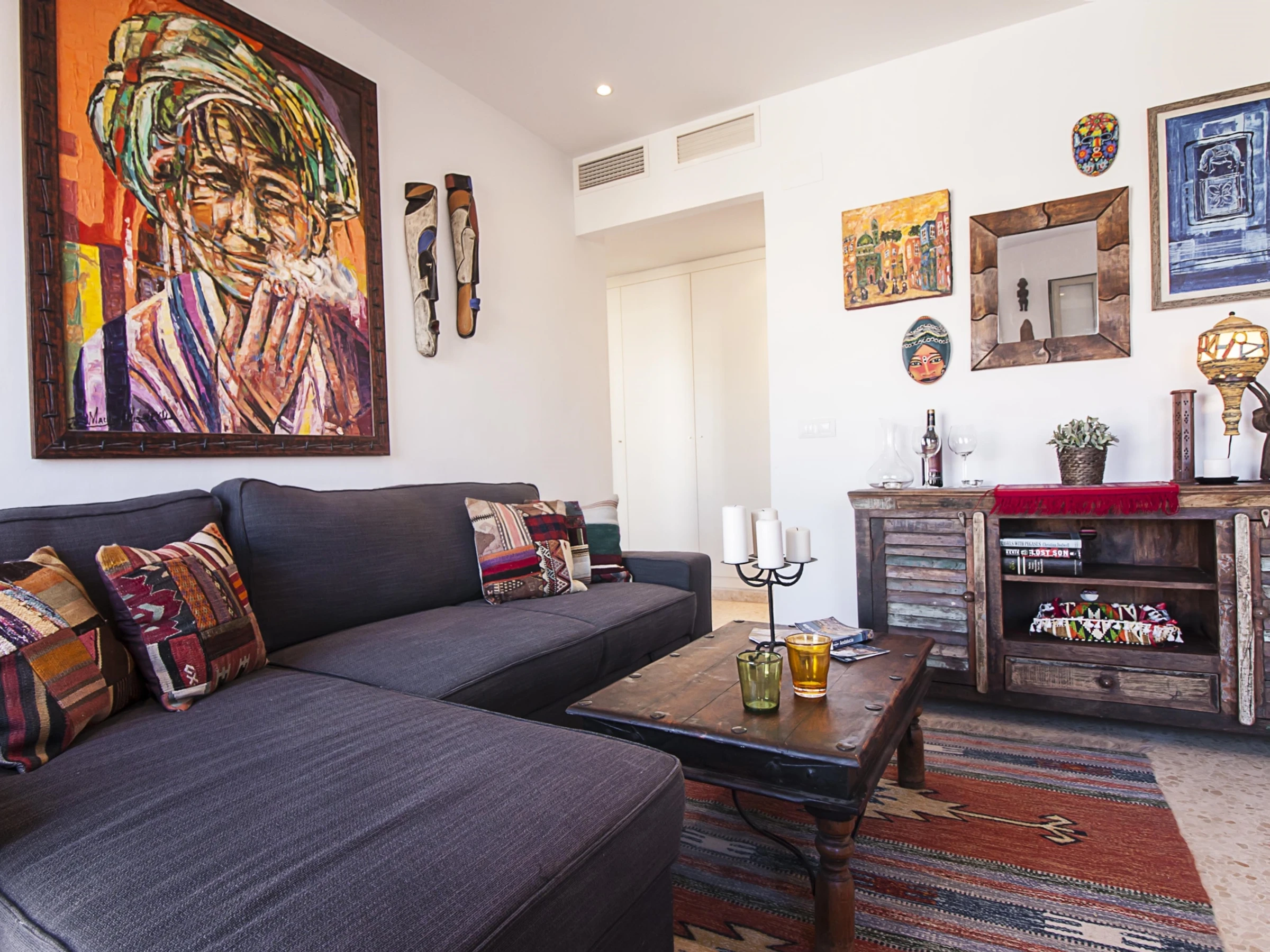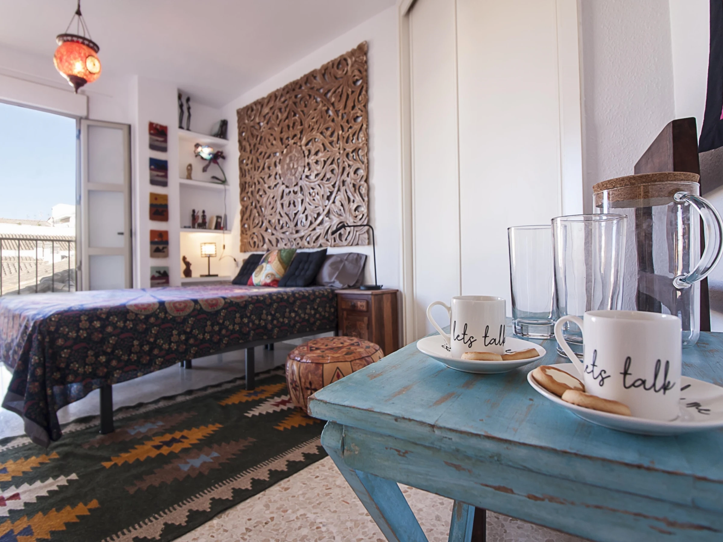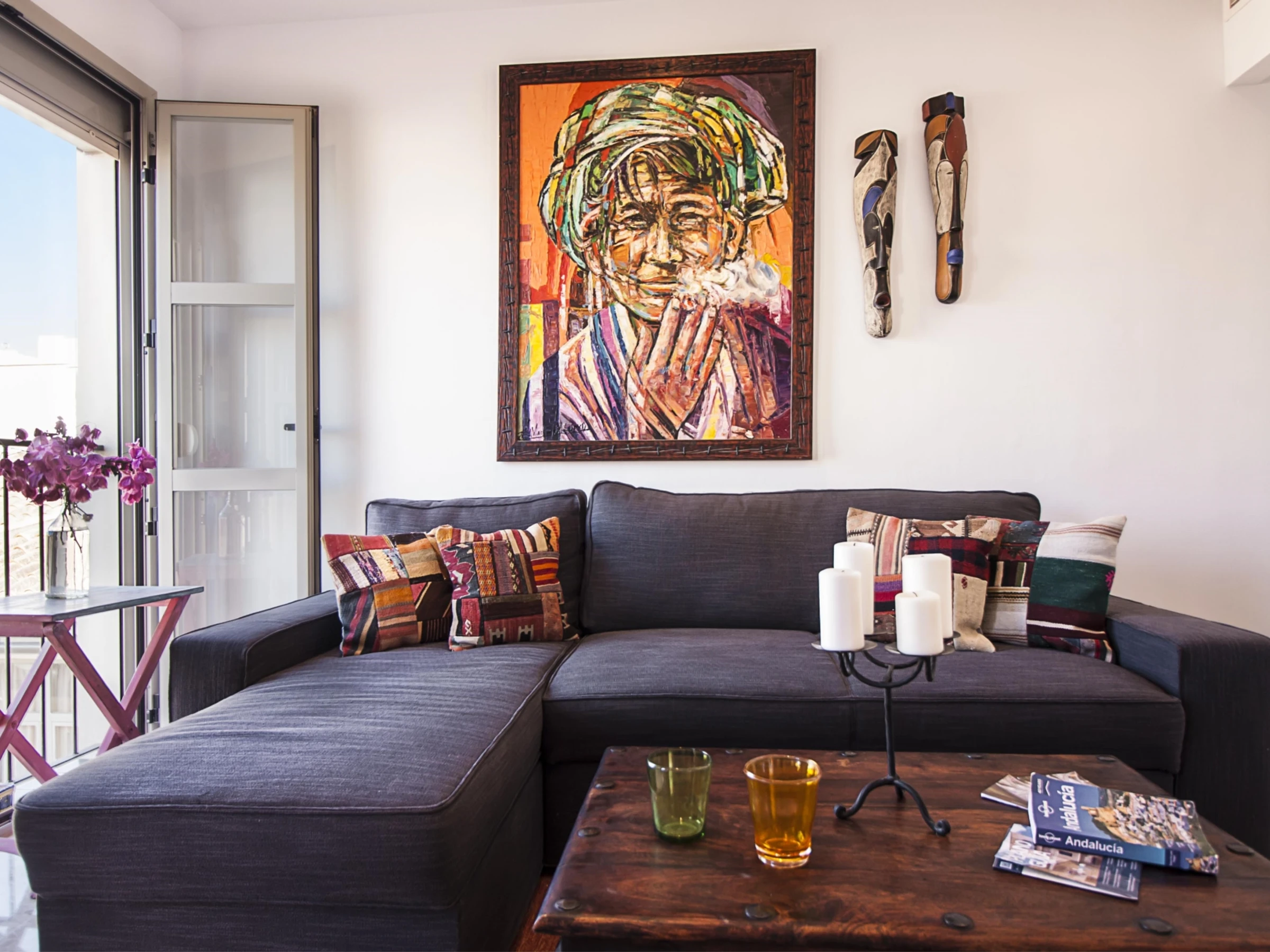 Luminoso apartamento con decoración étnica, de dos dormitorios con camas extra grandes, recién reformado, con vistas a la Catedral de Málaga, en pleno centro peatonal.