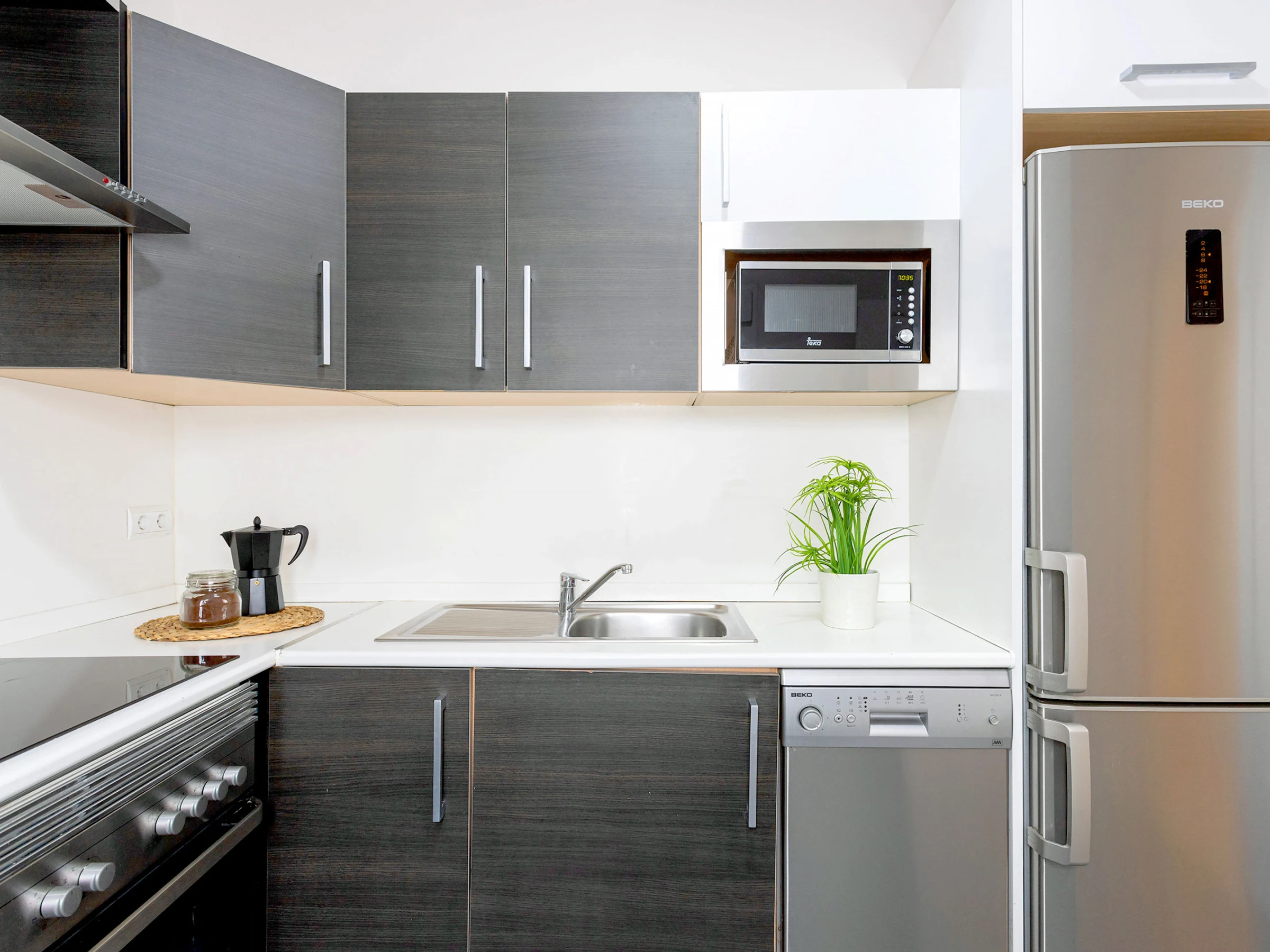 La cuisine, est équipée avec réfrigérateur, micro-ondes, four, congélateur, lave-vaisselle, vaisselle/couverts, cafetière et grille pain.