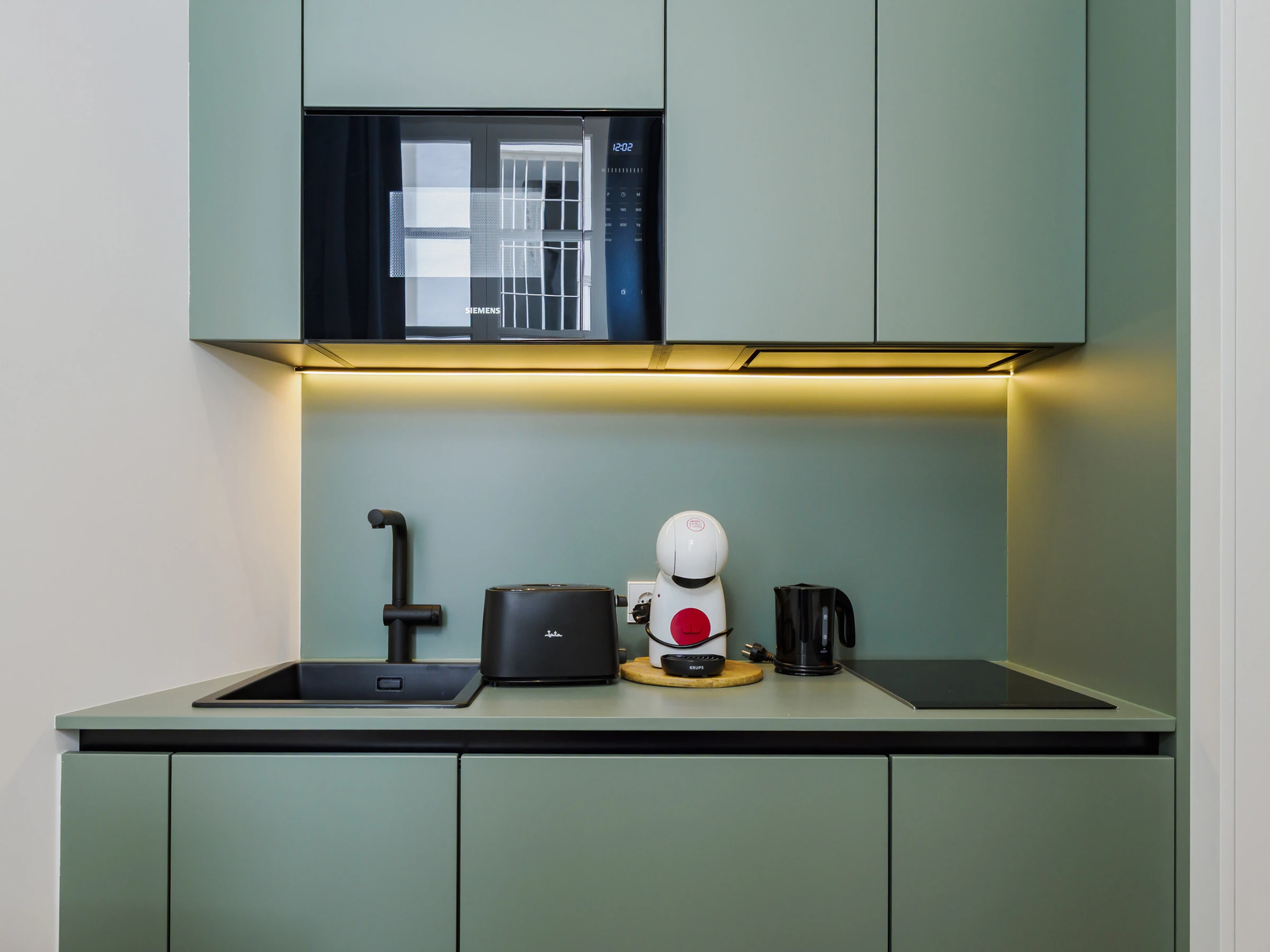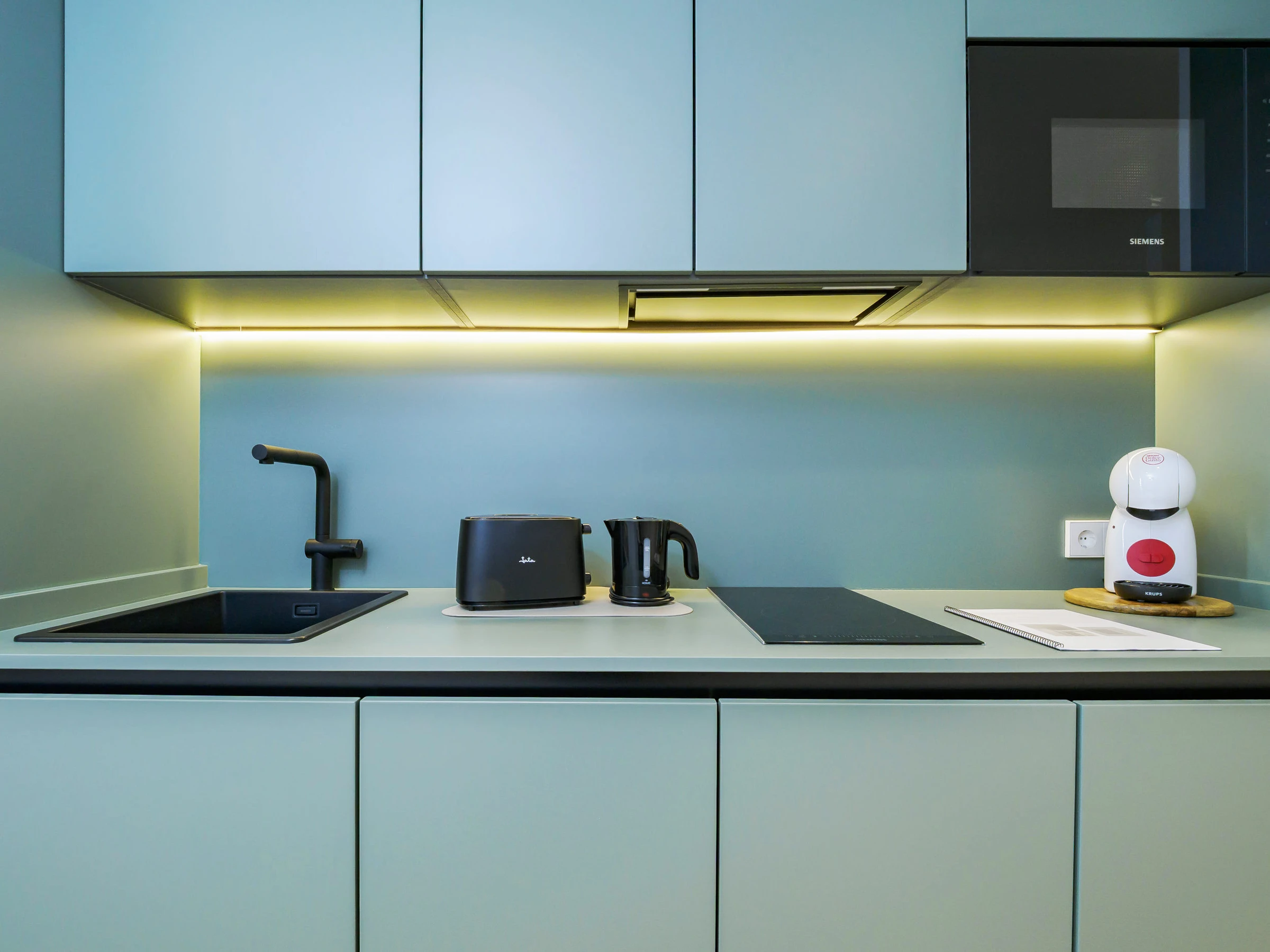 - Cuisine américaine équipée de vitrocéramique, réfrigérateur, micro-ondes, cafetière, grille-pain et vaisselle complète. Ne dispose pas de four ni de lave-vaisselle.
