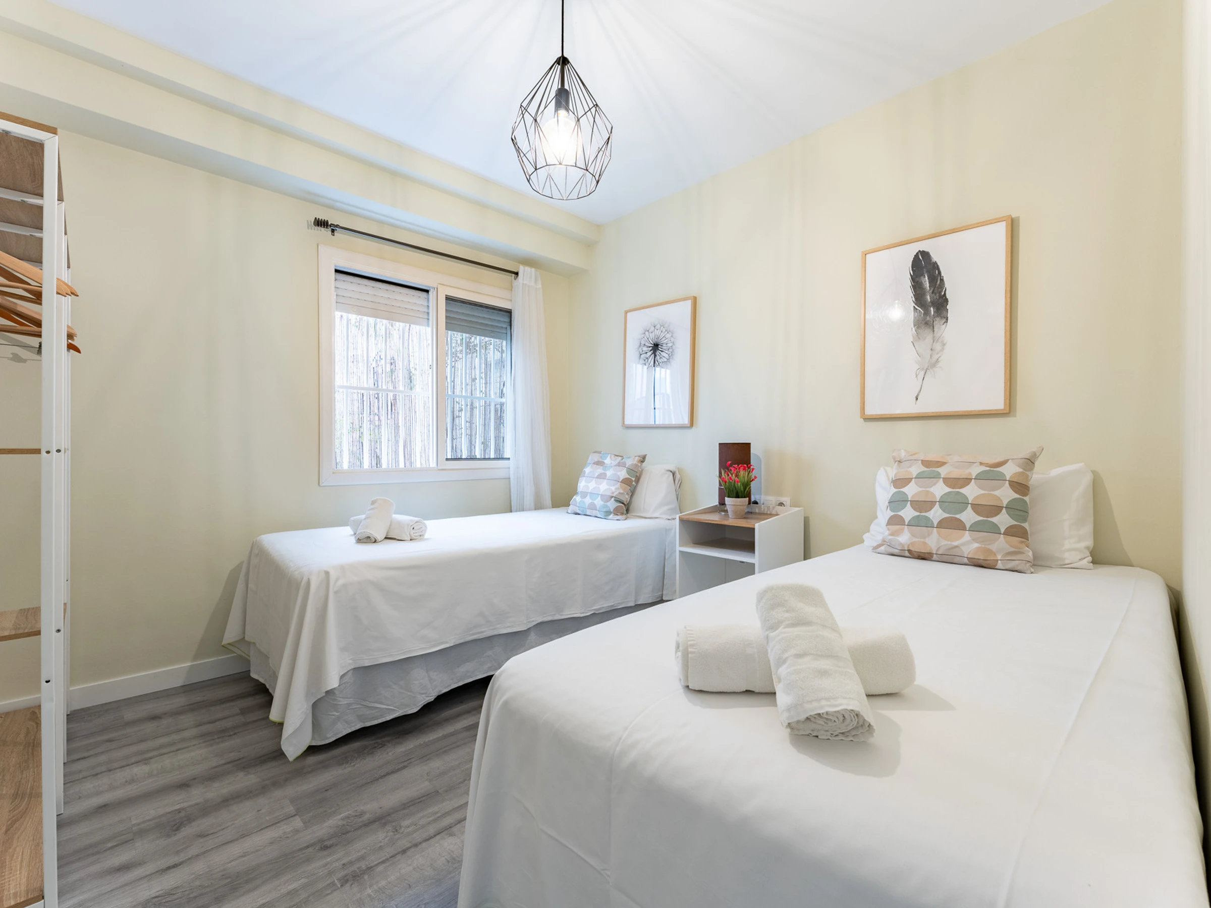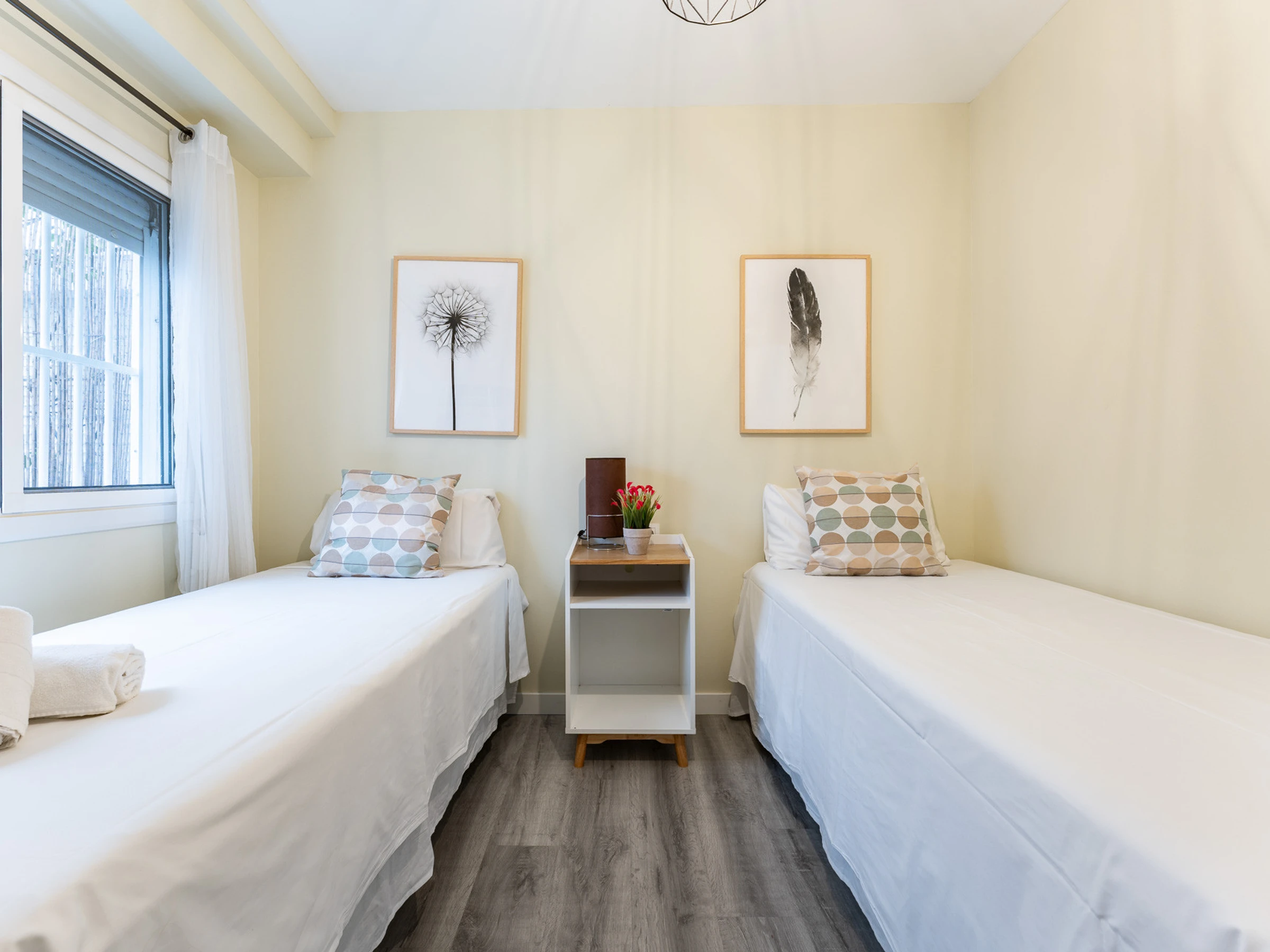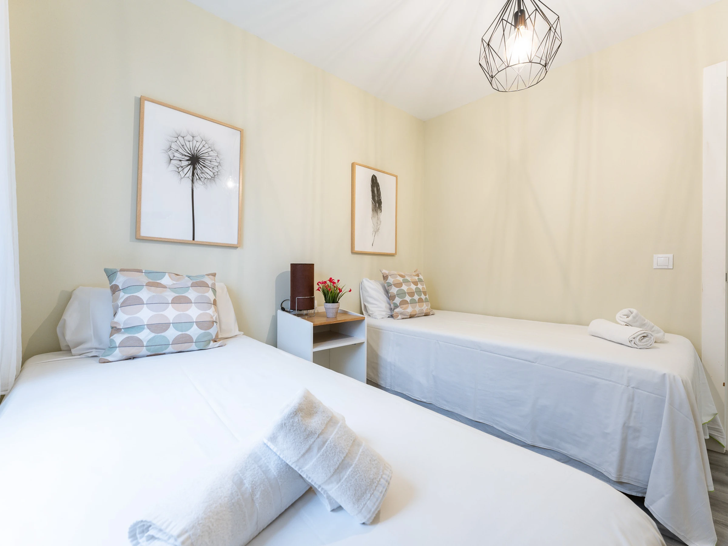 Dispose de deux chambres : une avec deux lits simples et une autre avec un lit double, spacieuse, lumineuse et dotée de placards pour ranger les bagages. La salle de bain, située dans le couloir, est équipée d'un receveur de douche.
