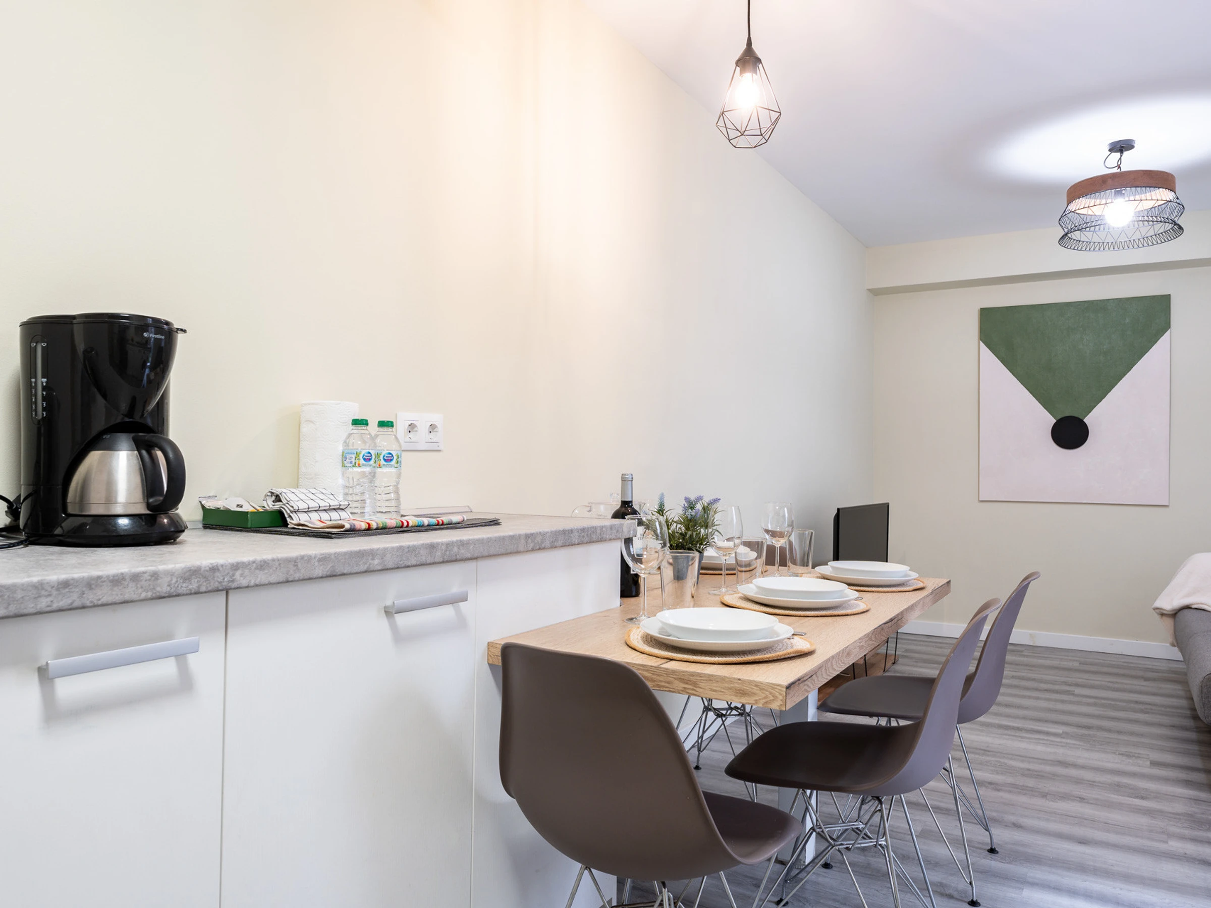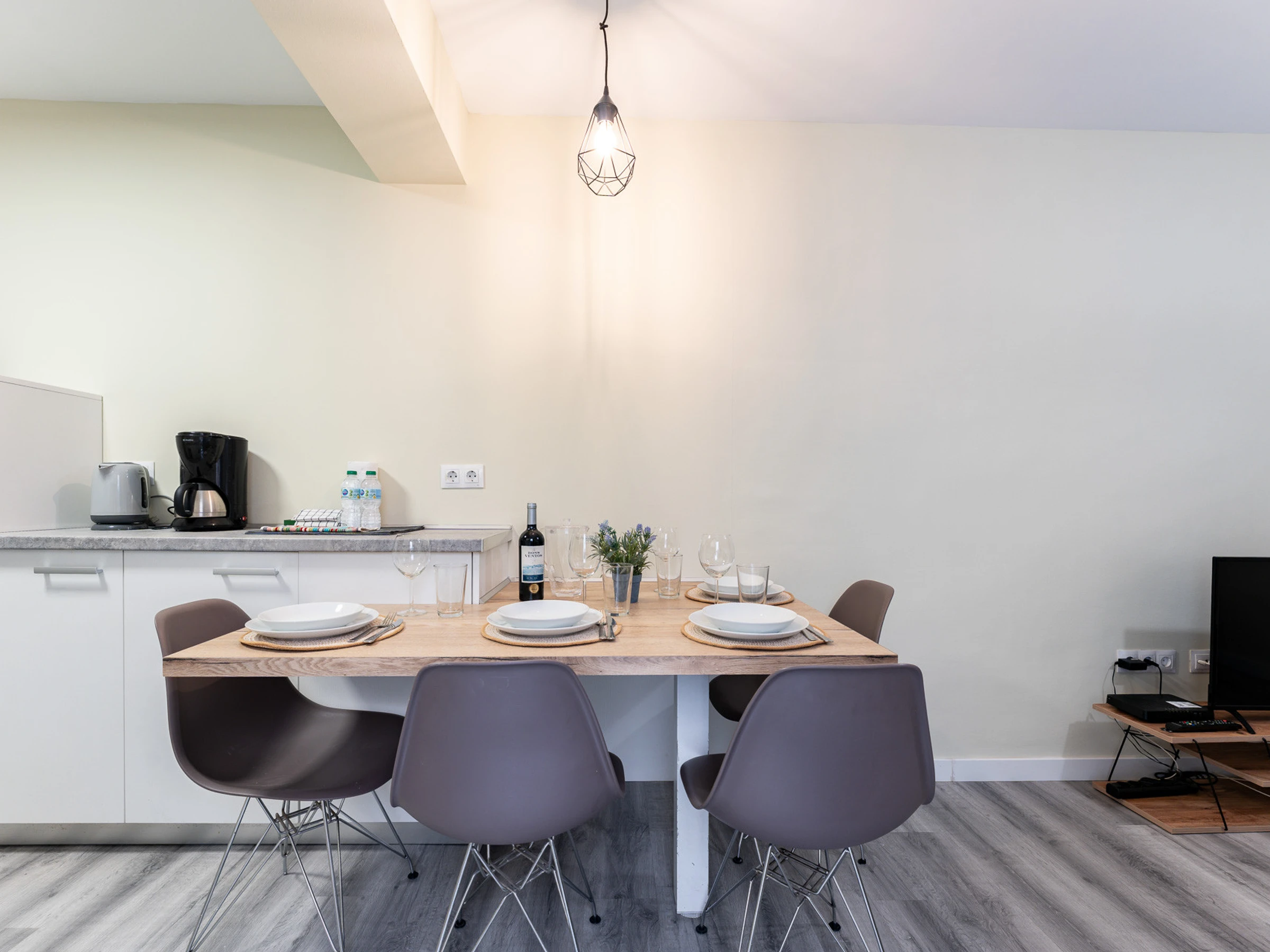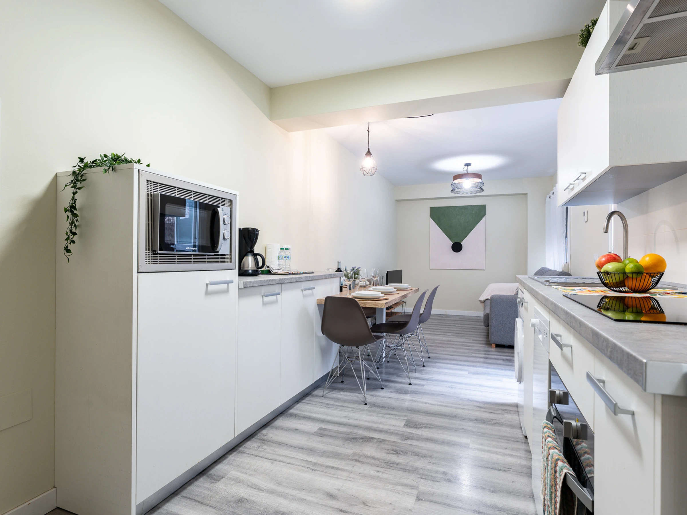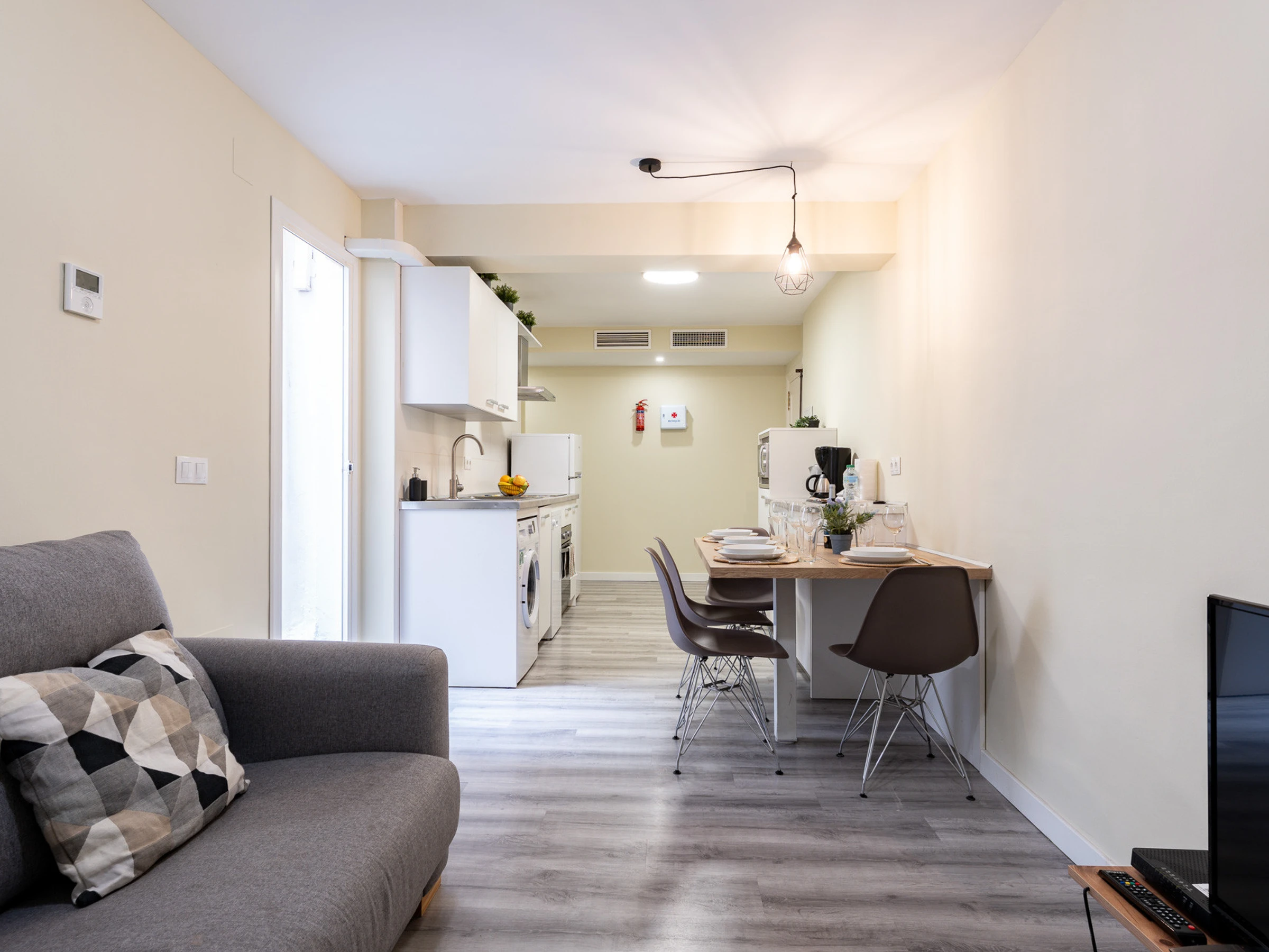 Le logement dispose d'un salon-cuisine de concept ouvert, spacieux et lumineux, entièrement équipé, y compris un bar américain. Dans l'espace de vie, vous trouverez un canapé confortable et une Smart TV pour vos moments de détente.