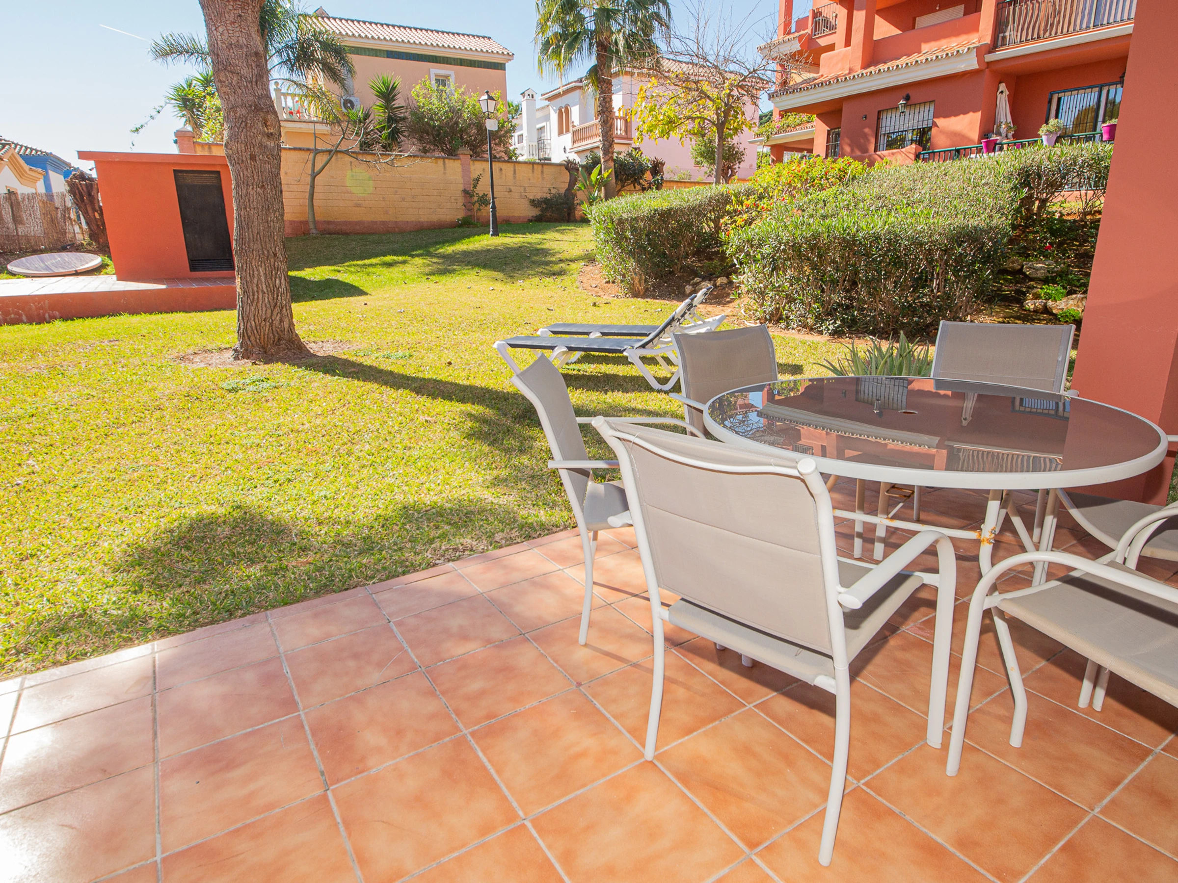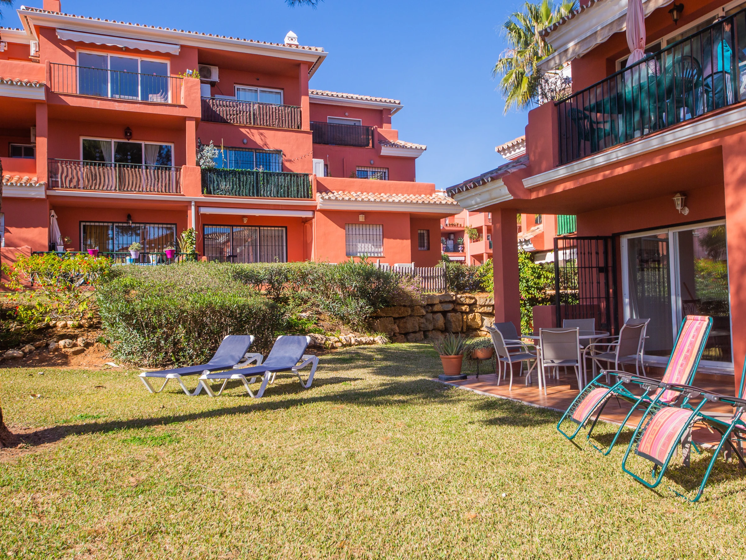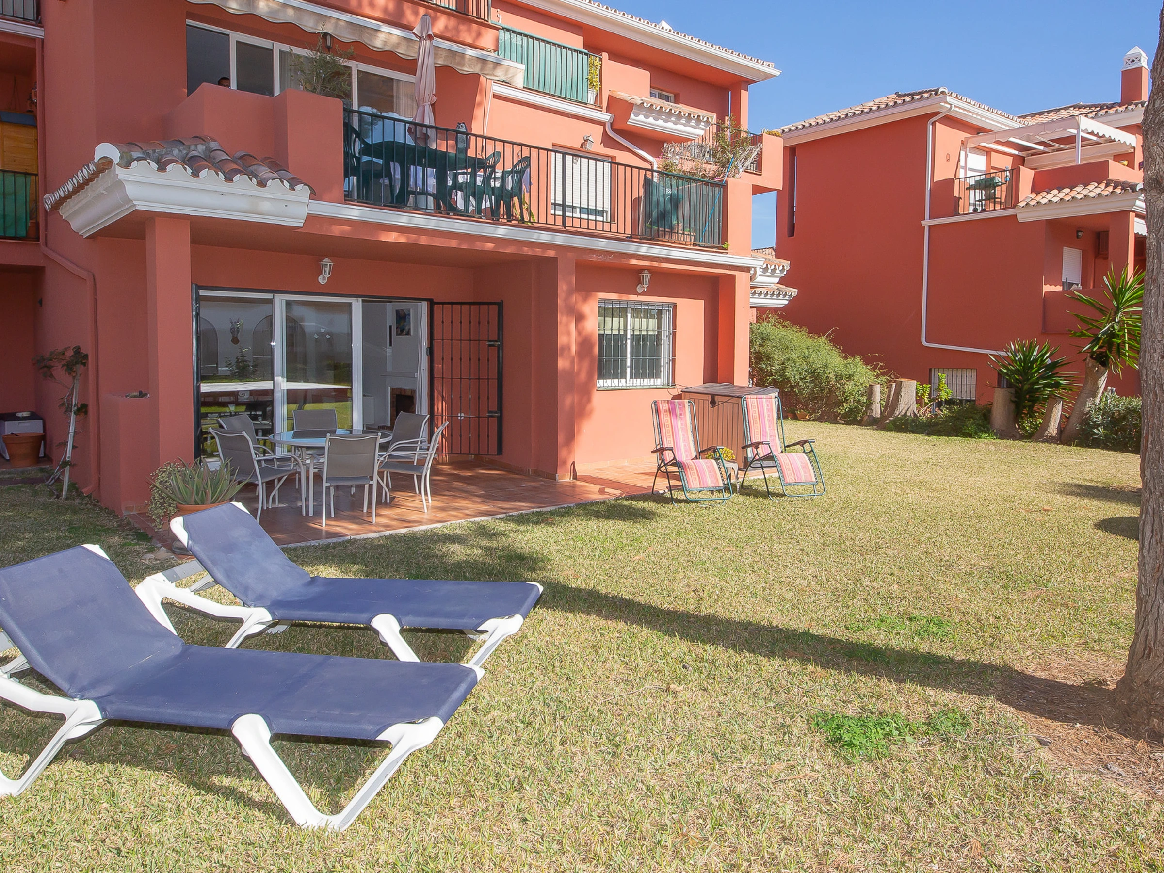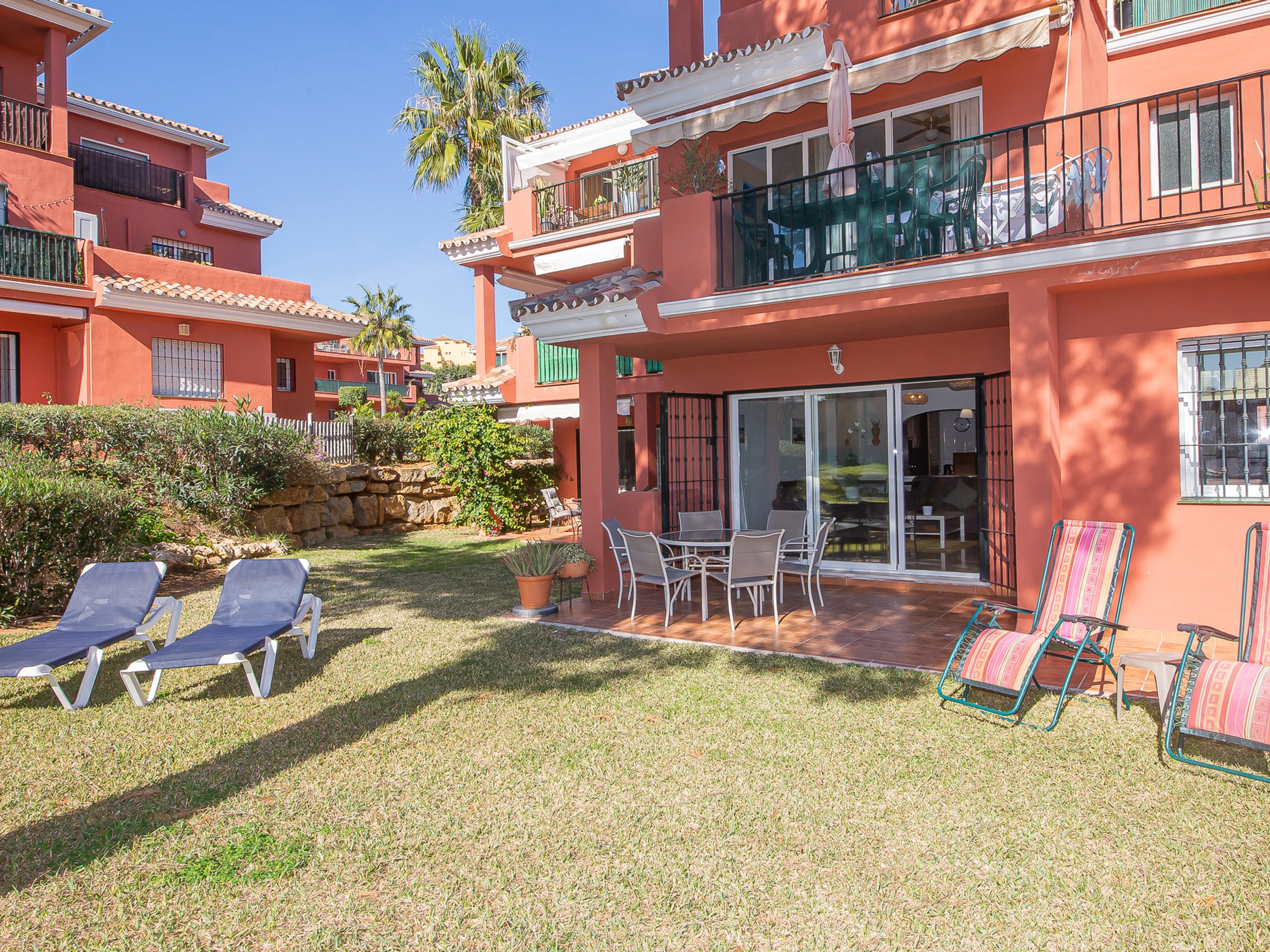 Appartement de trois chambres et deux salles de bains au rez-de-chaussée dans les jardins de Manilva. L'appartement est entièrement climatisé et dispose de sa propre connexion WiFi, d'une cuisine entièrement équipée et d'une grande terrasse orientée sud-ouest, idéale pour bronzer. La terrasse est meublée d'une table et de six chaises, de chaises longues et a un accès direct aux jardins communaux.
