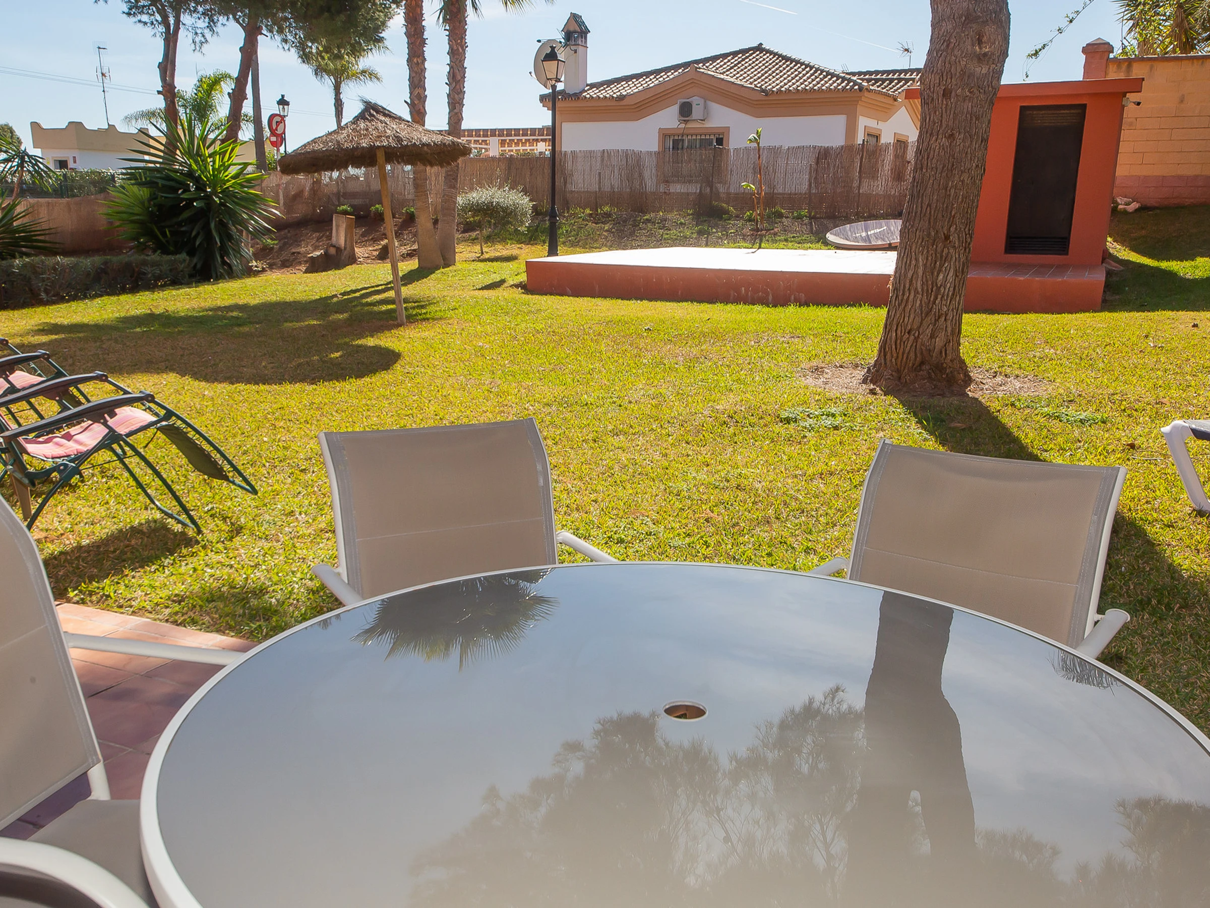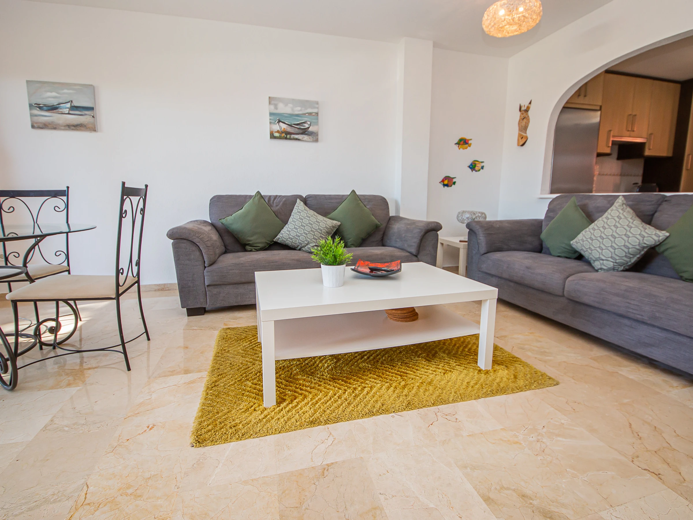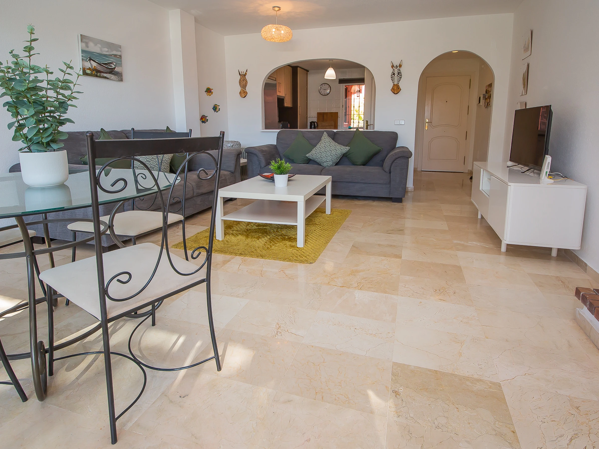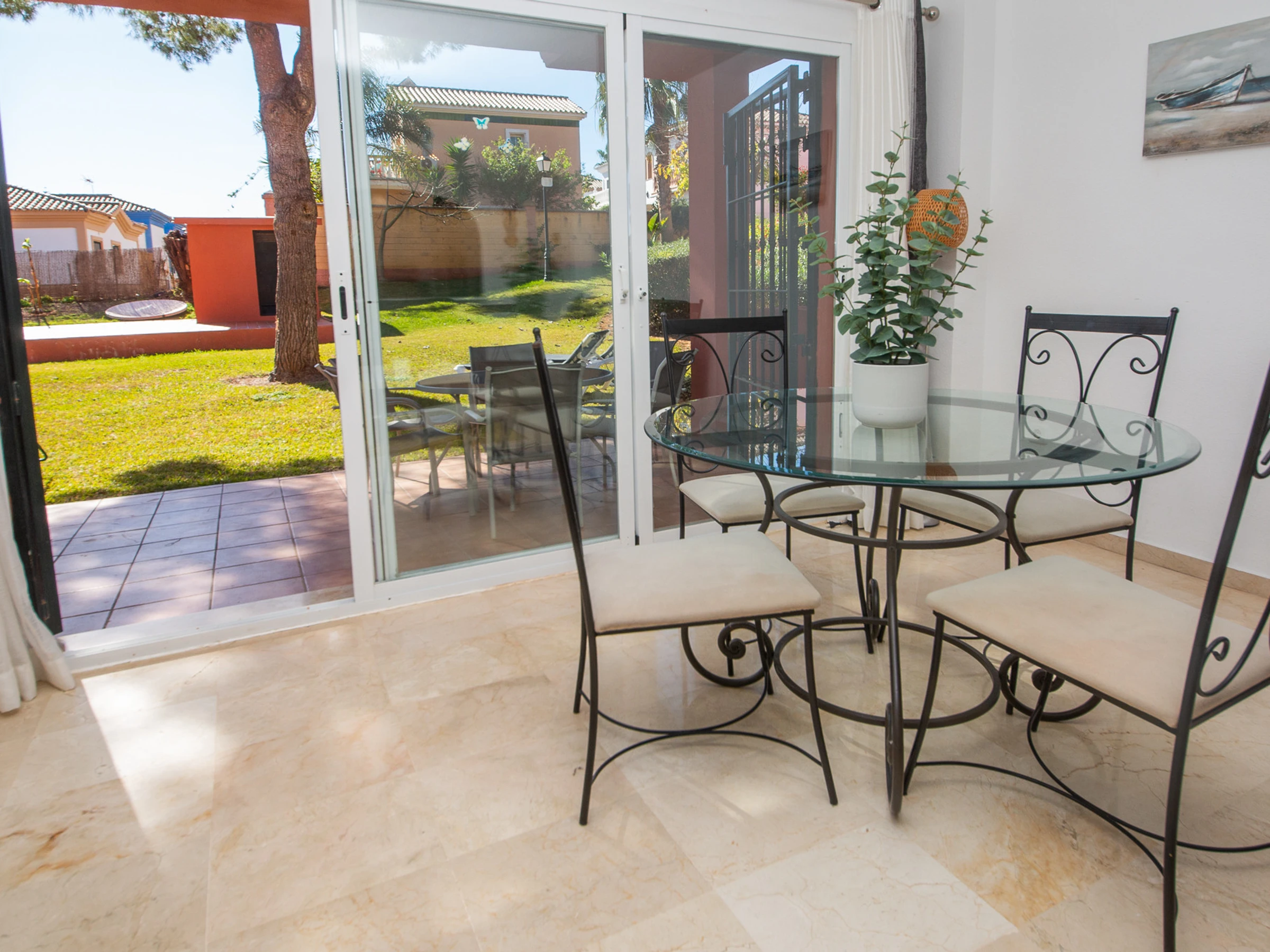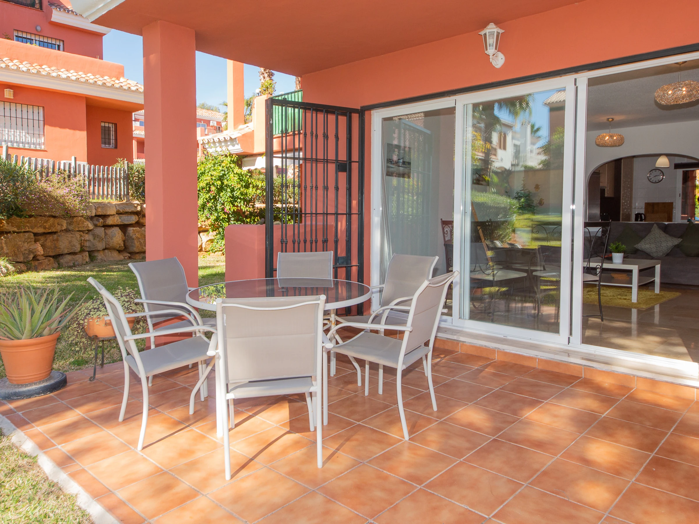 Appartement de trois chambres et deux salles de bains au rez-de-chaussée dans les jardins de Manilva. L'appartement est entièrement climatisé et dispose de sa propre connexion WiFi, d'une cuisine entièrement équipée et d'une grande terrasse orientée sud-ouest, idéale pour bronzer. La terrasse est meublée d'une table et de six chaises, de chaises longues et a un accès direct aux jardins communaux.