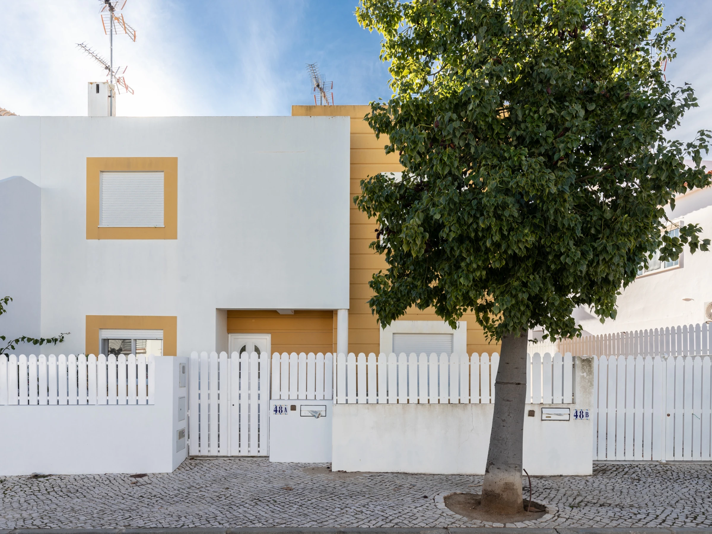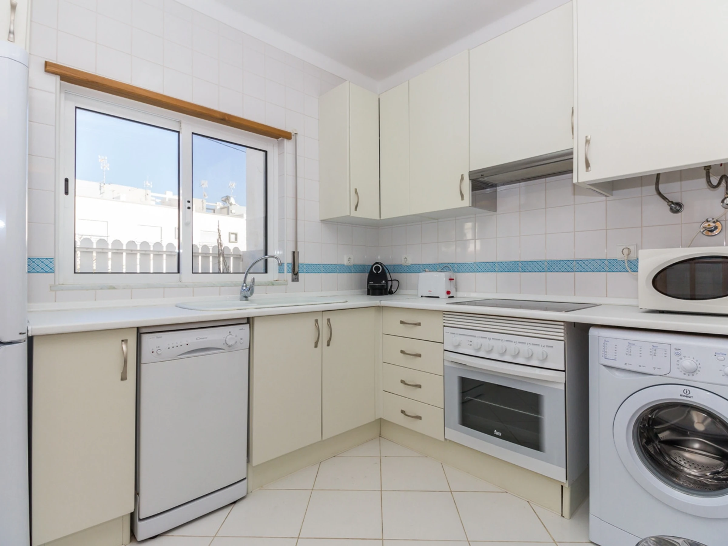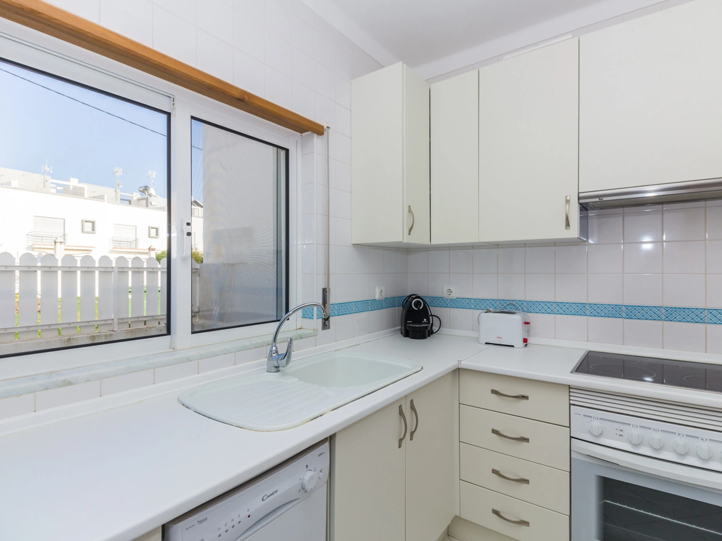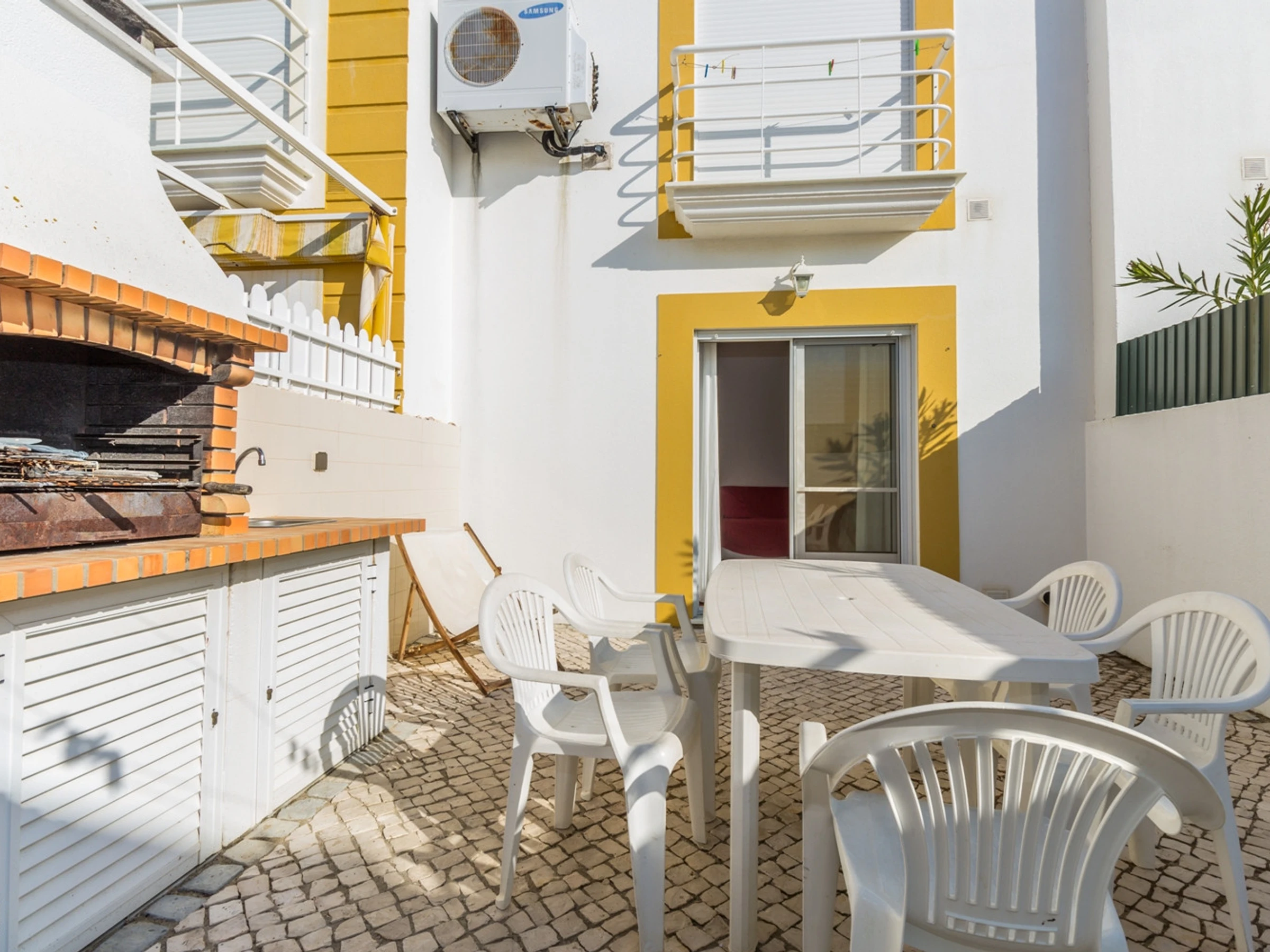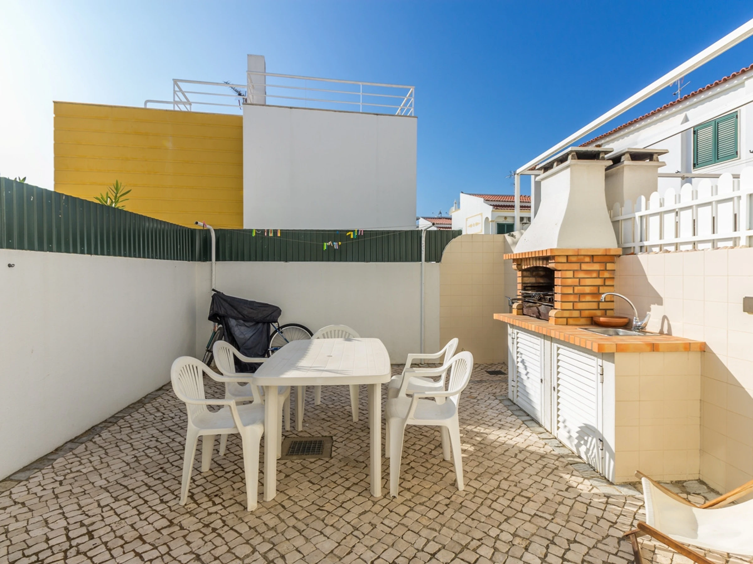 Rez-de-chaussée : hall d'entrée avec buanderie, cuisine équipée, salle de bains et salon/salle à manger donnant sur une magnifique cour orientée à l'ouest avec barbecue, évier, douche extérieure, table et chaises, idéale pour faire des barbecues et profiter du soleil de l'Algarve.