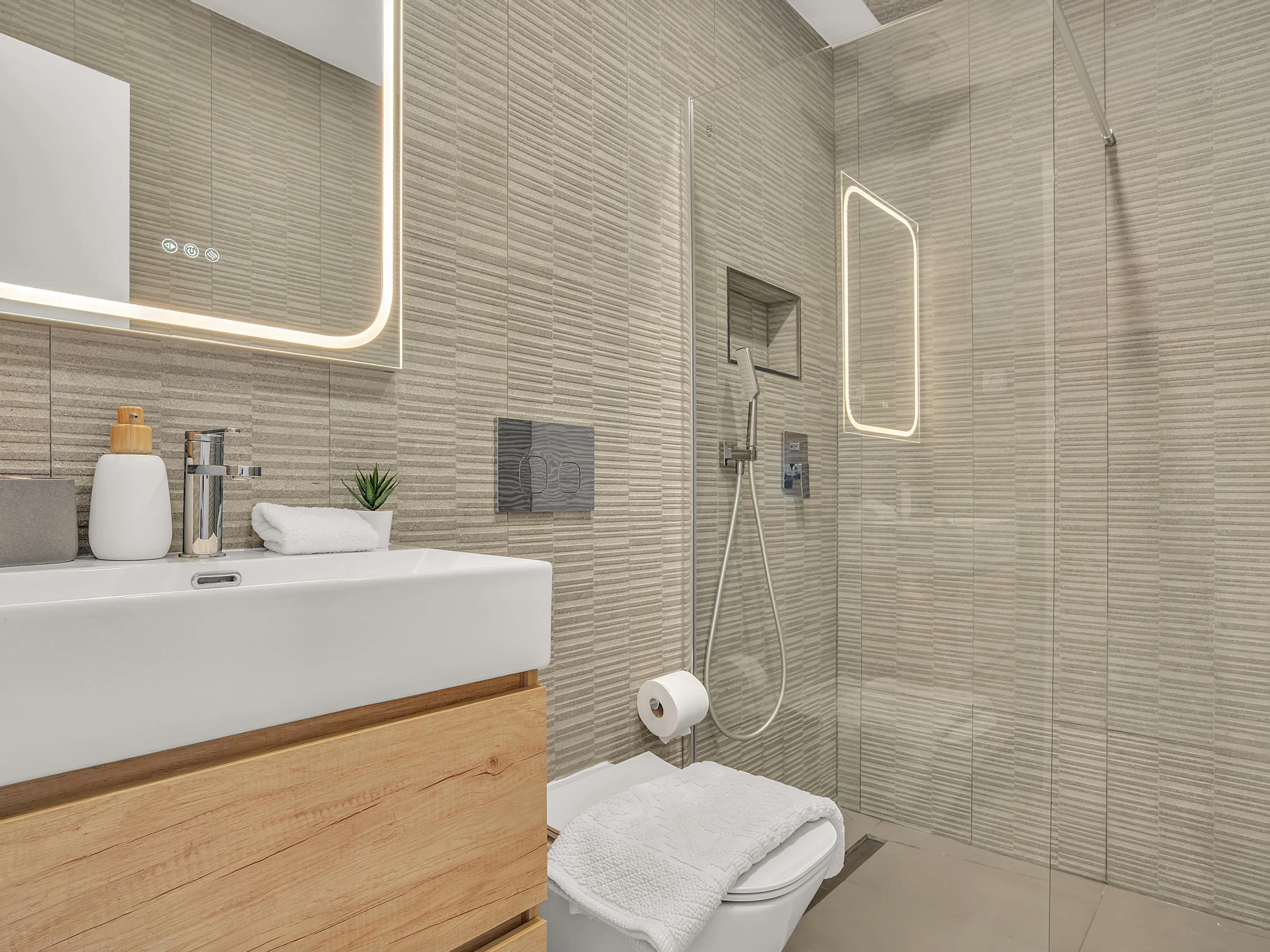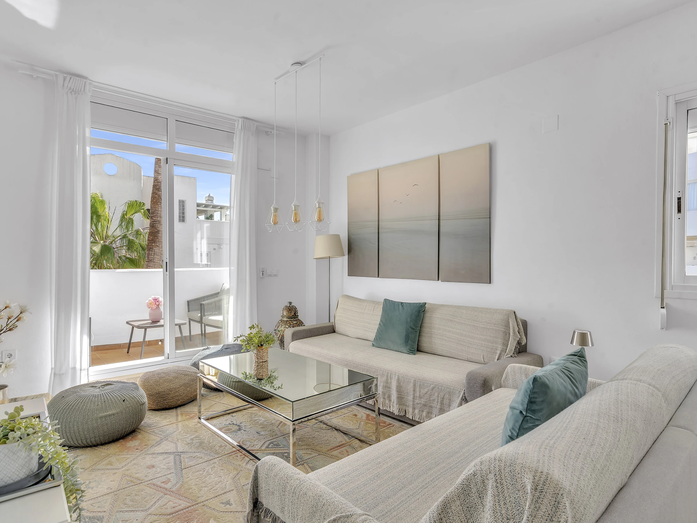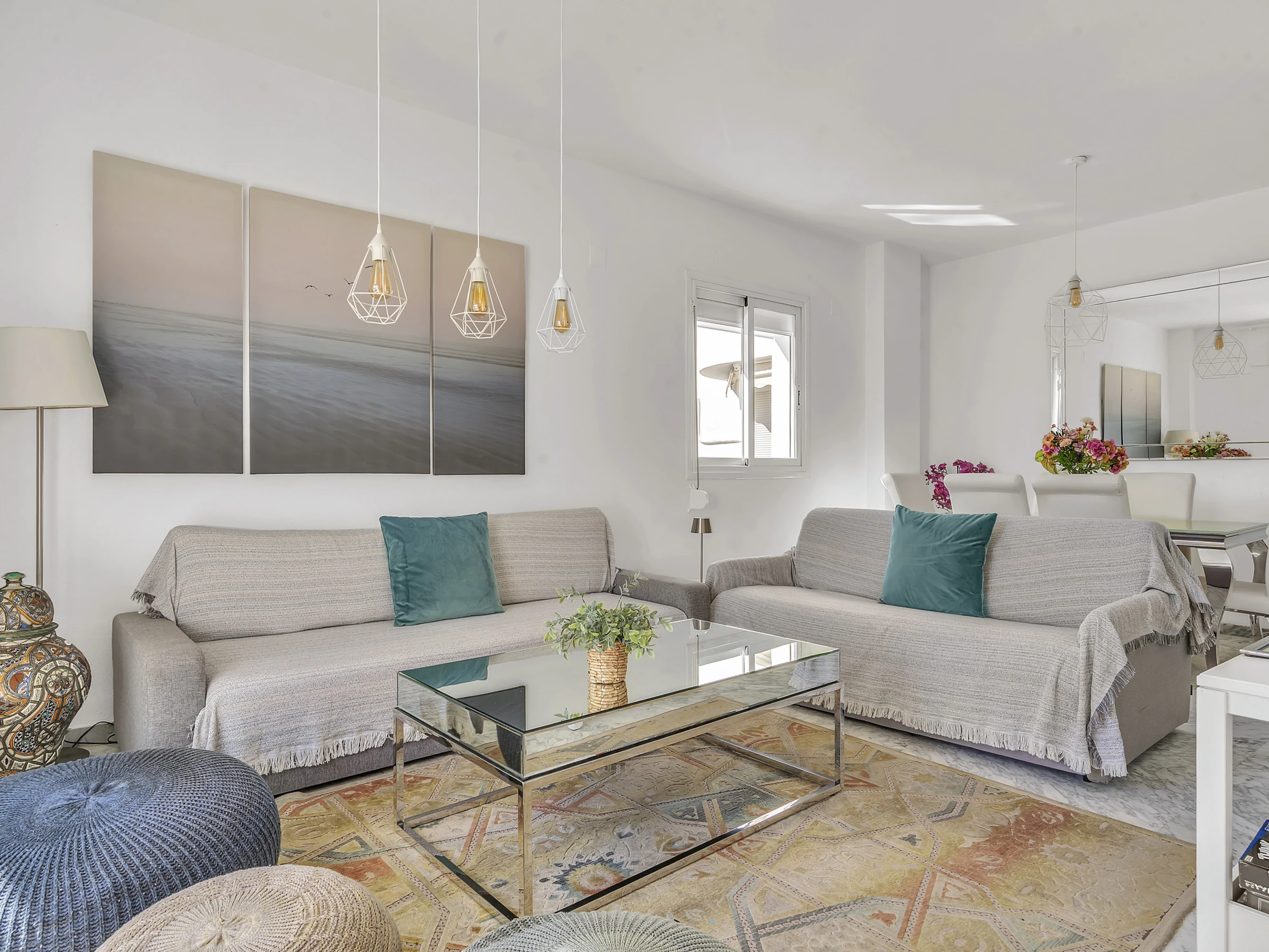 L'appartement comprend un salon et une salle à manger spacieux en plan ouvert, décorés avec goût pour être à la fois confortables et pratiques pour jusqu'à 8 invités. L'espace est lumineux et aéré, idéal pour socialiser ou se détendre avec la famille sur les canapés confortables ou profiter des repas avec vue sur la mer.