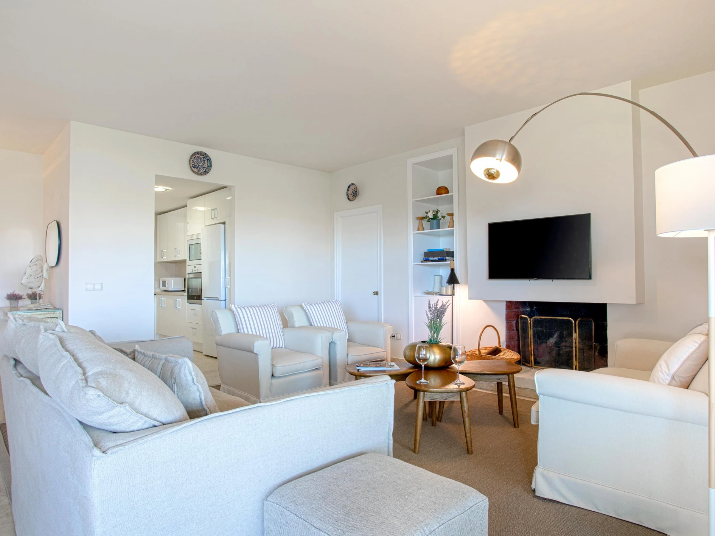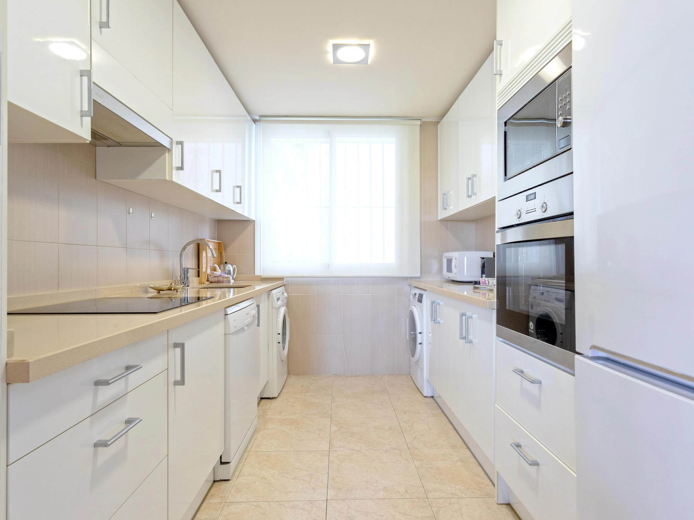 La cuisine, est équipée avec réfrigérateur, micro-ondes, four, congélateur, lave-vaisselle, vaisselle/couverts, cafetière et grille pain.