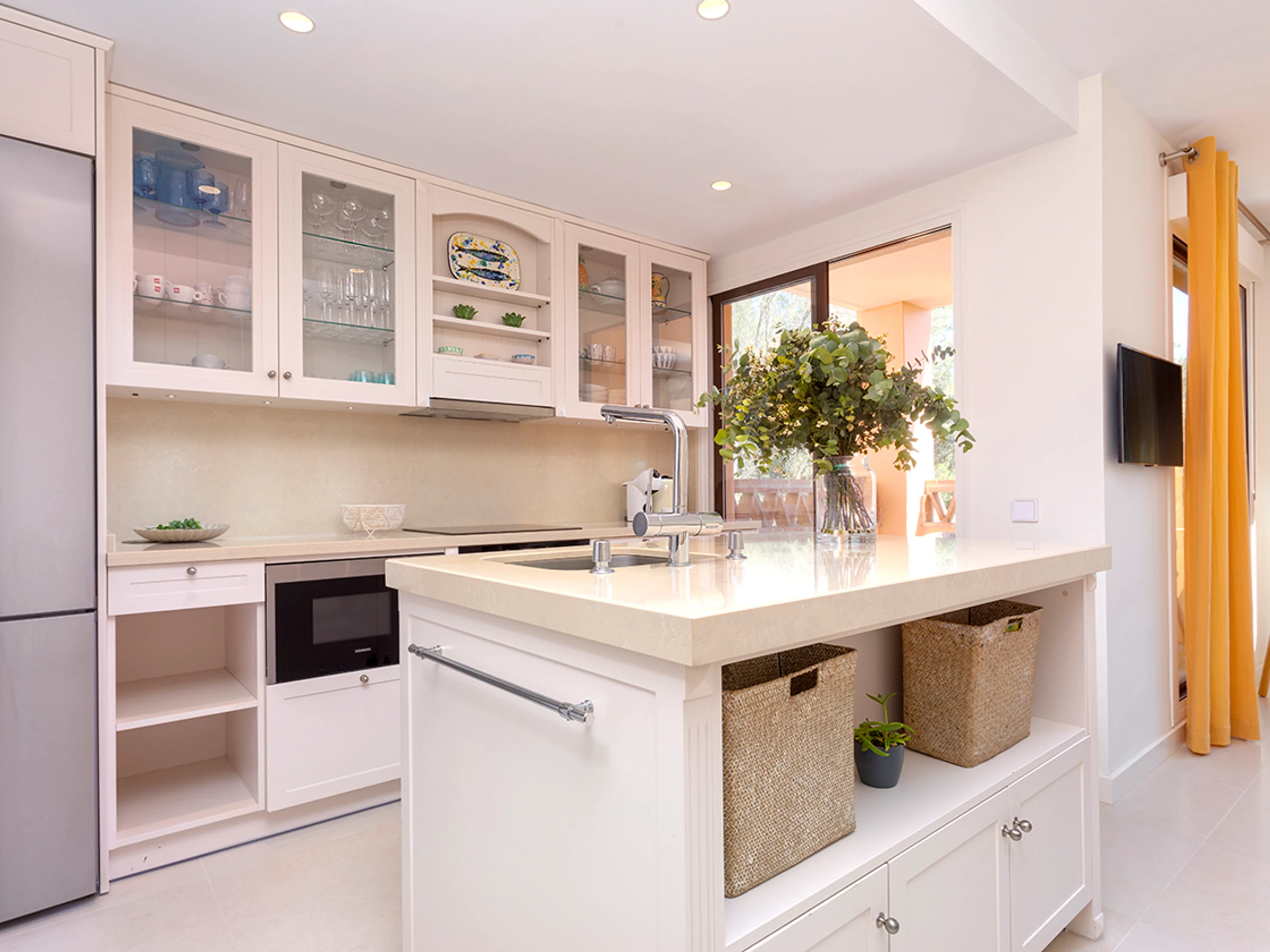 La cuisine, est équipée avec réfrigérateur, micro-ondes, four, congélateur, lave-vaisselle, vaisselle/couverts, cafetière et grille pain.