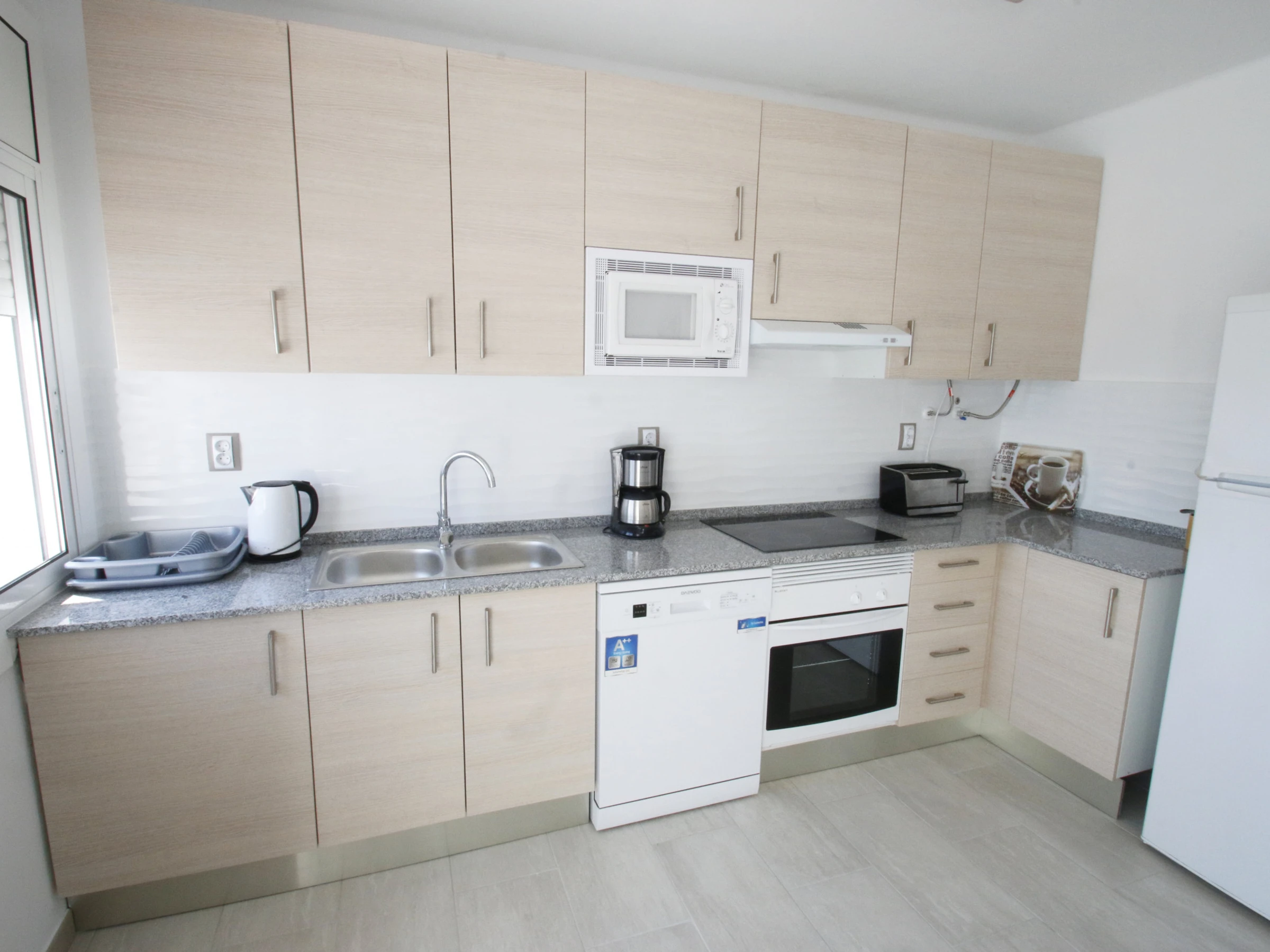 La cuisine est entièrement équipée, avec vaisselle et ustensiles de cuisine, plaque vitrocéramique, four, lave-vaisselle, réfrigérateur combiné, micro-ondes, grille-pain, bouilloire et cafetière.