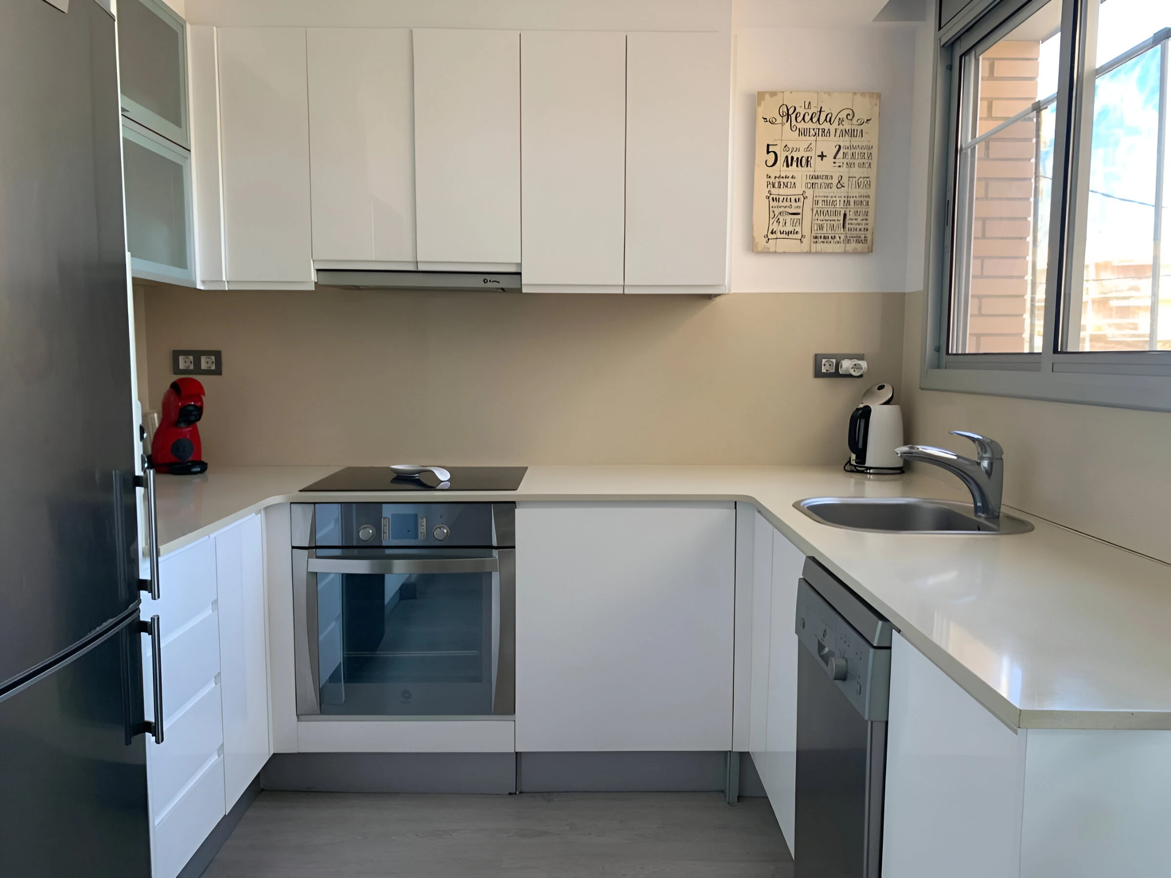 La cuisine américaine, équipée de plaques vitrocéramiques, est prête à répondre à tous vos besoins culinaires. Elle comprend un réfrigérateur, un micro-ondes, un congélateur, un lave-vaisselle, de la vaisselle/couverts, des ustensiles de cuisine, une cafetière et un grille-pain, ce qui facilite la préparation de repas faits maison pendant votre séjour.