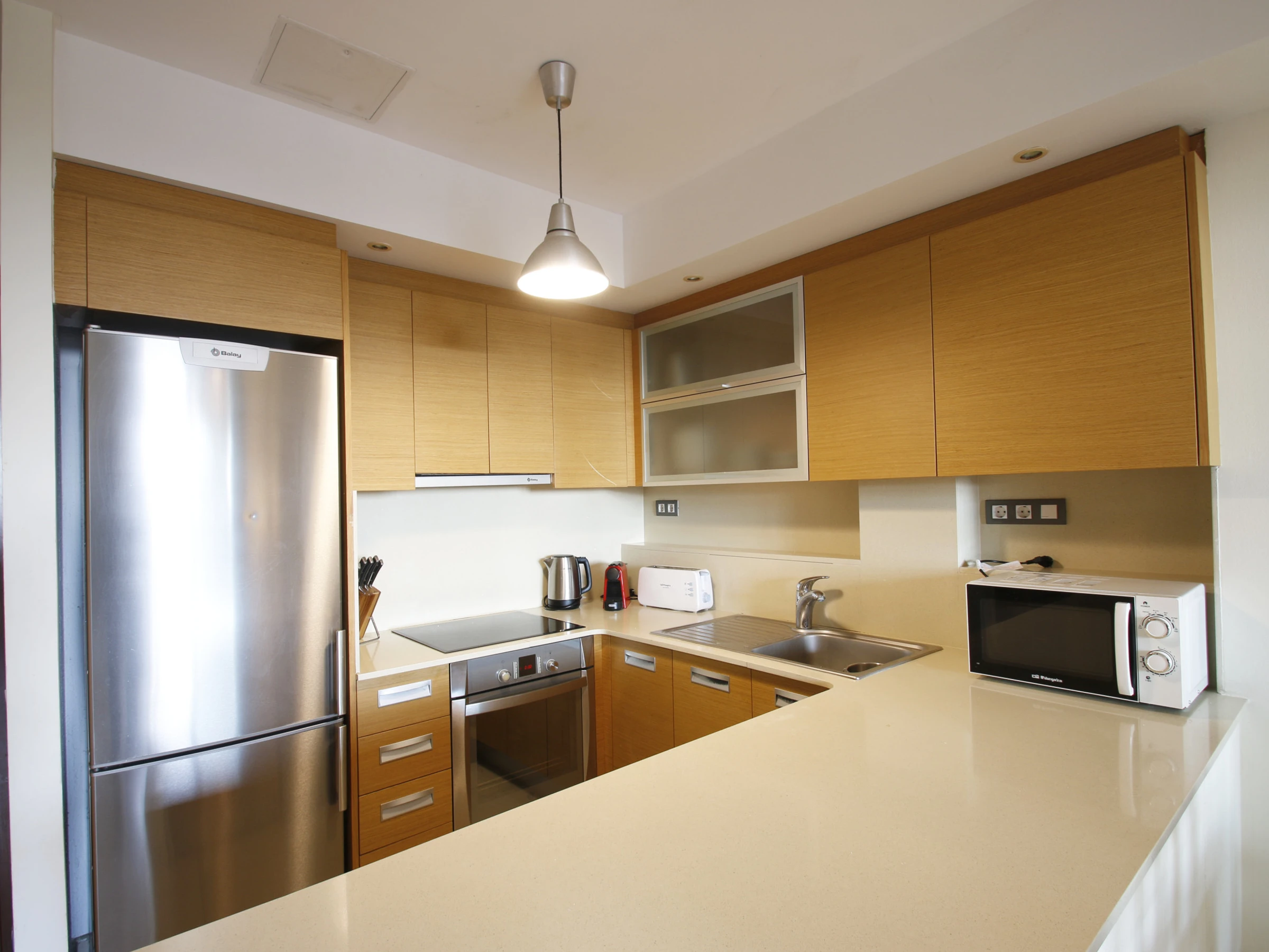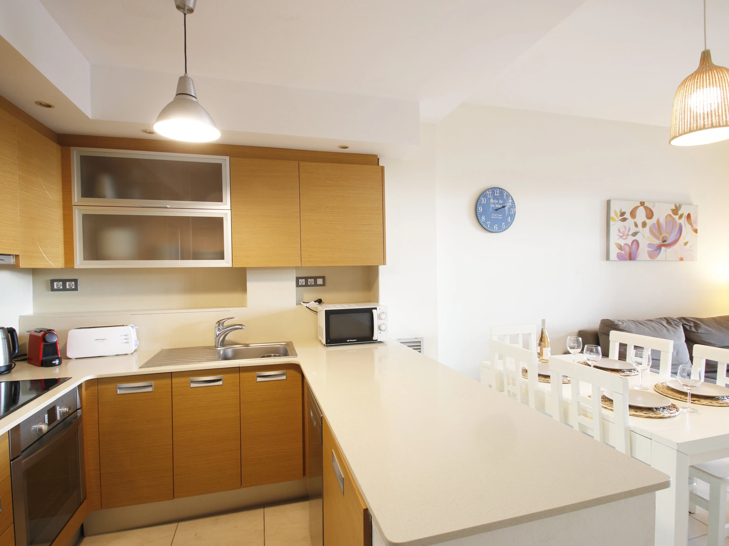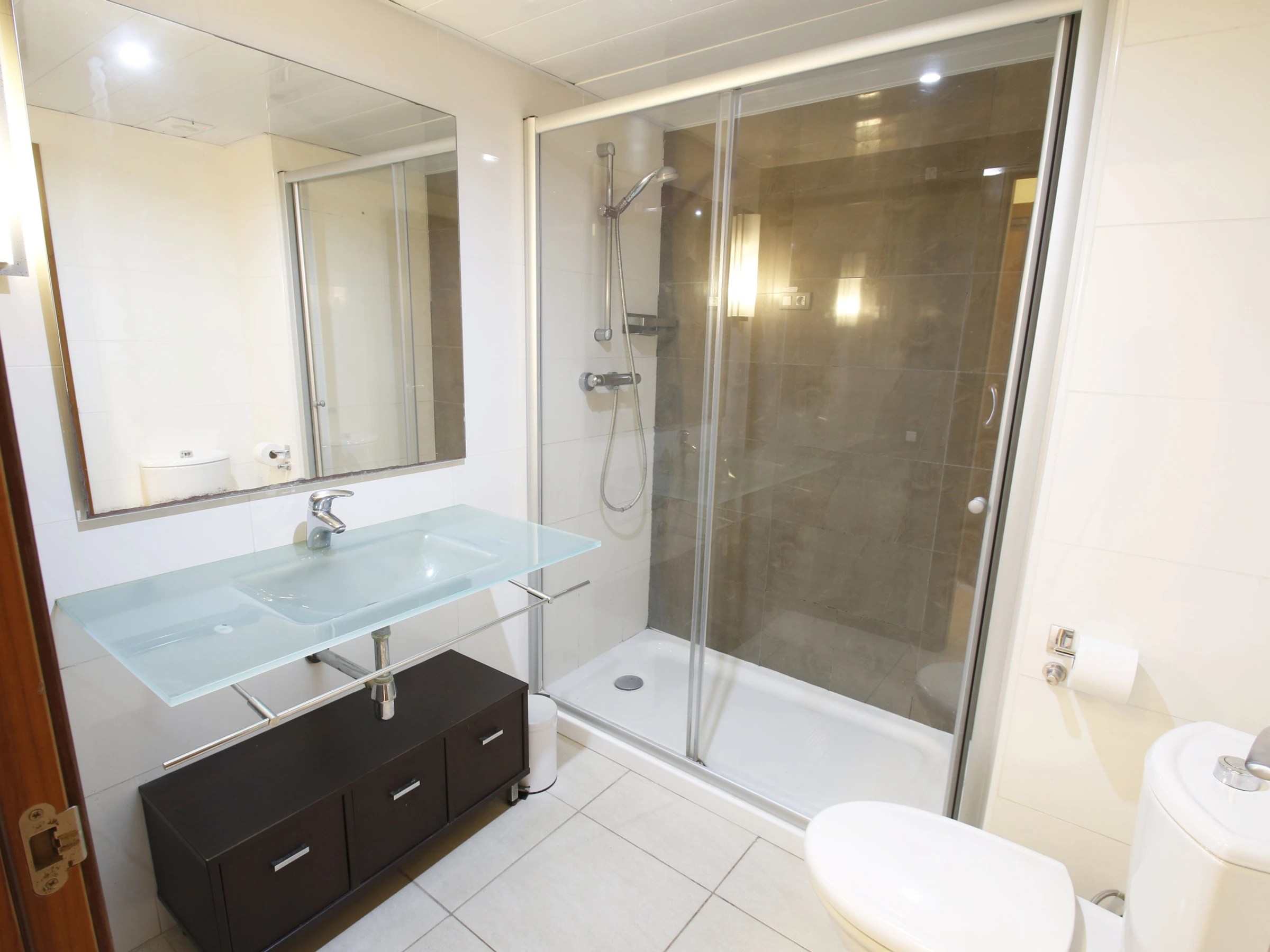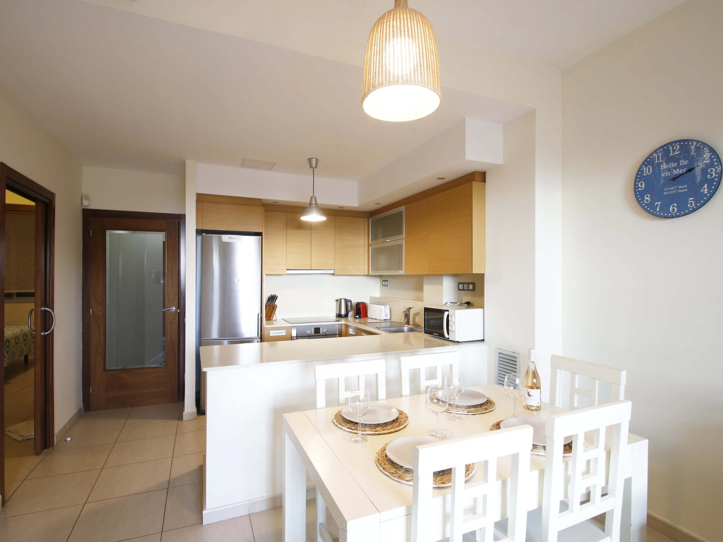 En termes d'équipement, l'appartement est prêt pour un séjour confortable toute l'année. Il dispose de la climatisation dans tout le logement, du chauffage par pompe à chaleur, du wifi haut débit, d'un lave-linge, d'un ascenseur et d'une place de parking couverte dans le même bâtiment, un élément particulièrement apprécié en haute saison. La cuisine américaine est entièrement équipée avec une plaque vitrocéramique, un four, un micro-ondes, un lave-vaisselle, un réfrigérateur, un congélateur, une cafetière, un grille-pain et un équipement complet.