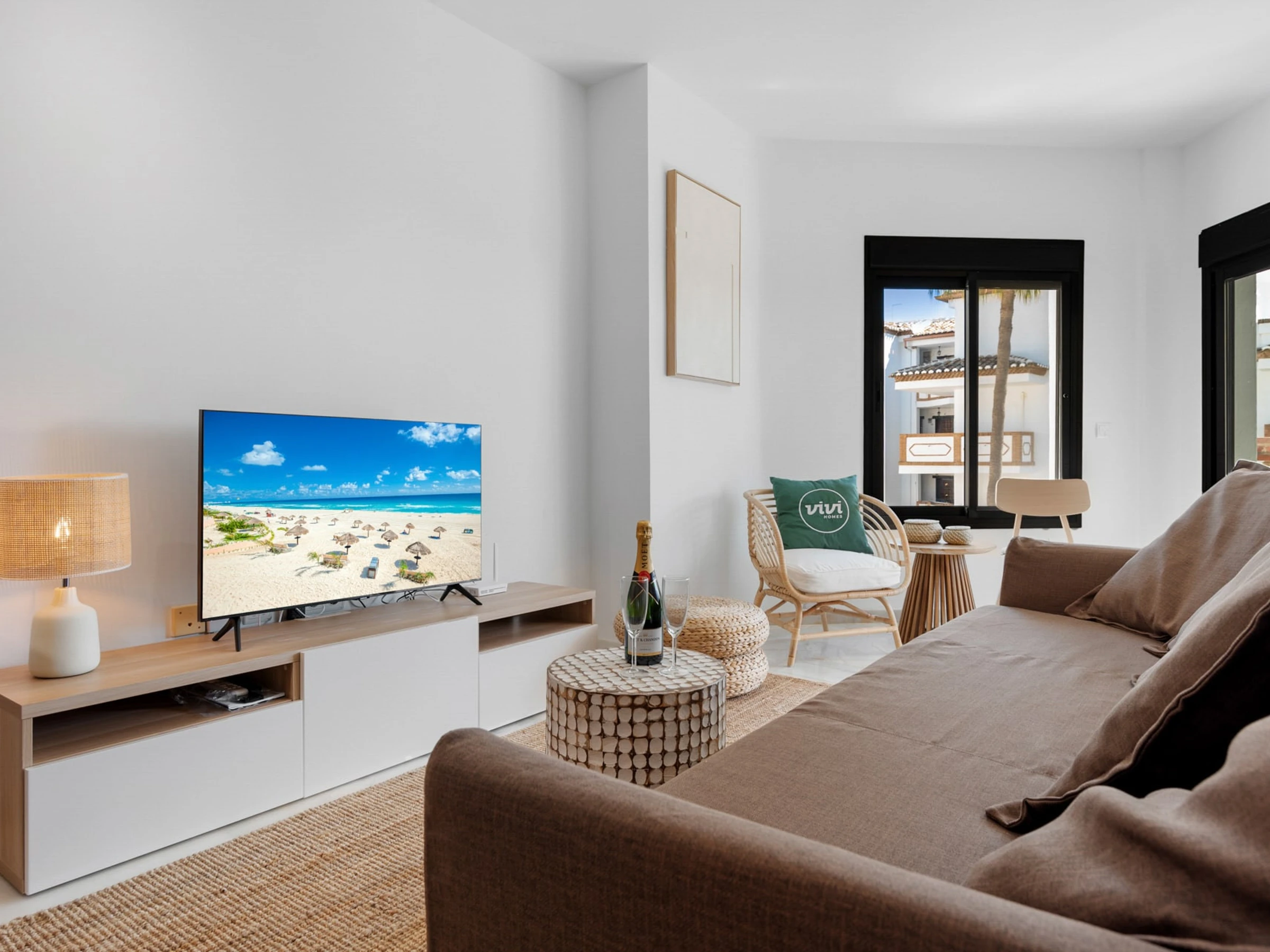 Logement de 68 m² meublé avec goût et totalement équipé, situé en front de plage, avec vue sur le jardin et la piscine.