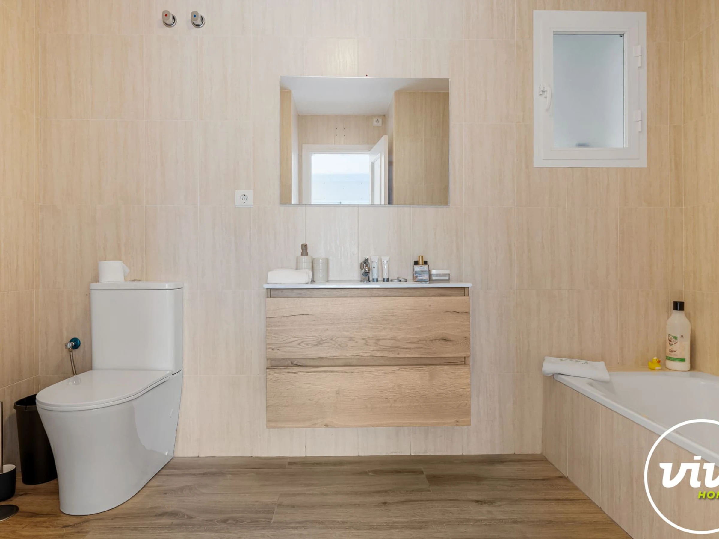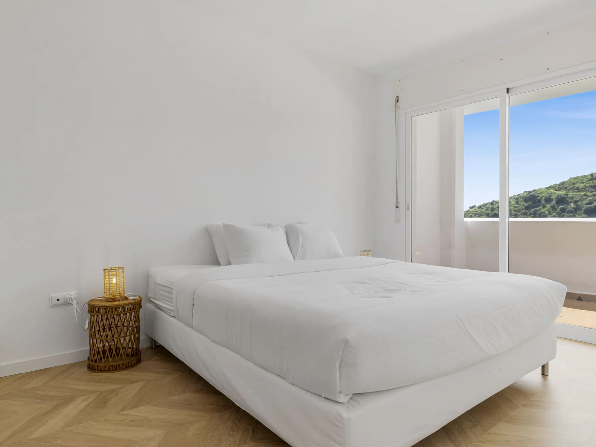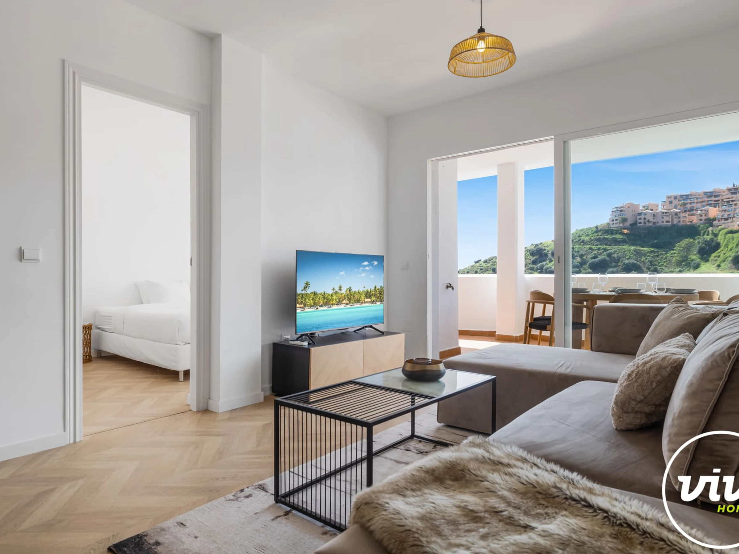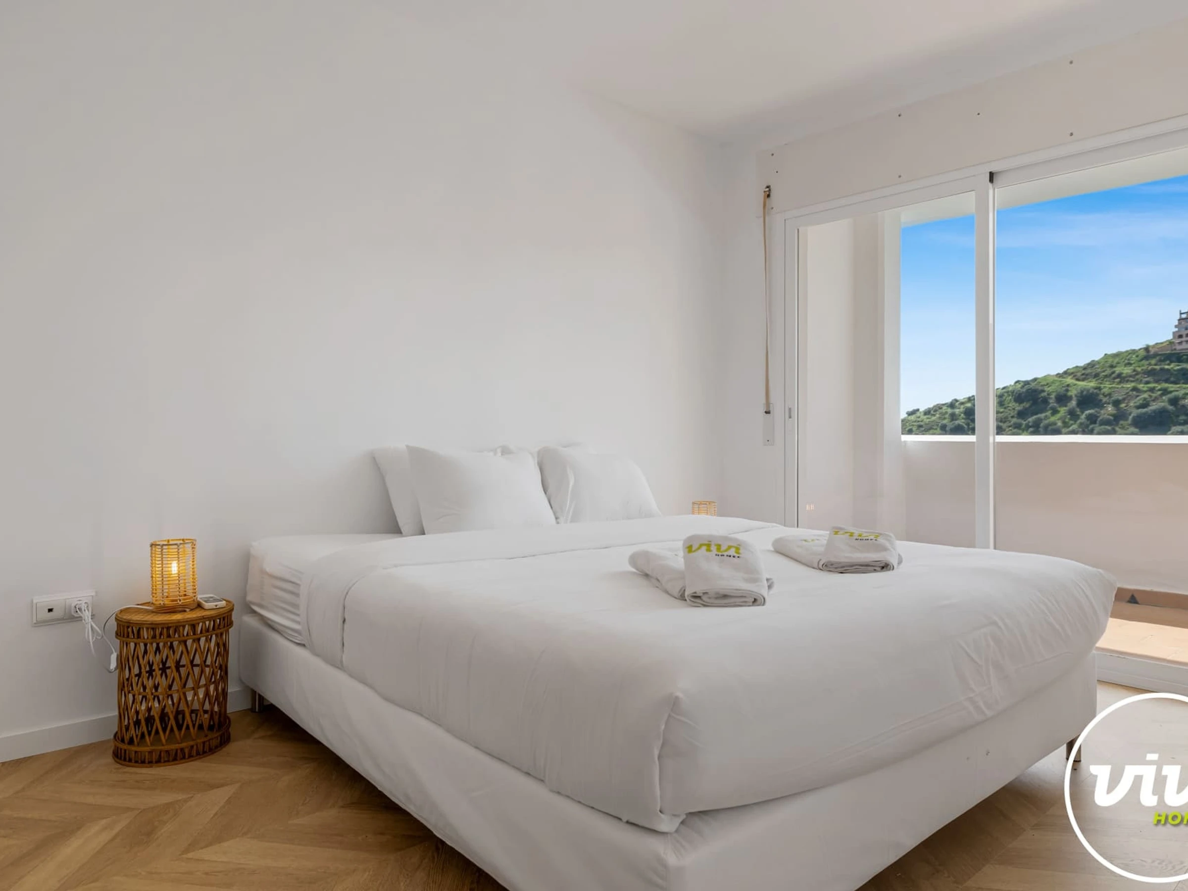Logement de 100 m² accueillant et meubles nouveaux, avec vue sur la mer et la montagne.
