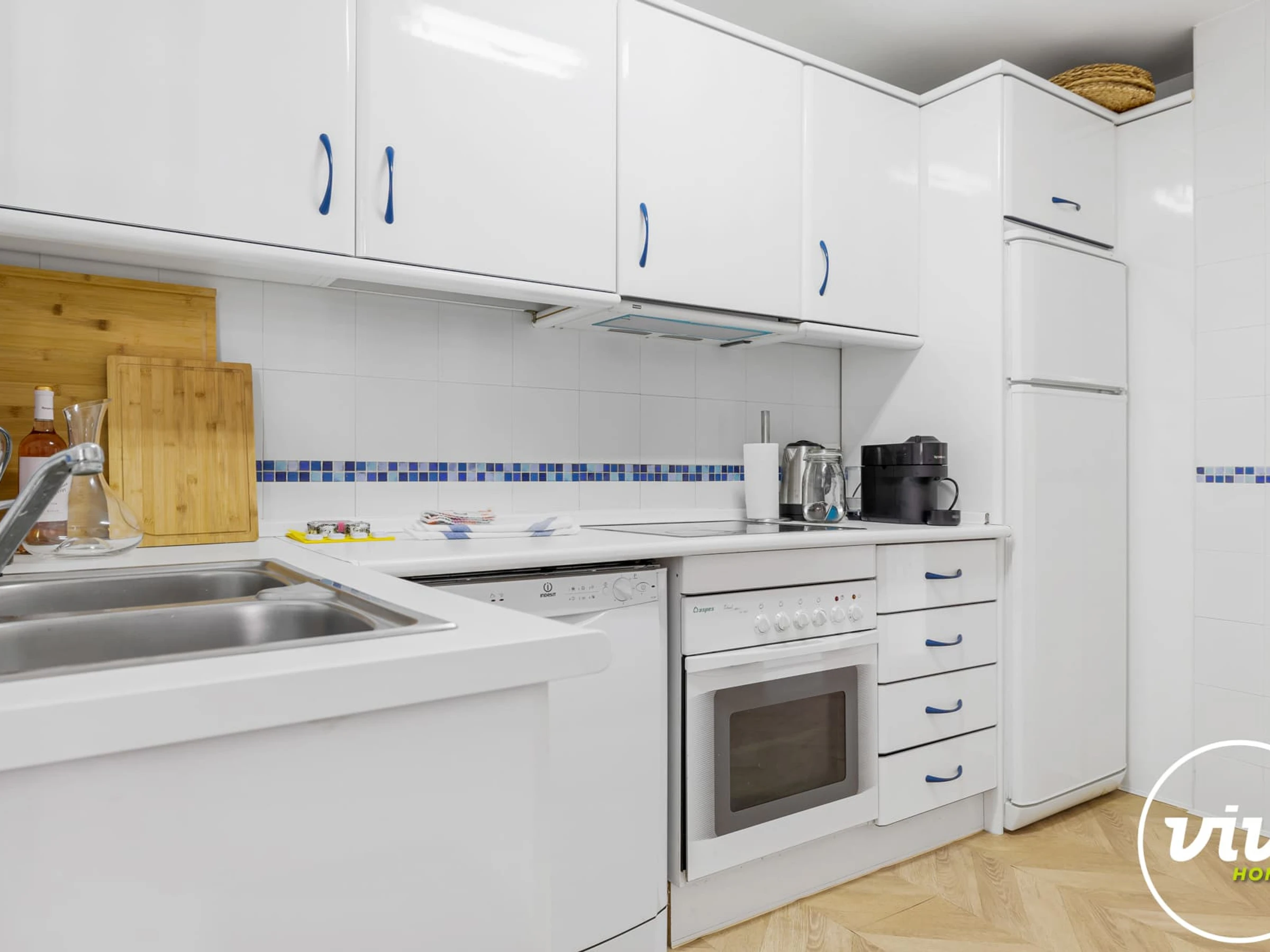 La cuisine indépendante, à induction, est équipée avec réfrigérateur, micro-ondes, four, congélateur, lave-vaisselle, vaisselle/couverts, ustensiles/cuisine, cafetière, grille pain, bouilloire et equipement de cuisine.