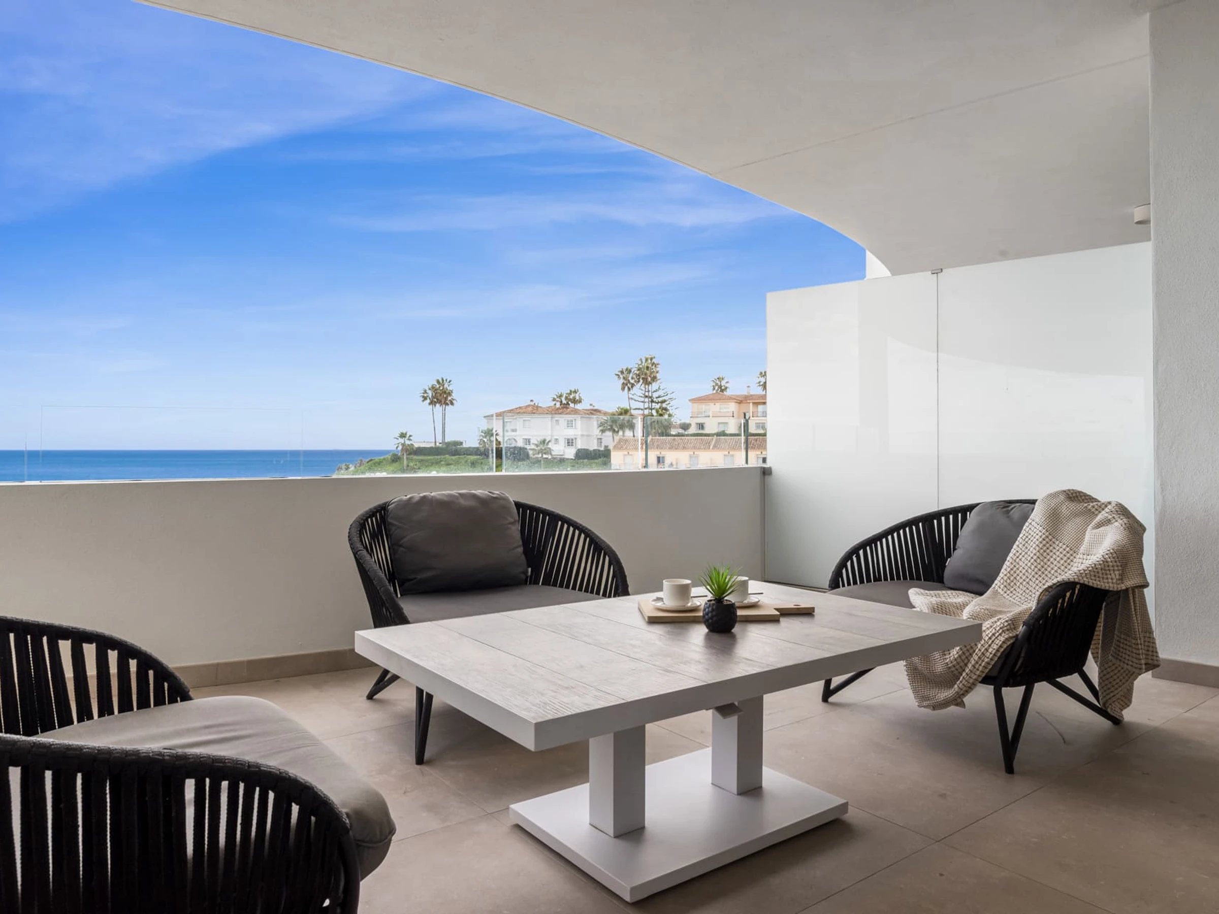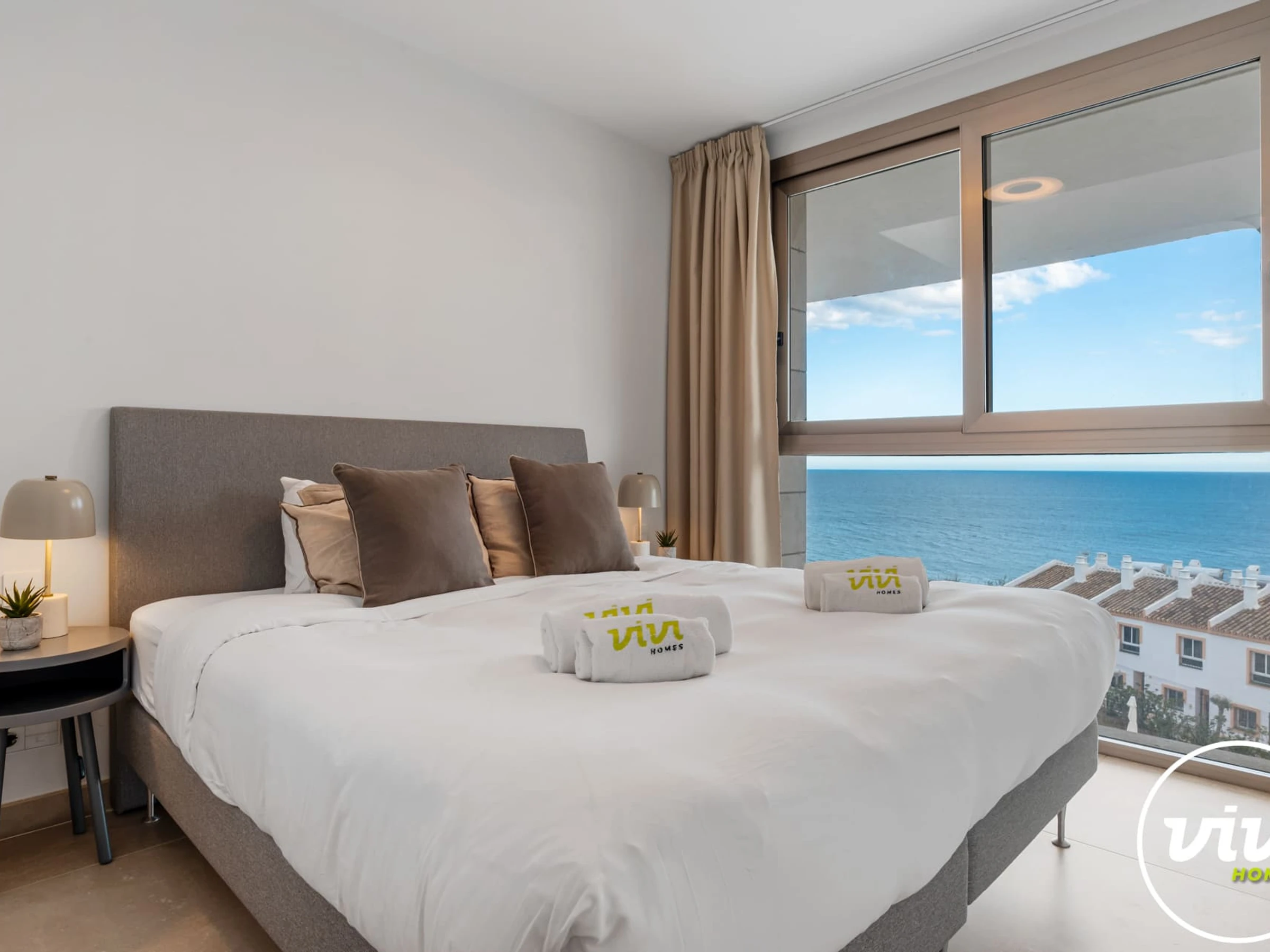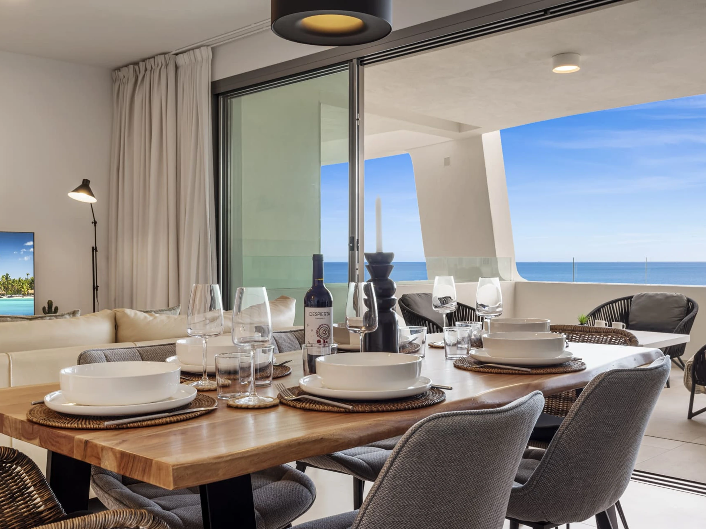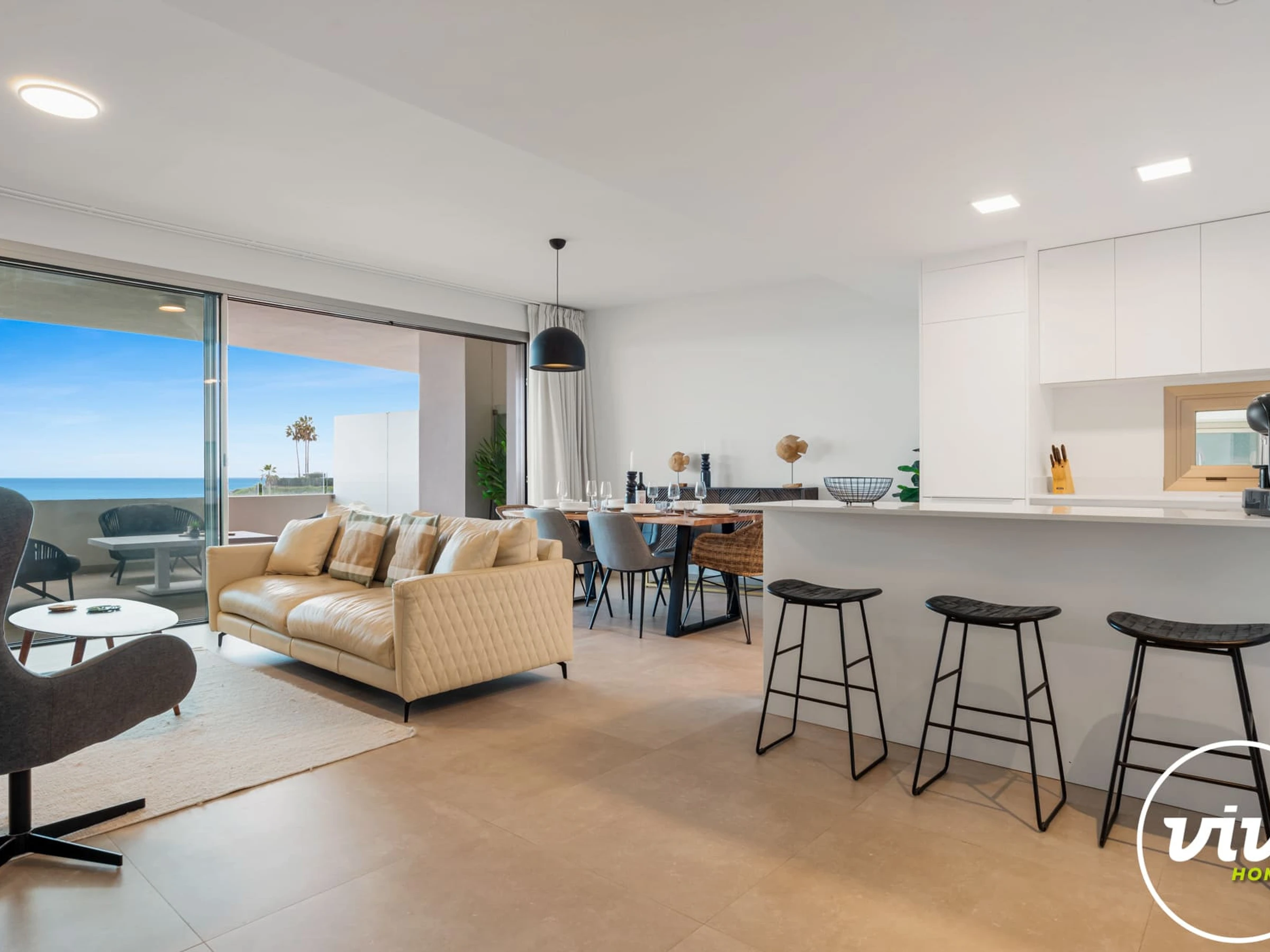 Logement de 115 m² joli et moderne, situé en front de plage, avec vue sur la mer et la montagne.