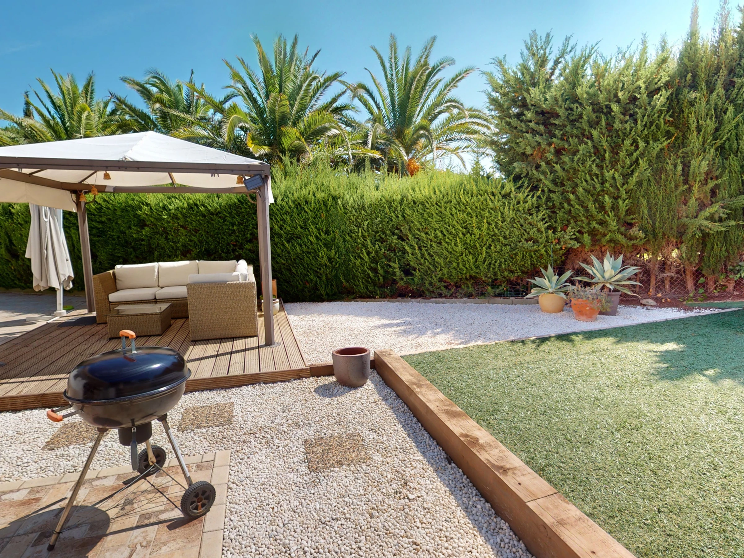 Elle dispose de jardin, mobilier de jardin, clôture, terrasse, lave-linge, barbecue, fer à repasser, accès internet (wifi), sèche-cheveux, zone pour les enfants, alarme, chauffage central, climatisation, piscine privée, parking extérieur même bâtiment, 3 ventilateurs, 1 Télévision.