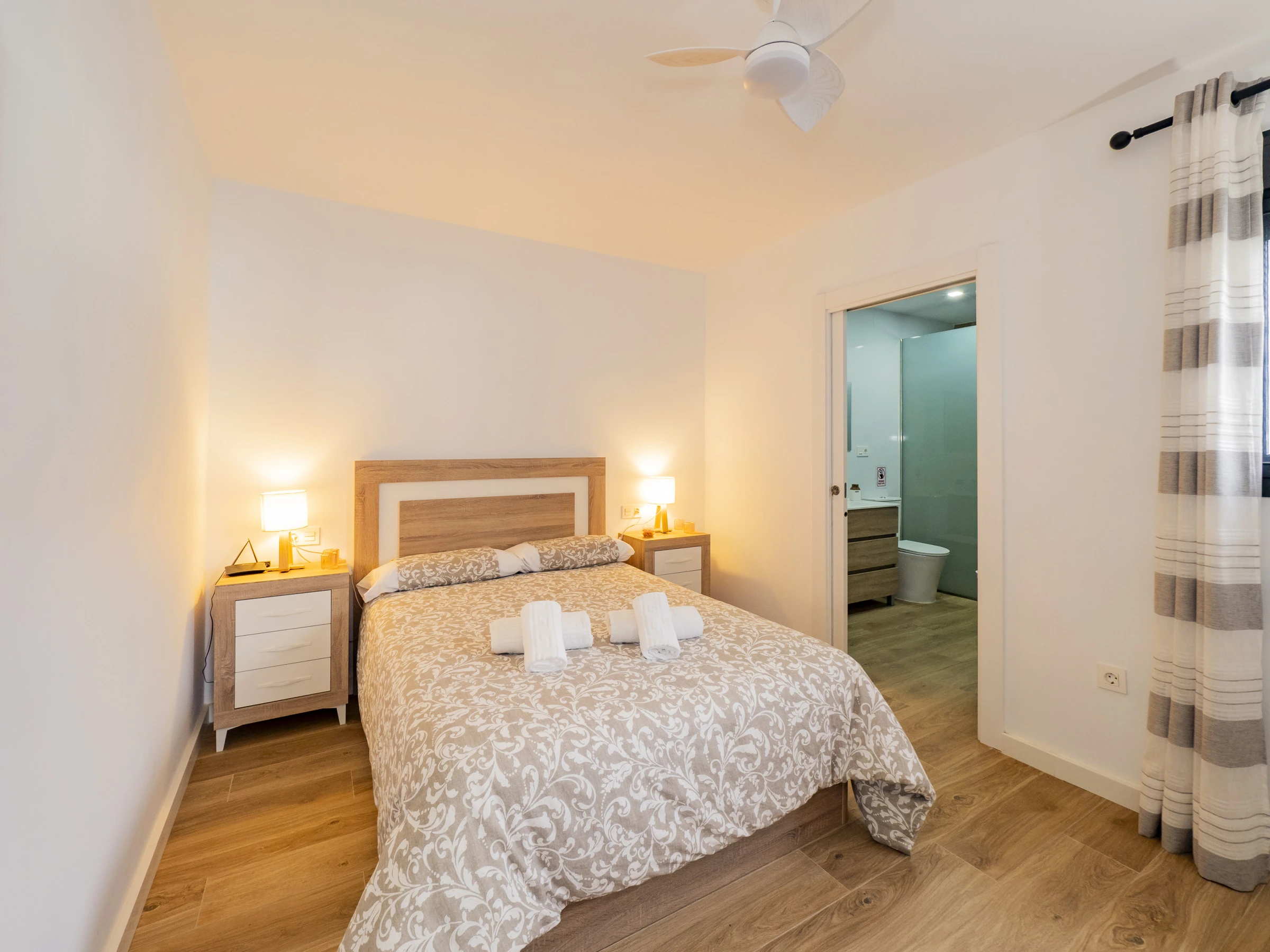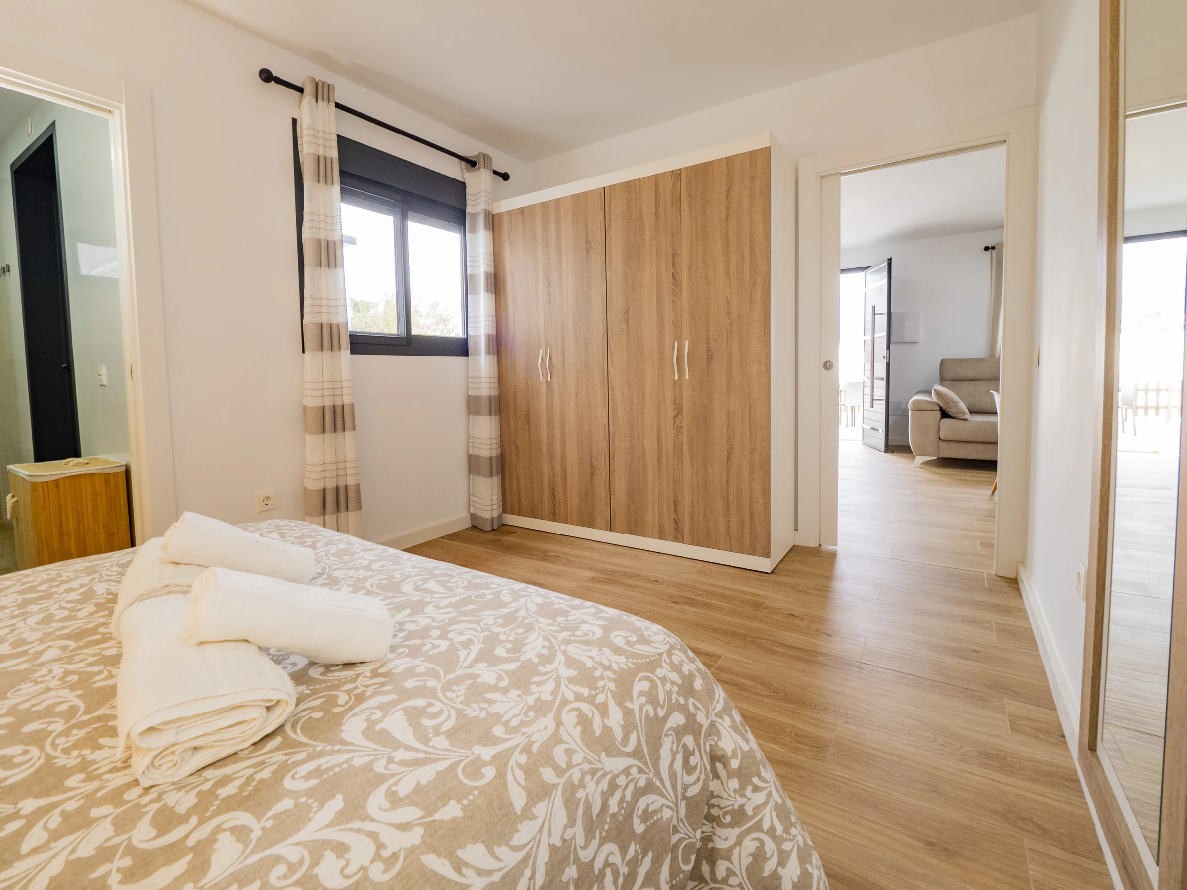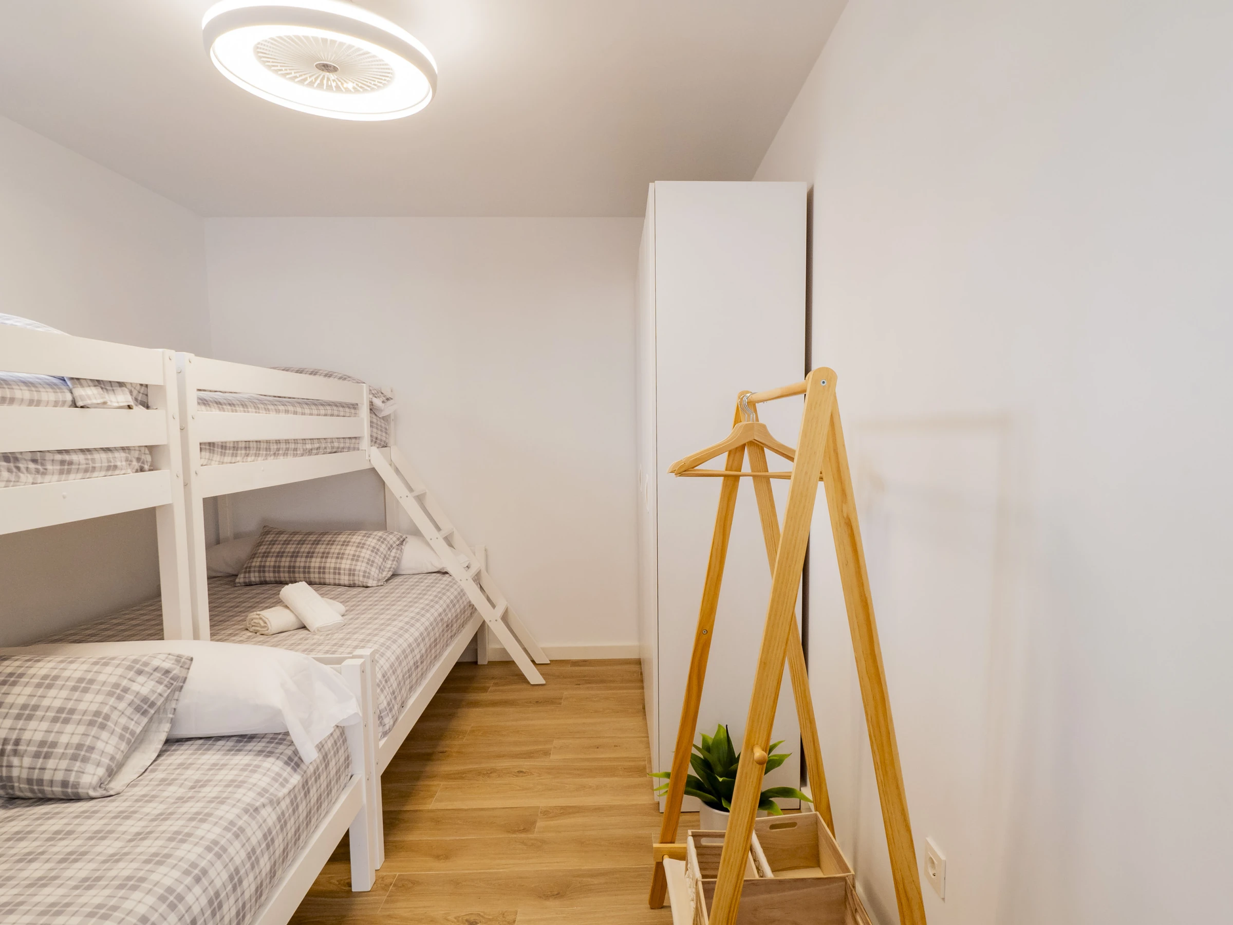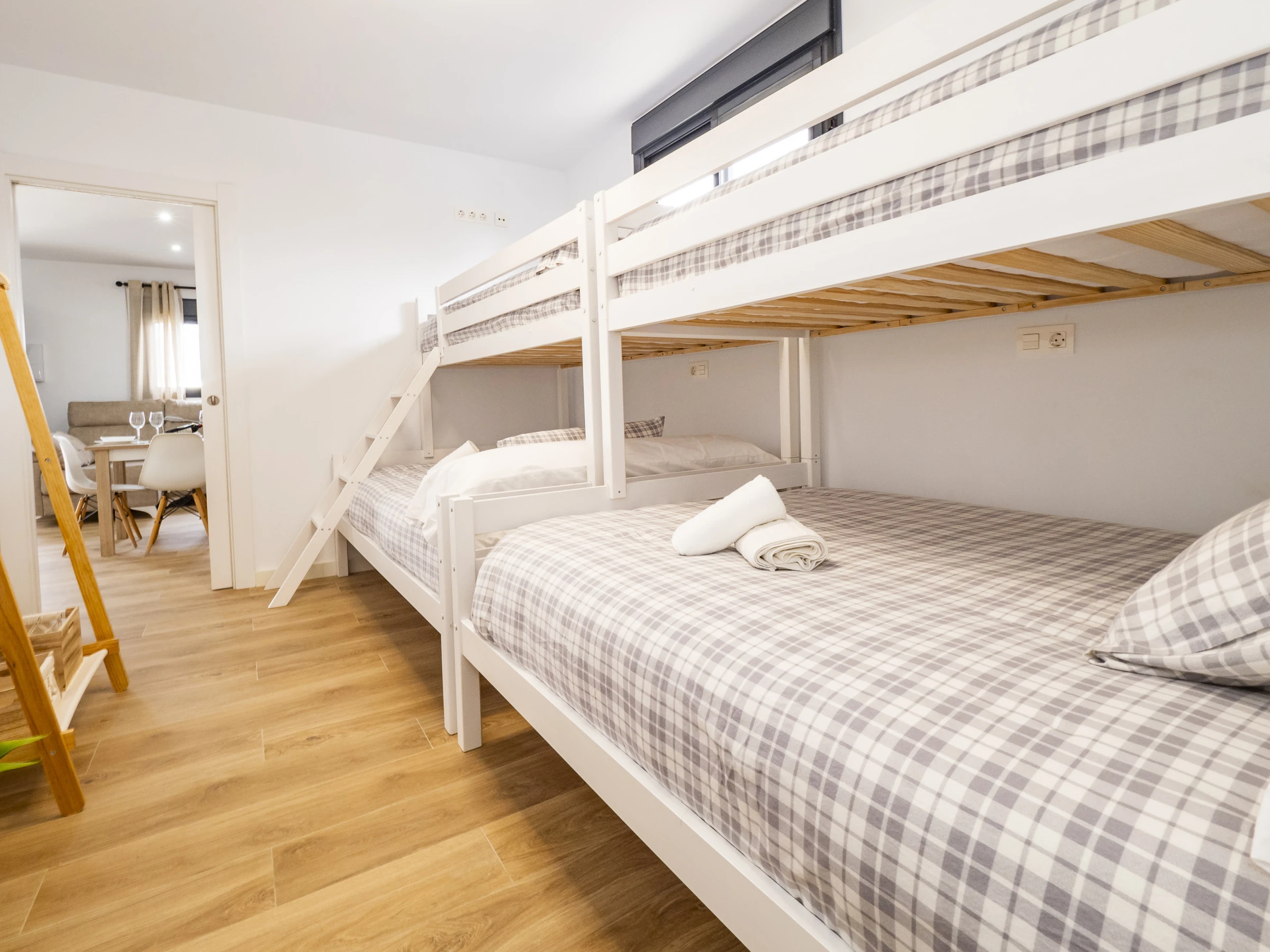 Le logement dispose de deux chambres : l'une avec deux lits superposés spacieux parfaits pour les enfants et l'autre avec un lit de couple pour un repos réparateur. Bien que les chambres ne disposent pas de climatisation, la puissante climatisation du salon-salle à manger et les ventilateurs de plafond garantissent une température agréable. La salle de bain, conçue pour offrir de l'intimité, a un accès direct depuis la chambre principale et une entrée indépendante depuis l'extérieur pour plus de commodité.