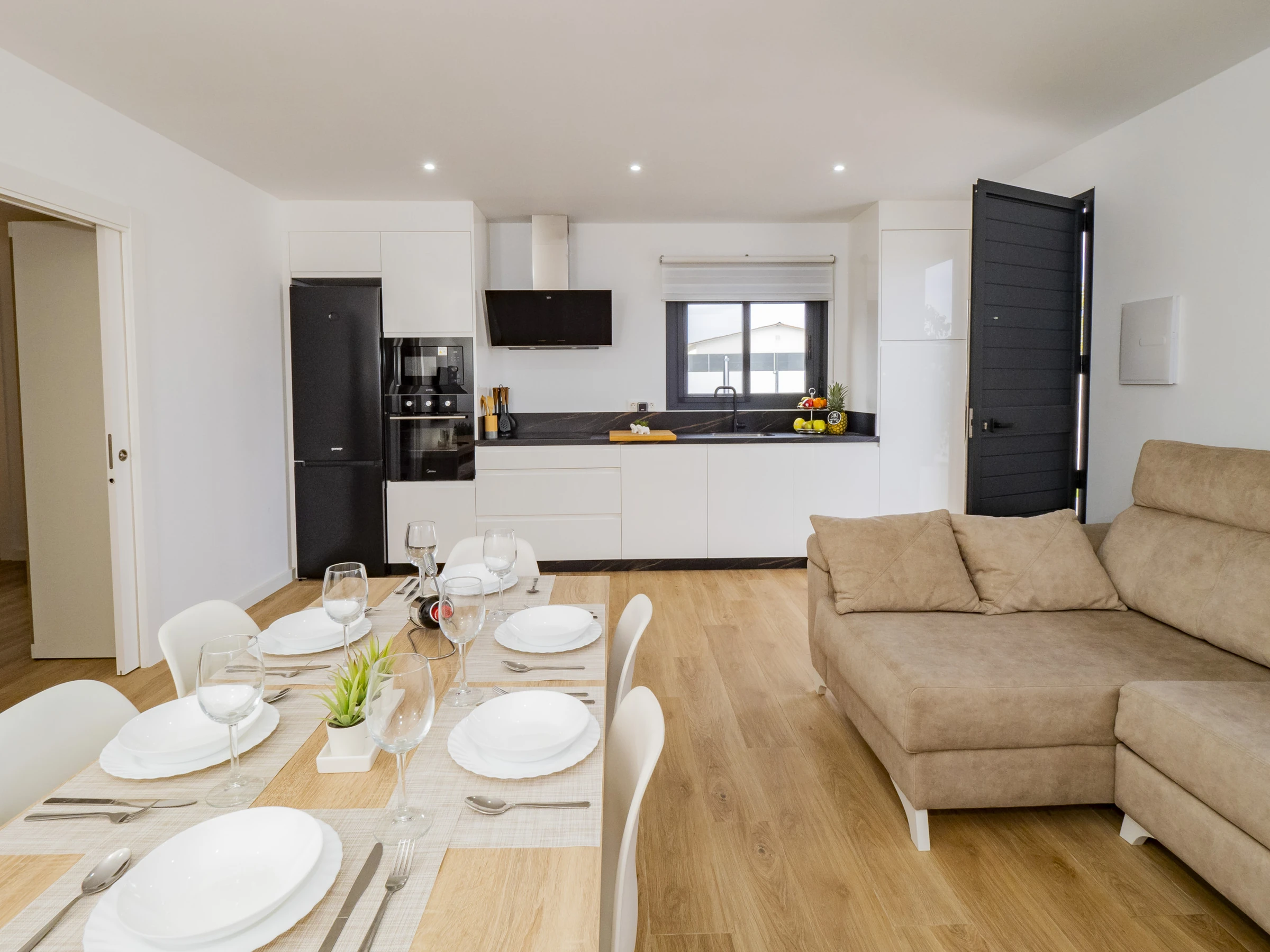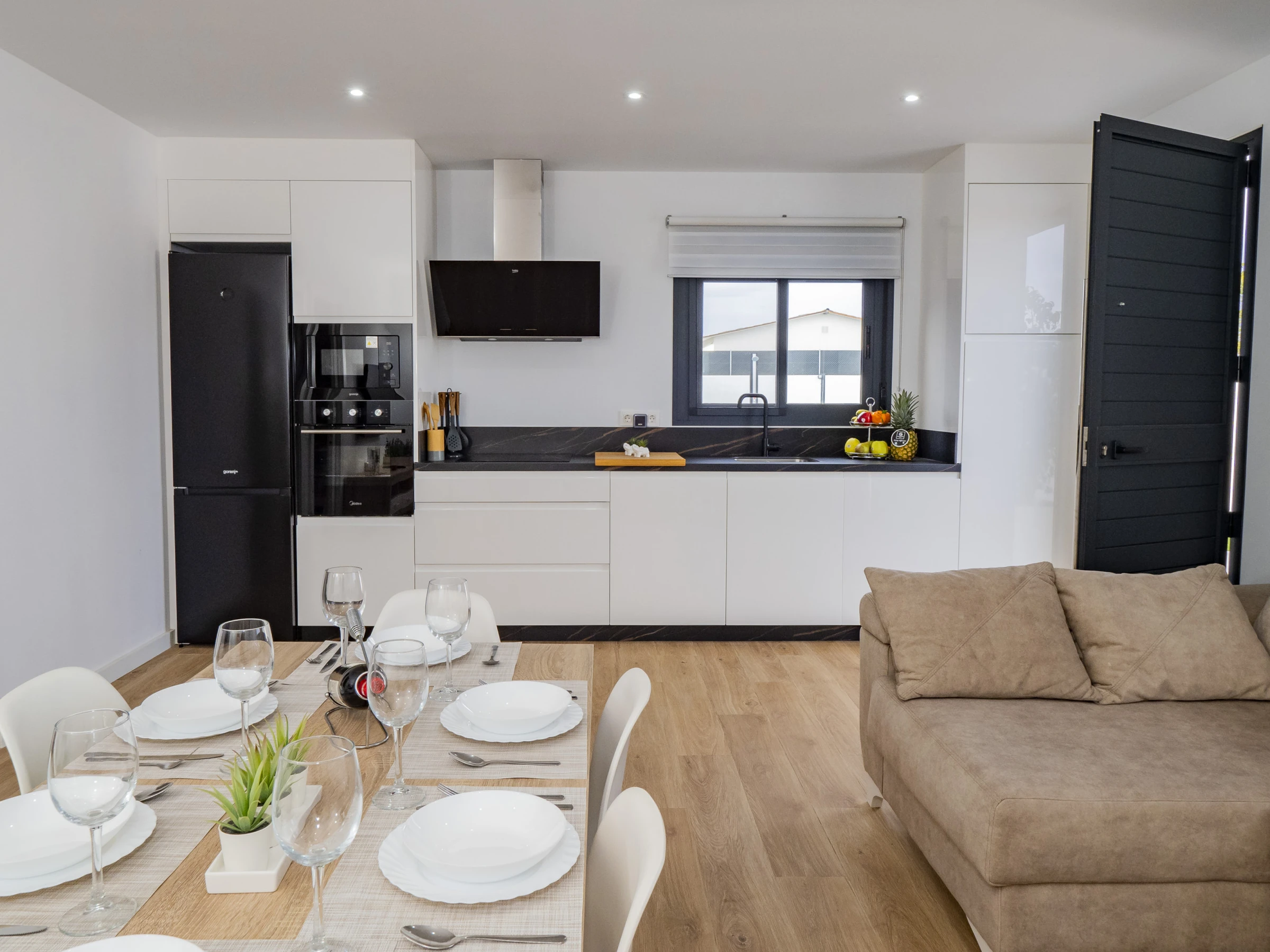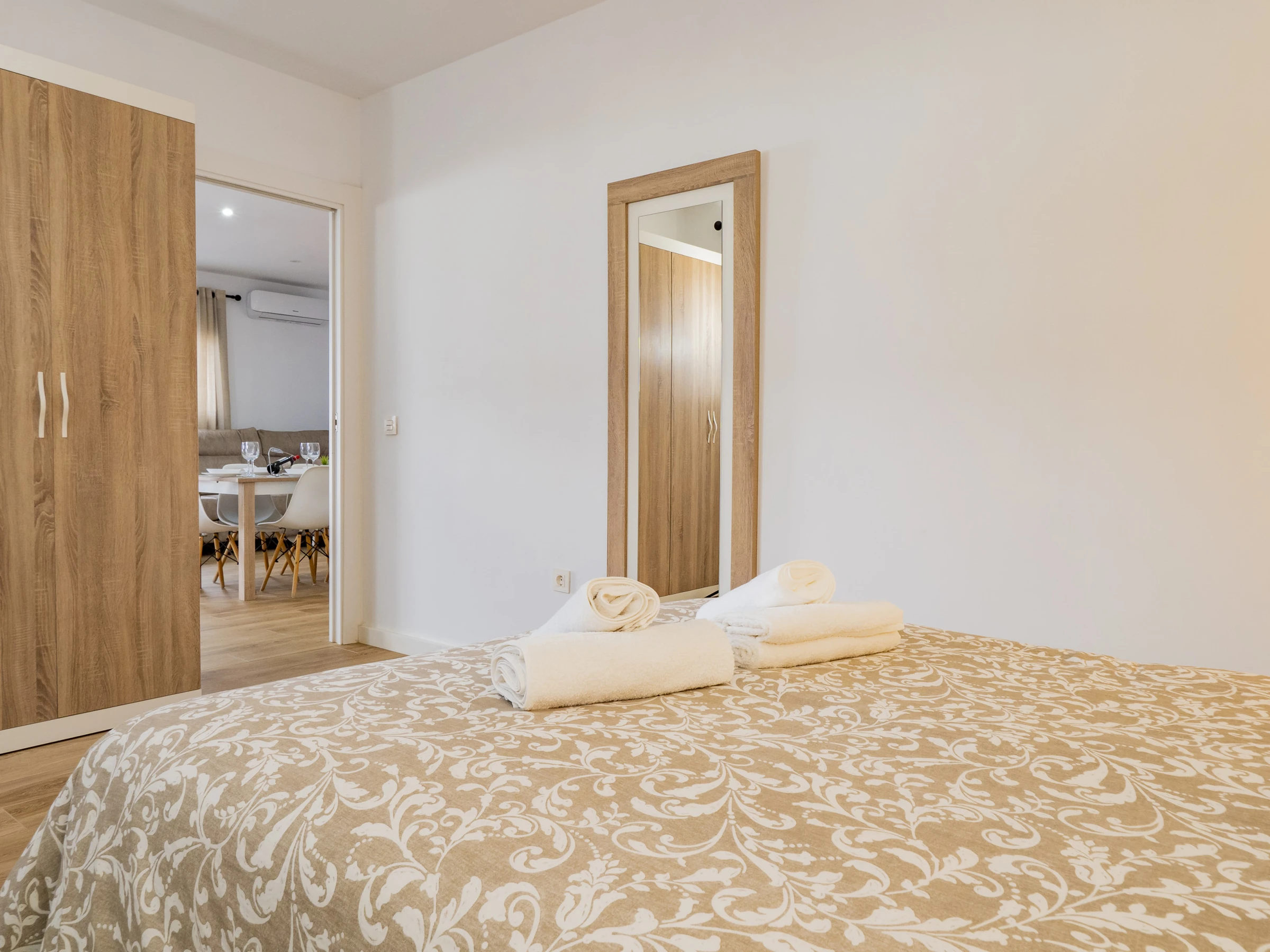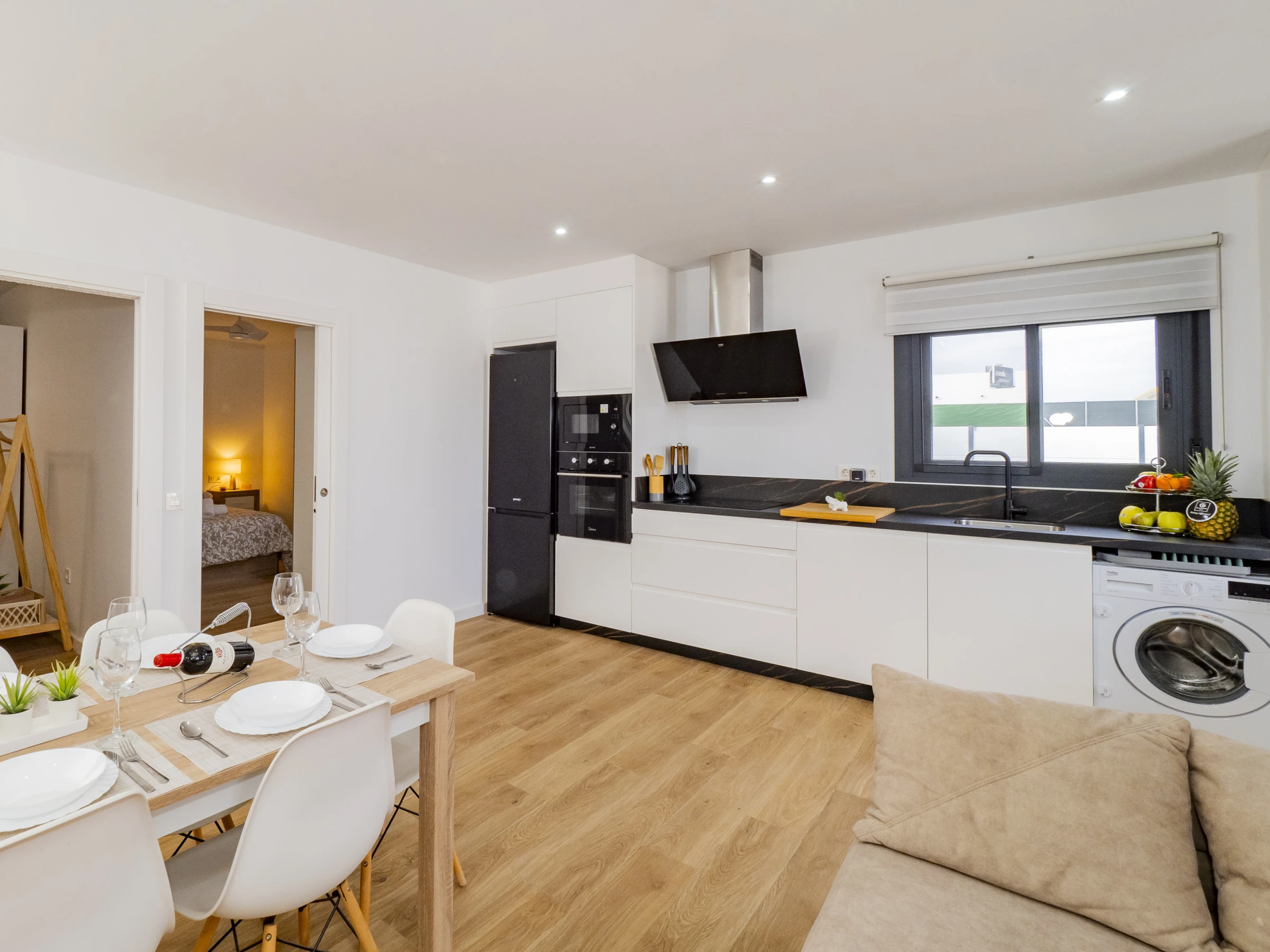 Le logement dispose de deux chambres : l'une avec deux lits superposés spacieux parfaits pour les enfants et l'autre avec un lit de couple pour un repos réparateur. Bien que les chambres ne disposent pas de climatisation, la puissante climatisation du salon-salle à manger et les ventilateurs de plafond garantissent une température agréable. La salle de bain, conçue pour offrir de l'intimité, a un accès direct depuis la chambre principale et une entrée indépendante depuis l'extérieur pour plus de commodité.
