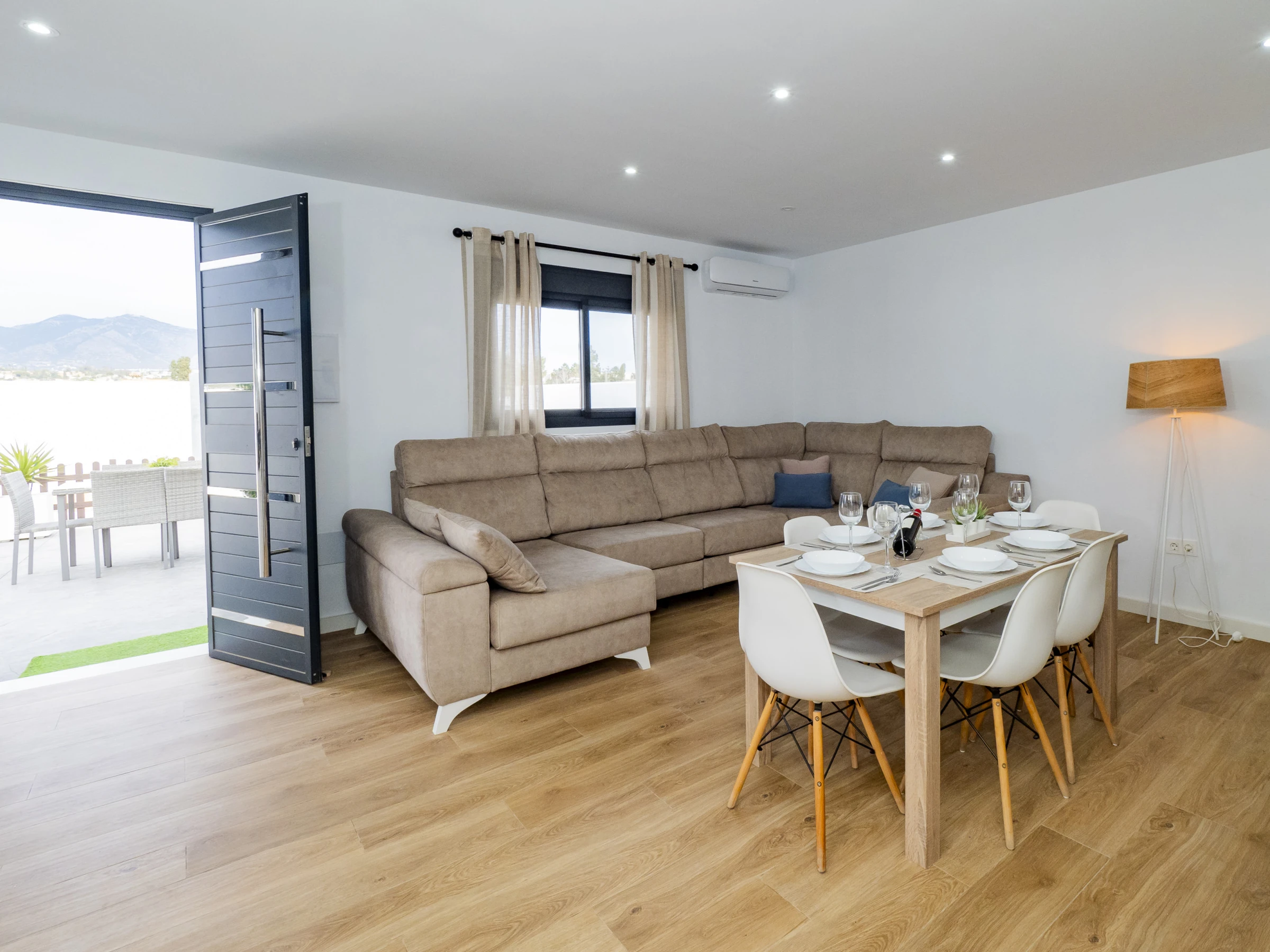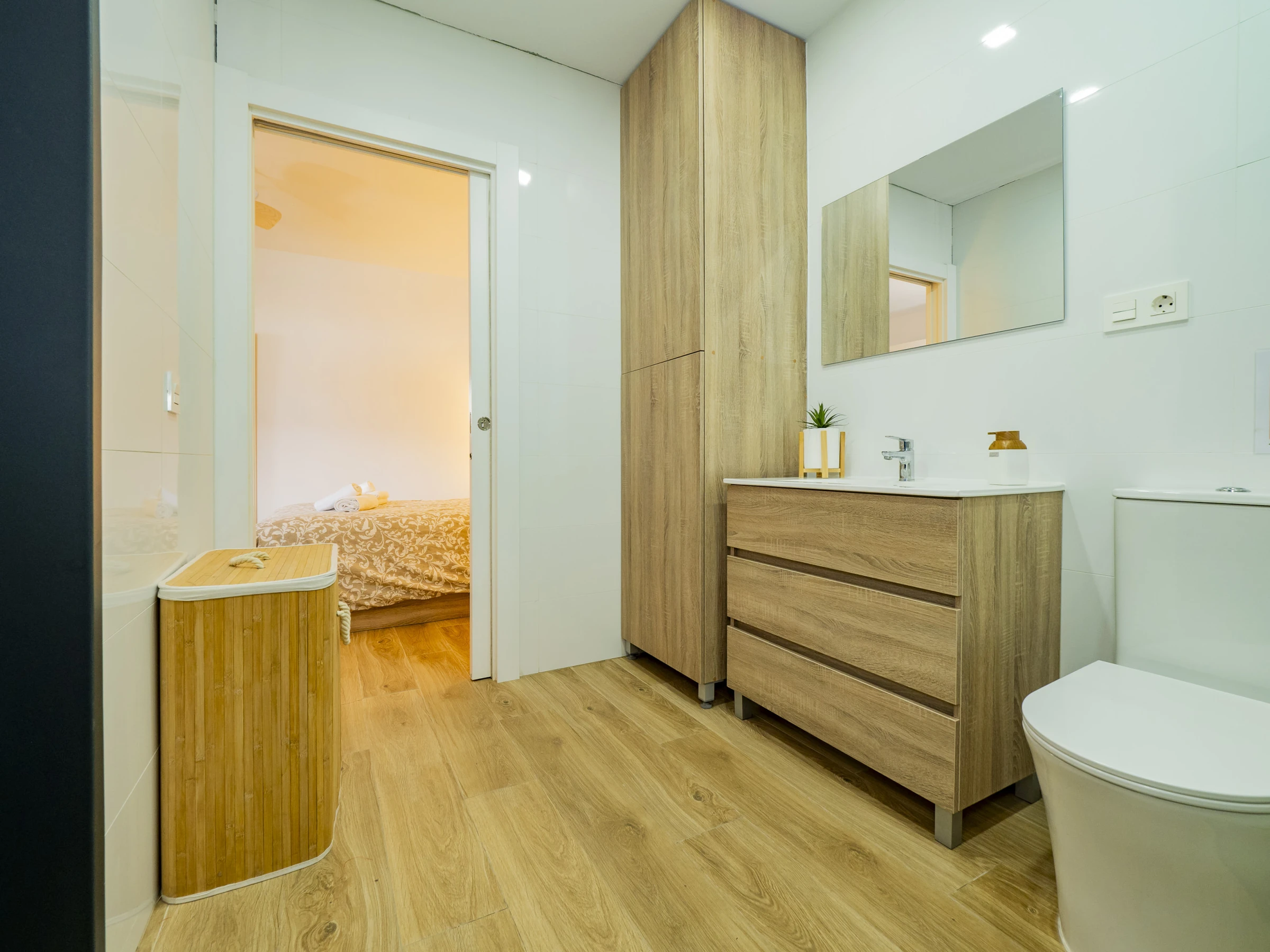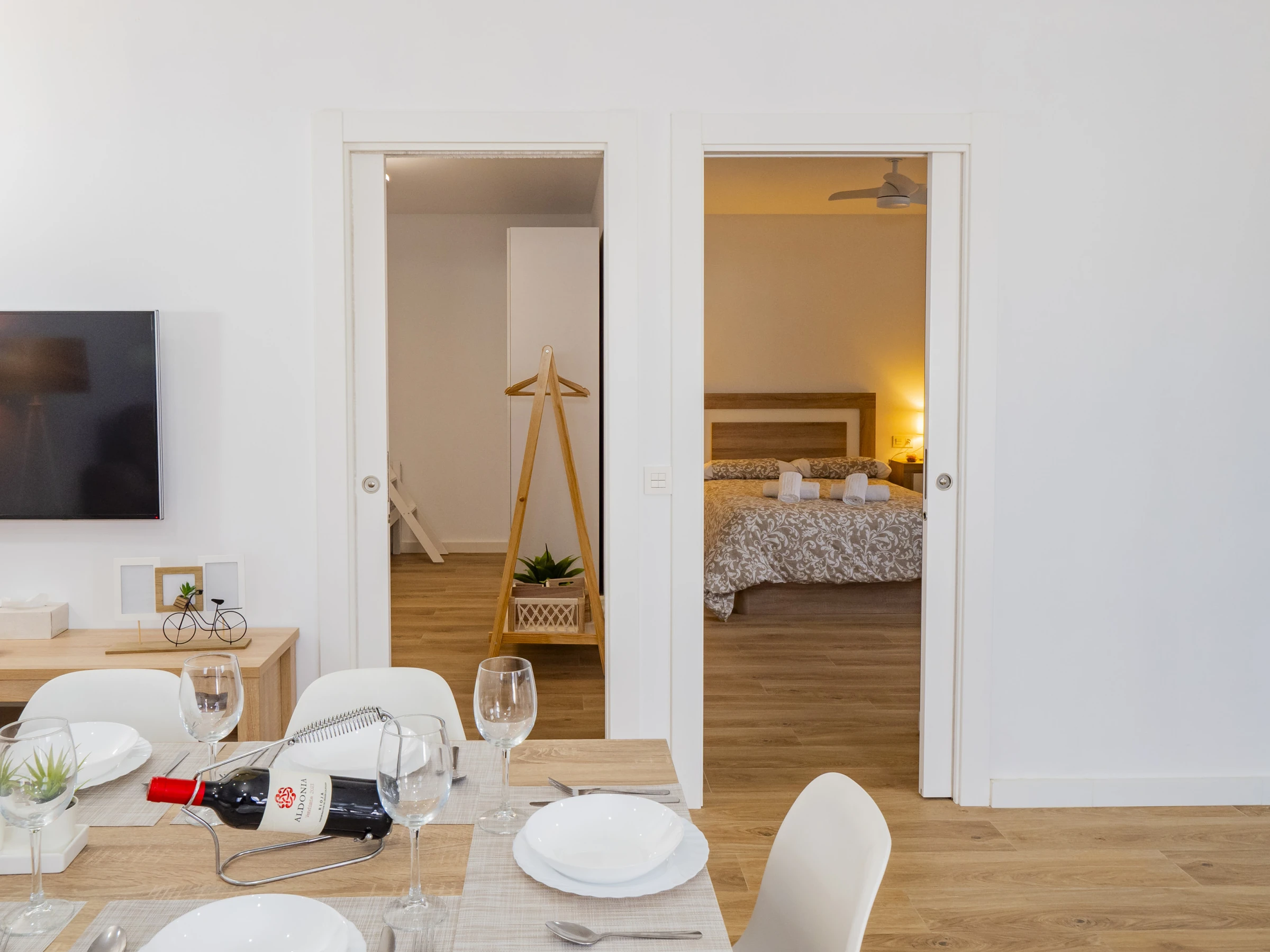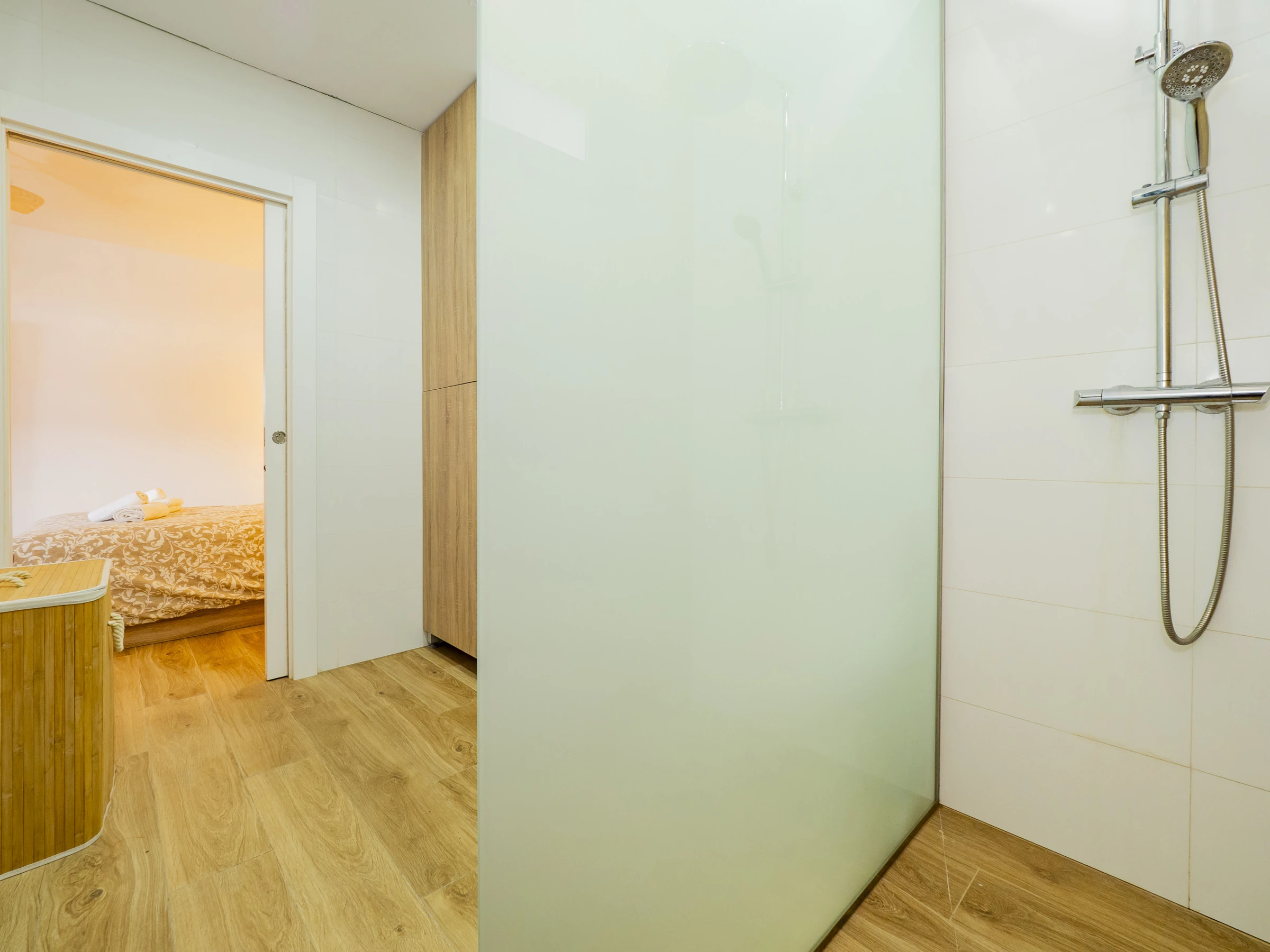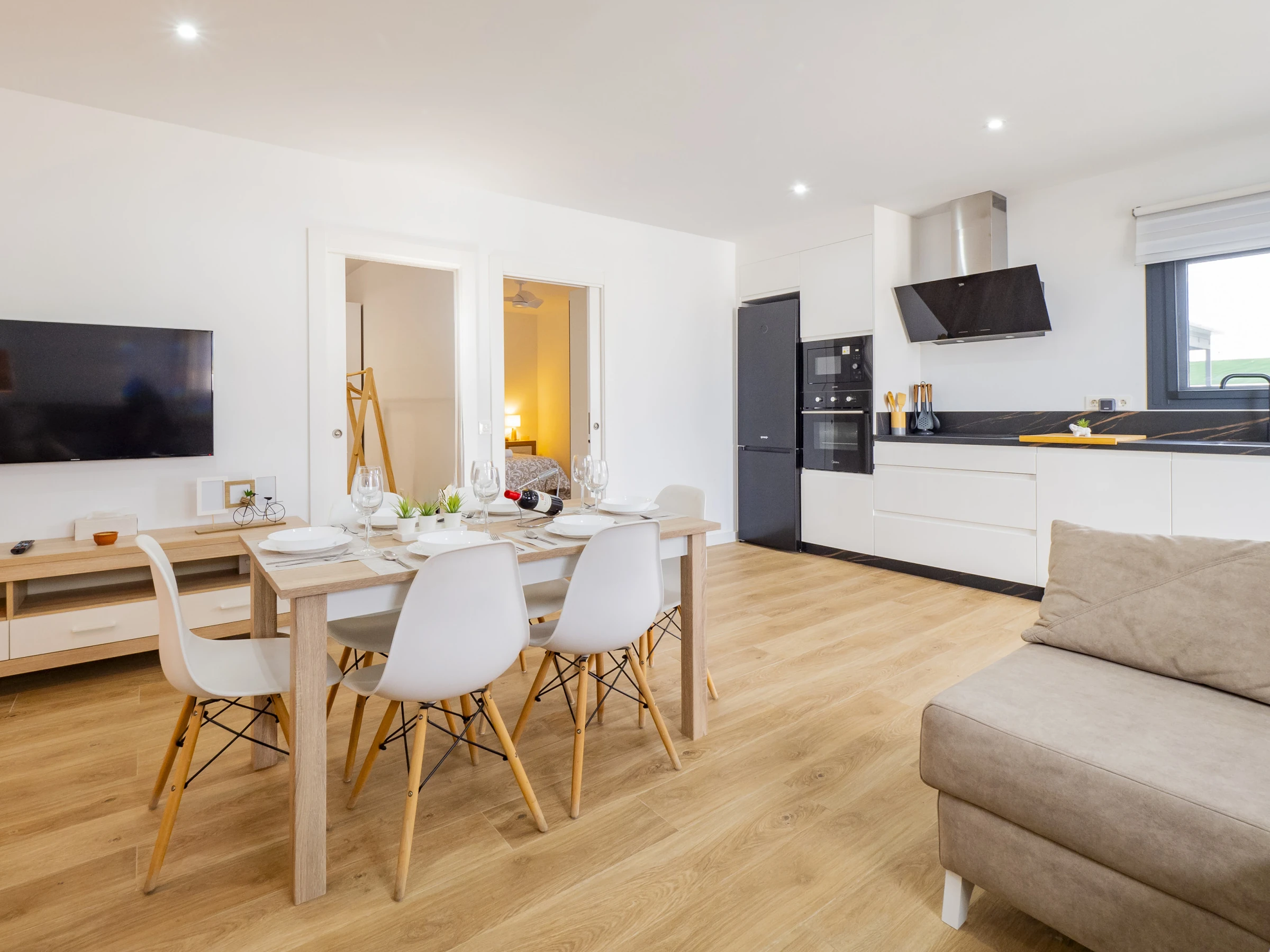 Le logement dispose de deux chambres : l'une avec deux lits superposés spacieux parfaits pour les enfants et l'autre avec un lit de couple pour un repos réparateur. Bien que les chambres ne disposent pas de climatisation, la puissante climatisation du salon-salle à manger et les ventilateurs de plafond garantissent une température agréable. La salle de bain, conçue pour offrir de l'intimité, a un accès direct depuis la chambre principale et une entrée indépendante depuis l'extérieur pour plus de commodité.