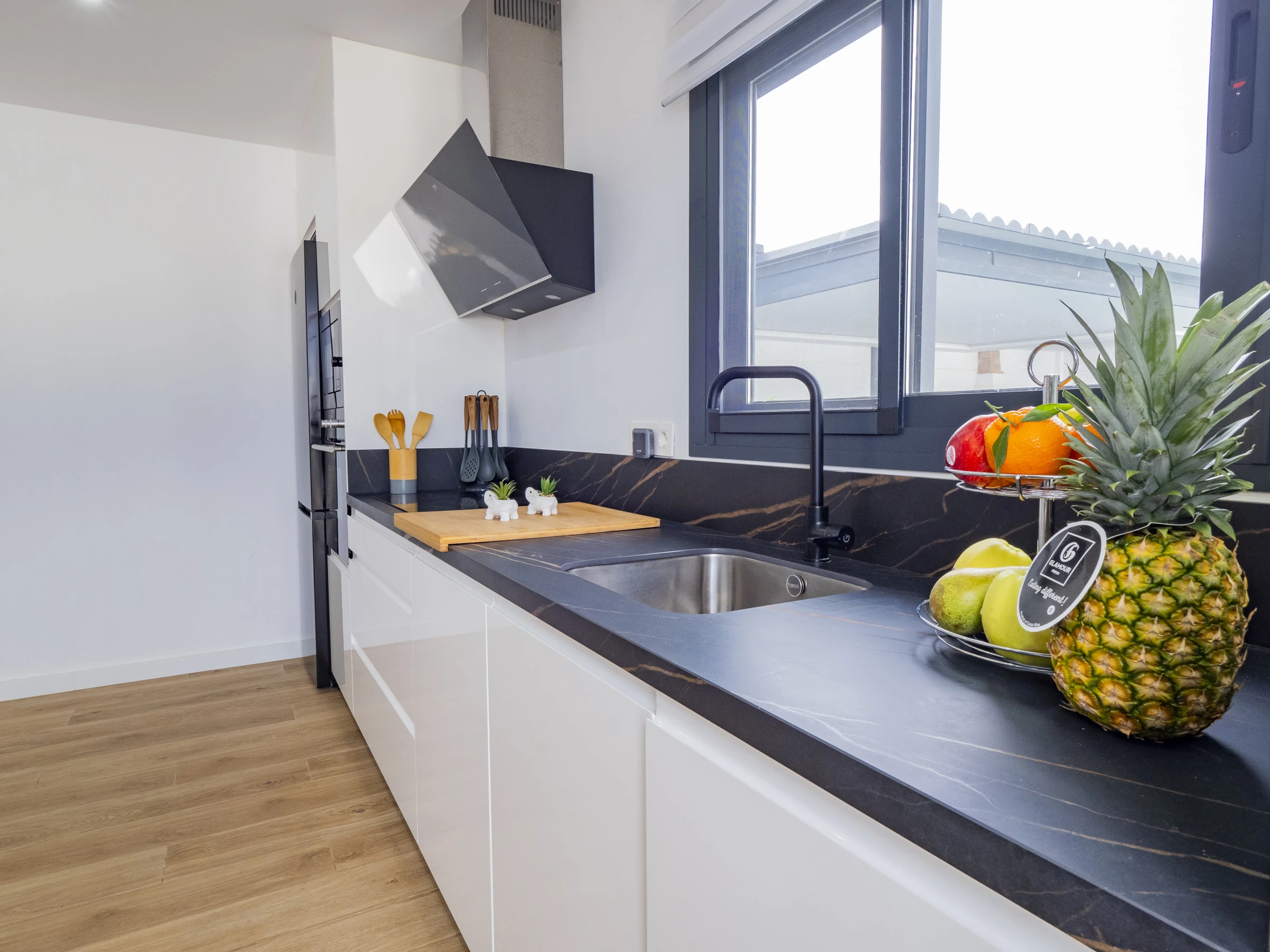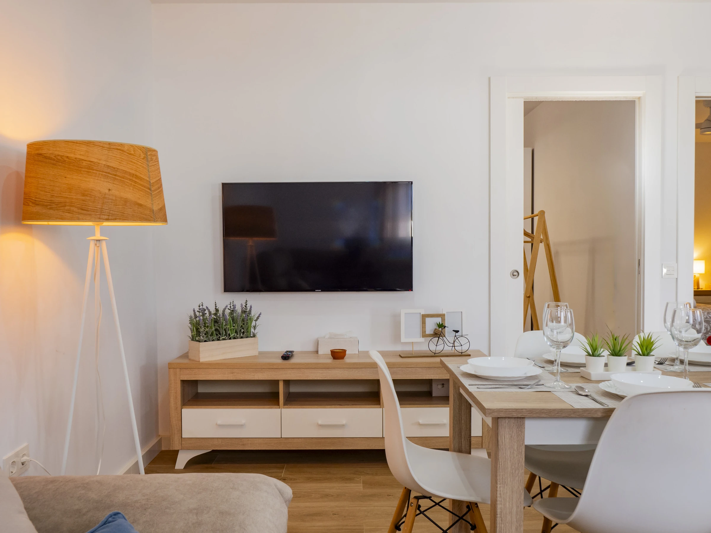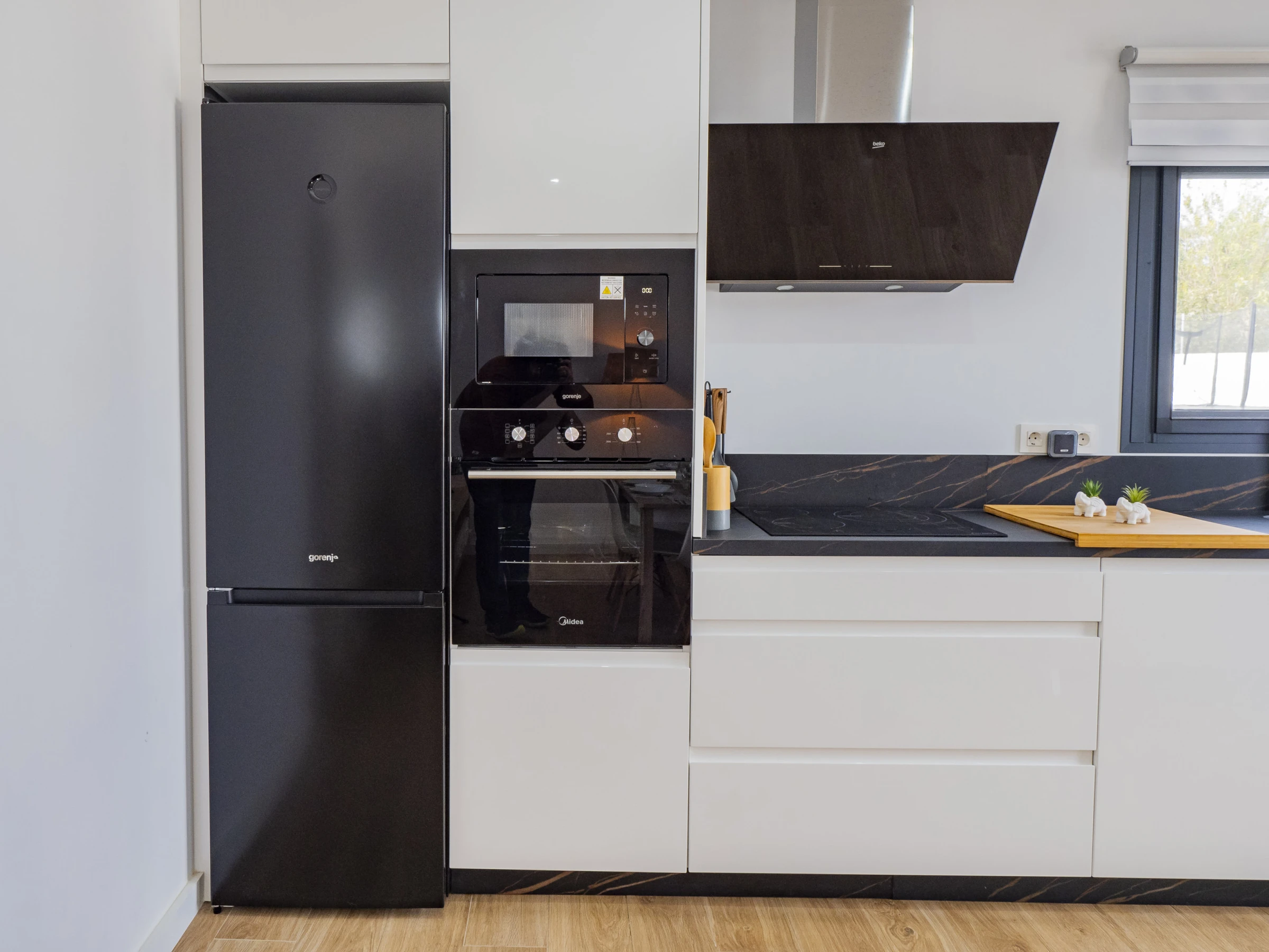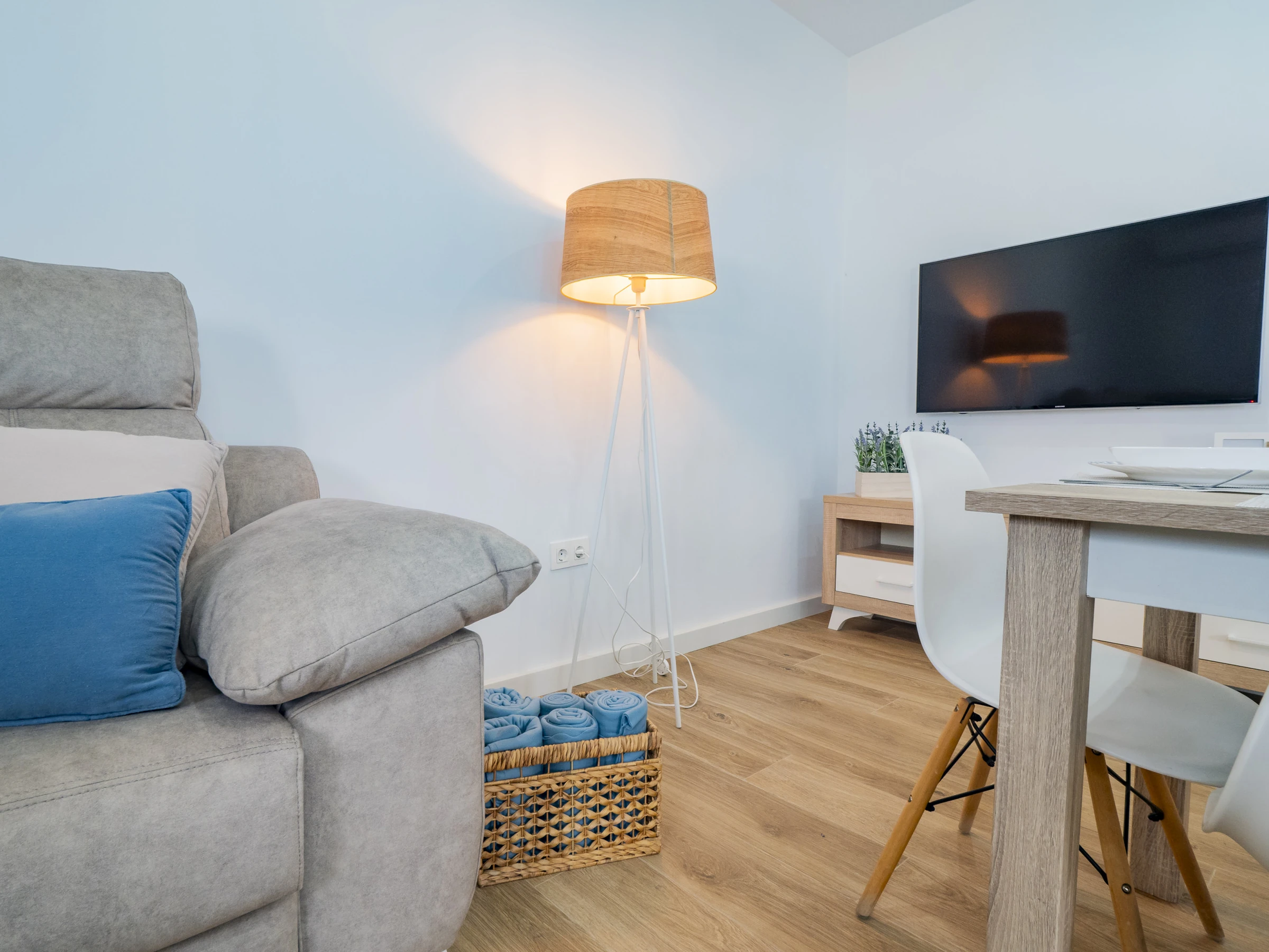 Le logement dispose de deux chambres : l'une avec deux lits superposés spacieux parfaits pour les enfants et l'autre avec un lit de couple pour un repos réparateur. Bien que les chambres ne disposent pas de climatisation, la puissante climatisation du salon-salle à manger et les ventilateurs de plafond garantissent une température agréable. La salle de bain, conçue pour offrir de l'intimité, a un accès direct depuis la chambre principale et une entrée indépendante depuis l'extérieur pour plus de commodité.