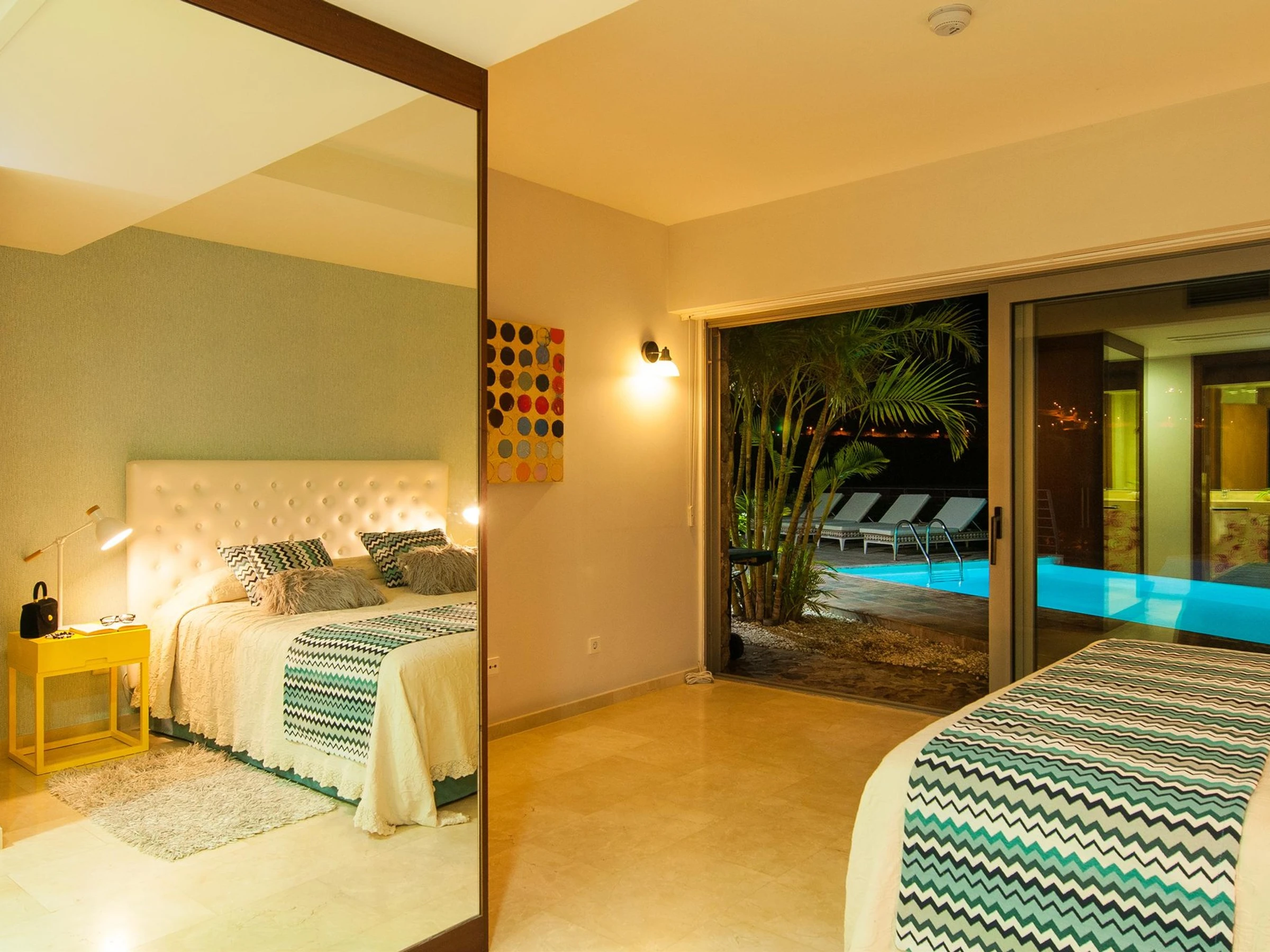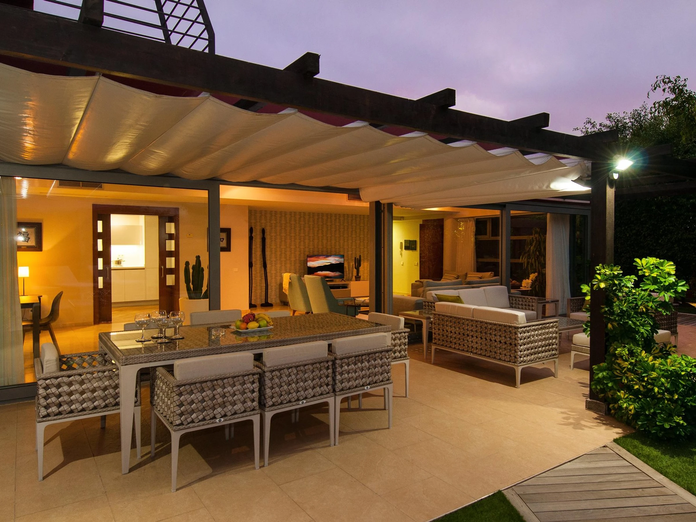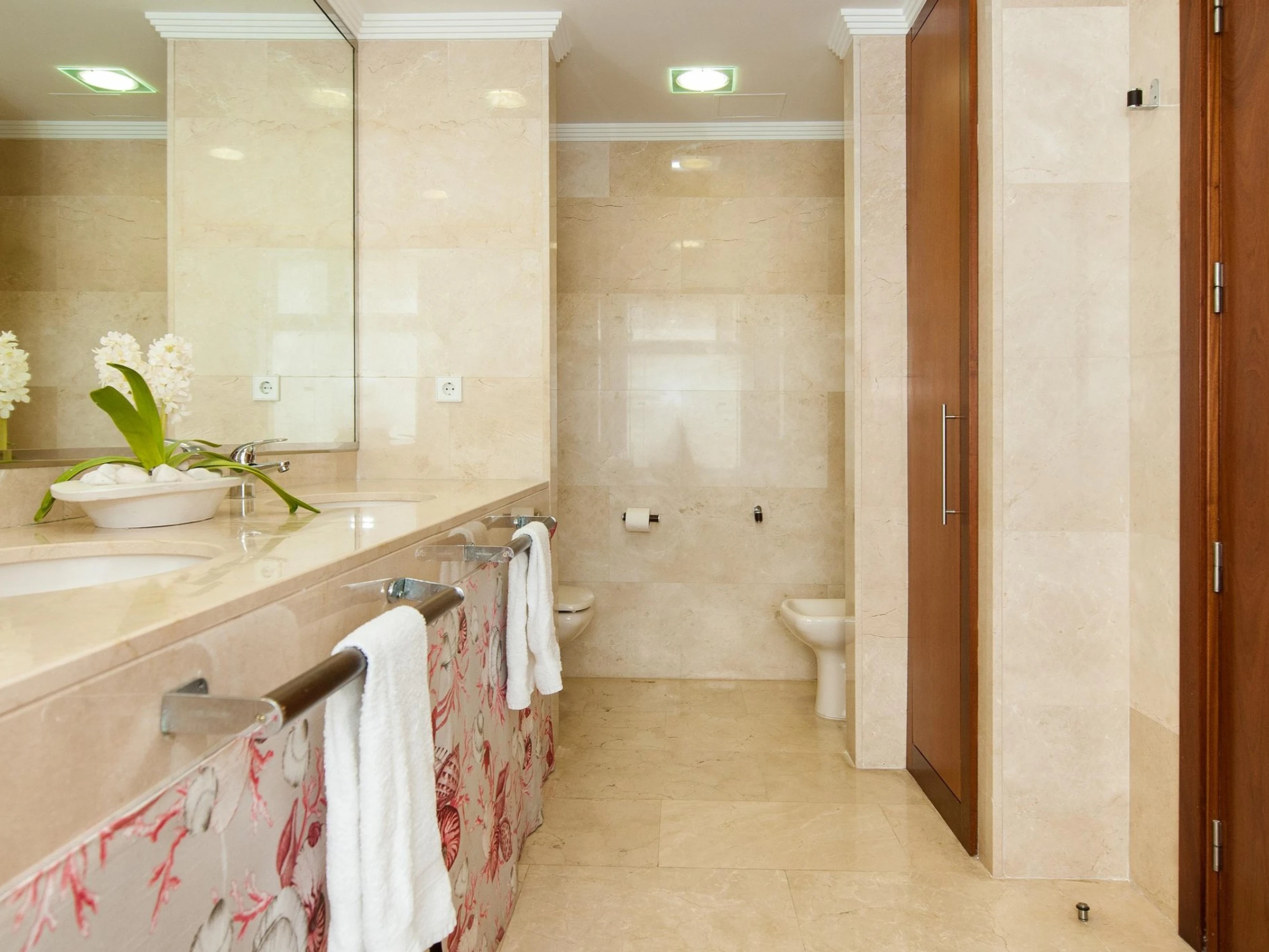 Elle dispose de lave-linge, sèche-linge, barbecue, fer à repasser, coffre-fort, accès internet, balcon, climatisation, piscine collective, piscine chauffée privée, 1 Télévision.
