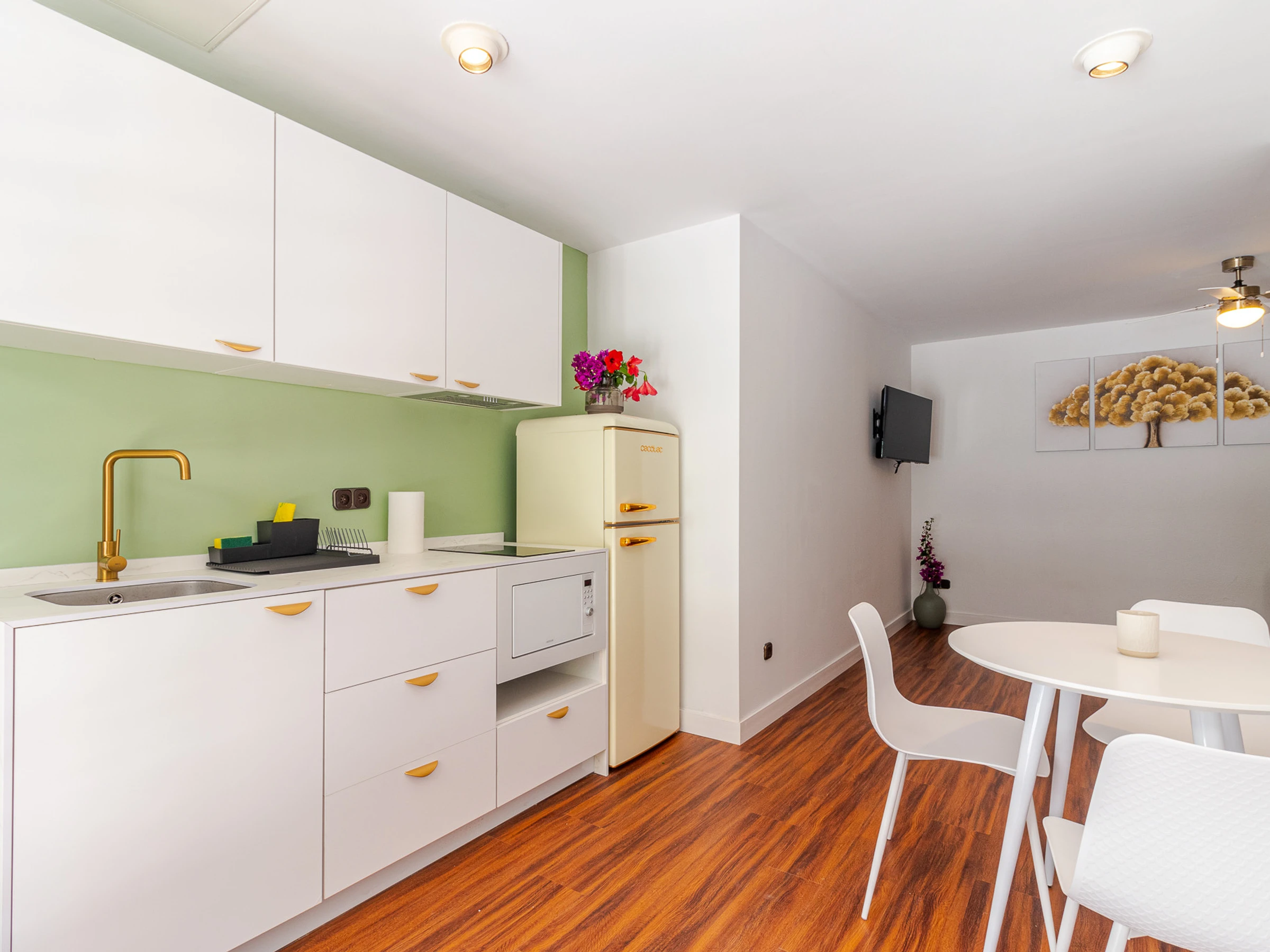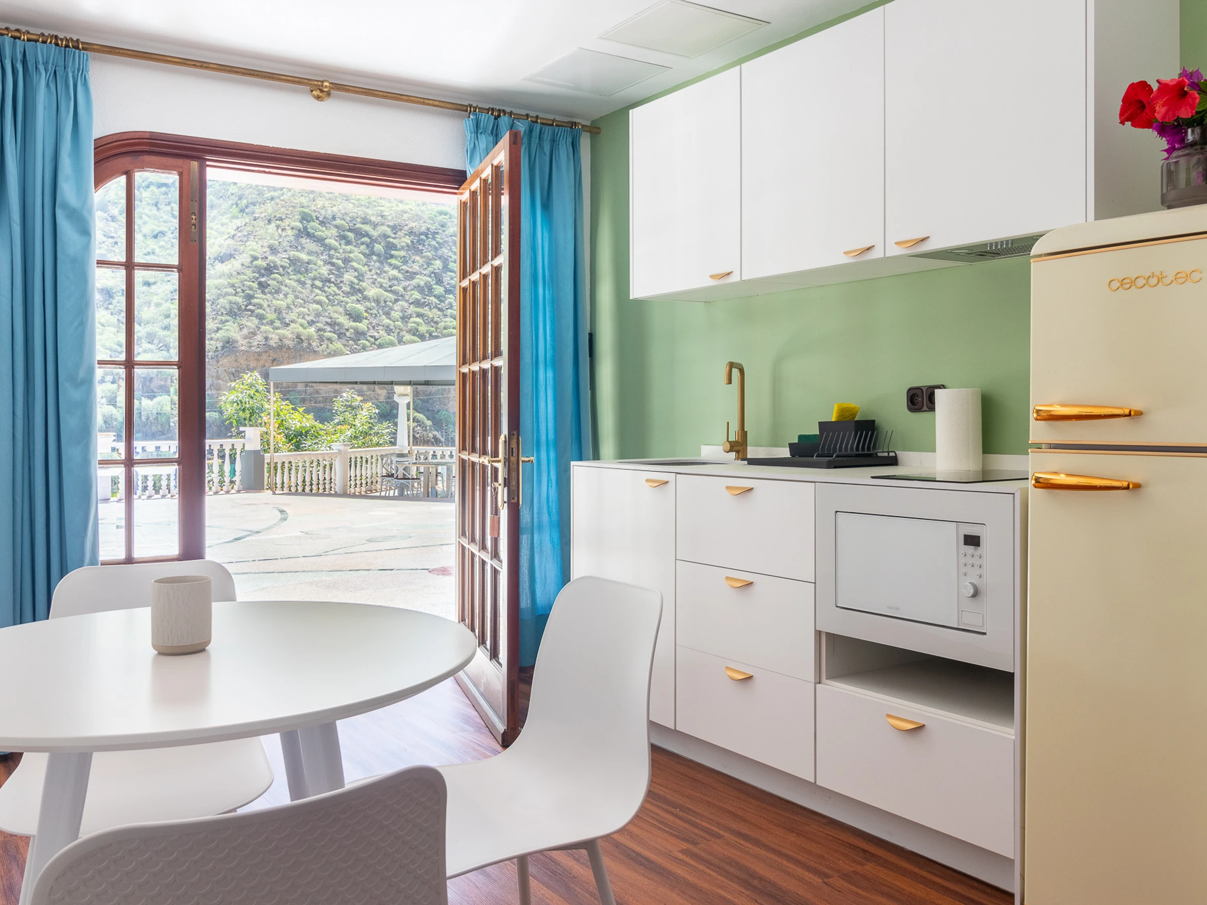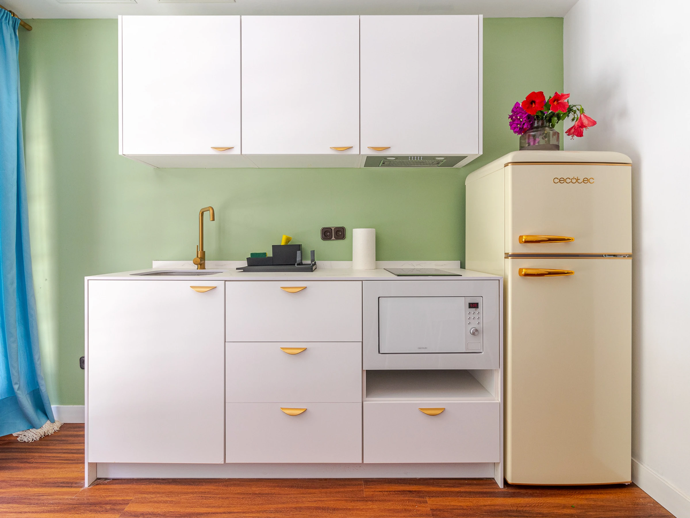 La cuisine américaine, à vitrocéramique, est équipée avec réfrigérateur, micro-ondes, congélateur, vaisselle/couverts, ustensiles/cuisine et cafetière.