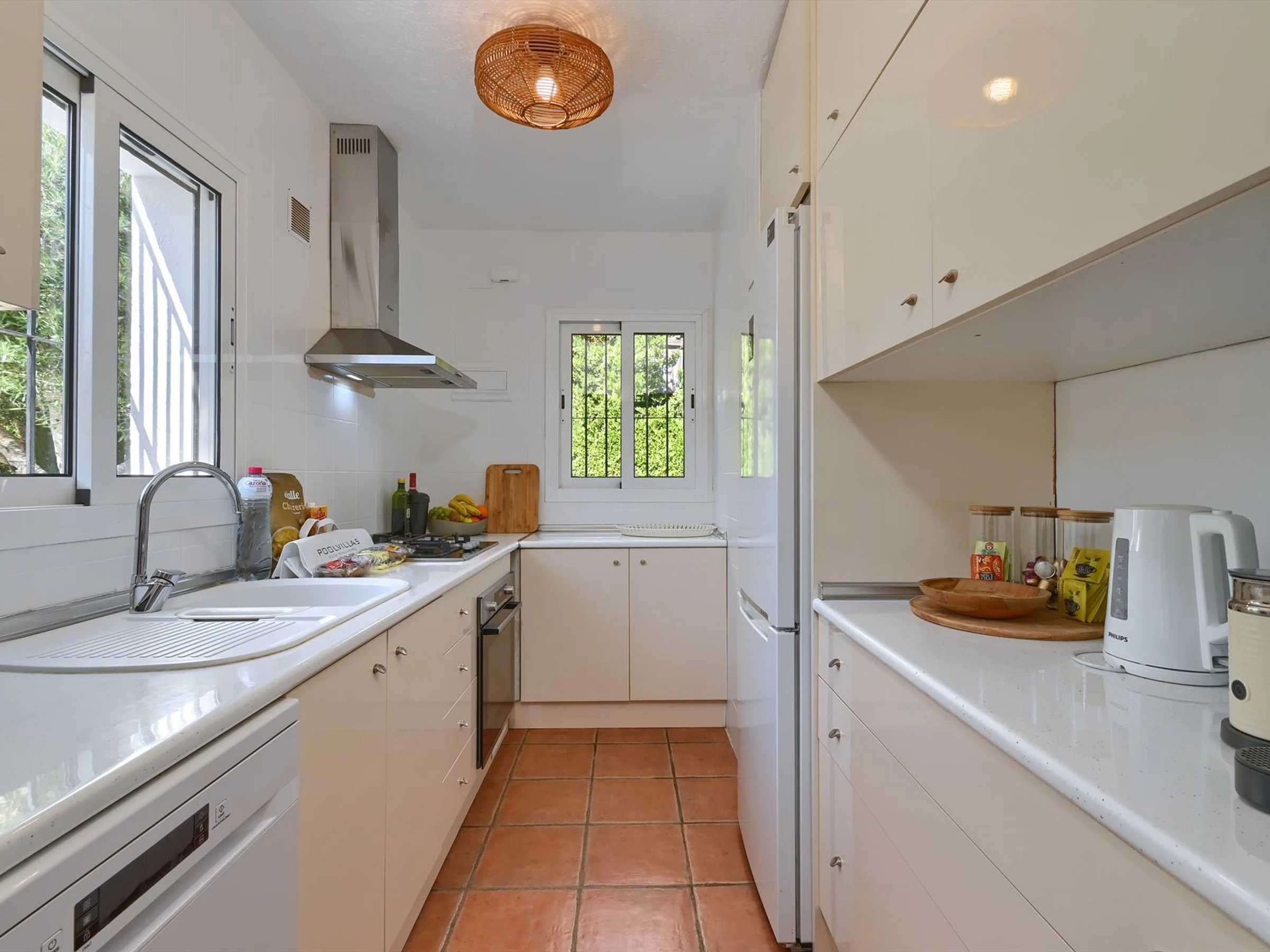 La cuisine, est équipée avec four, congélateur, lave-vaisselle, cafetière et grille pain.