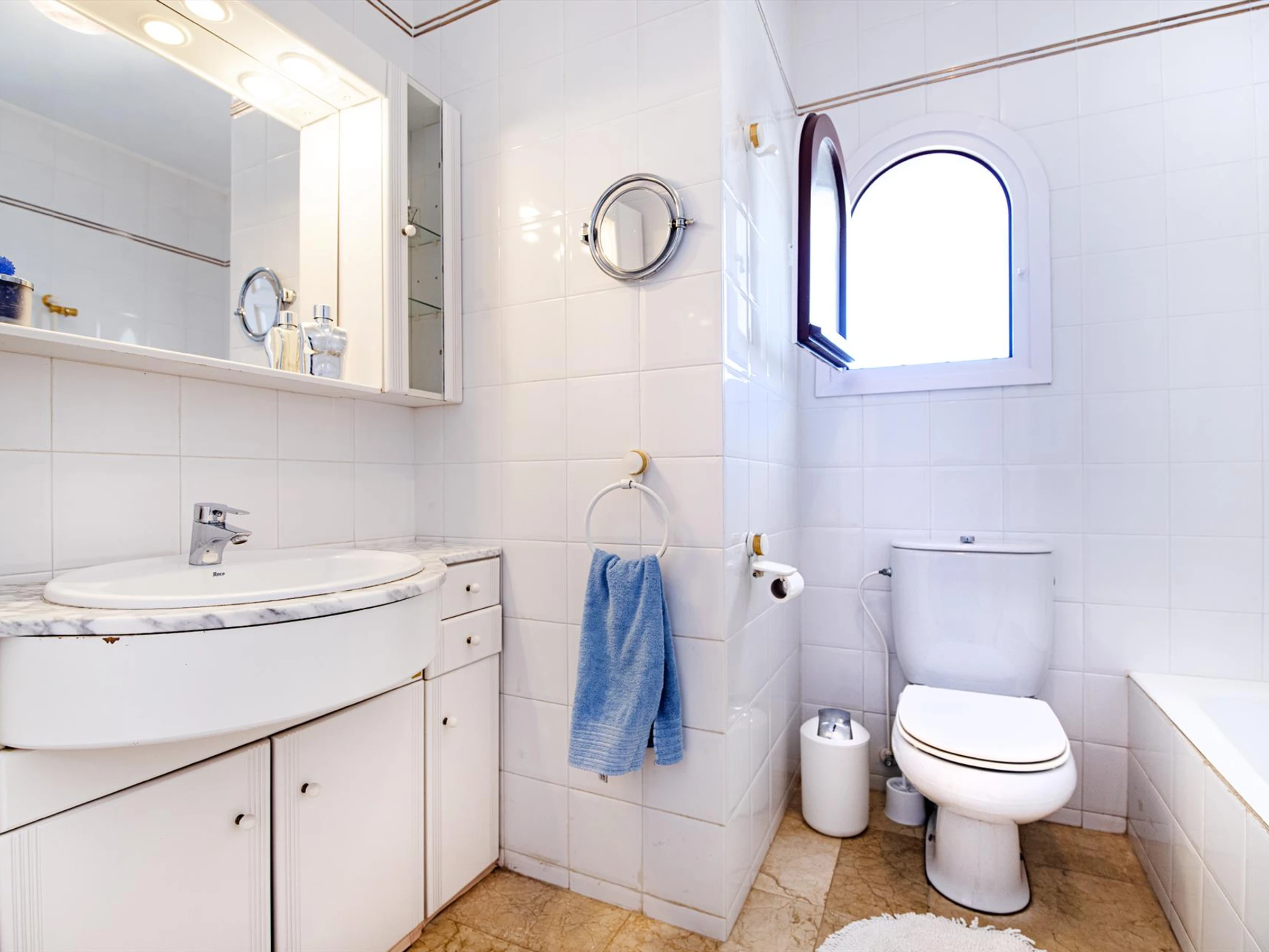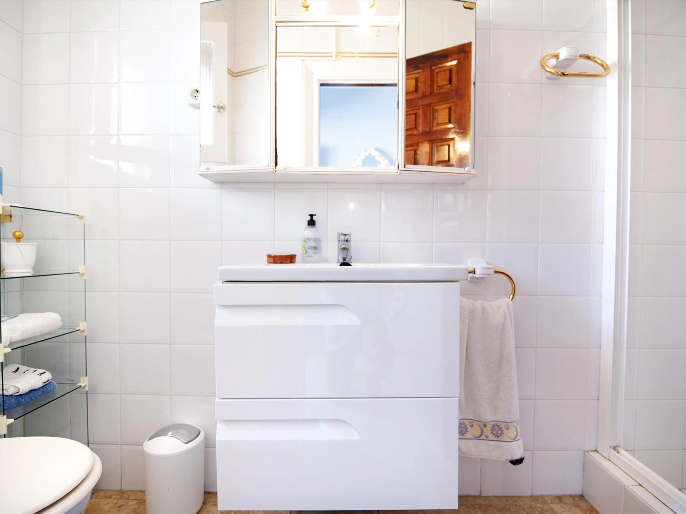 * salle de bain avec lavabo simple, douche et toilette Extérieur de la villa