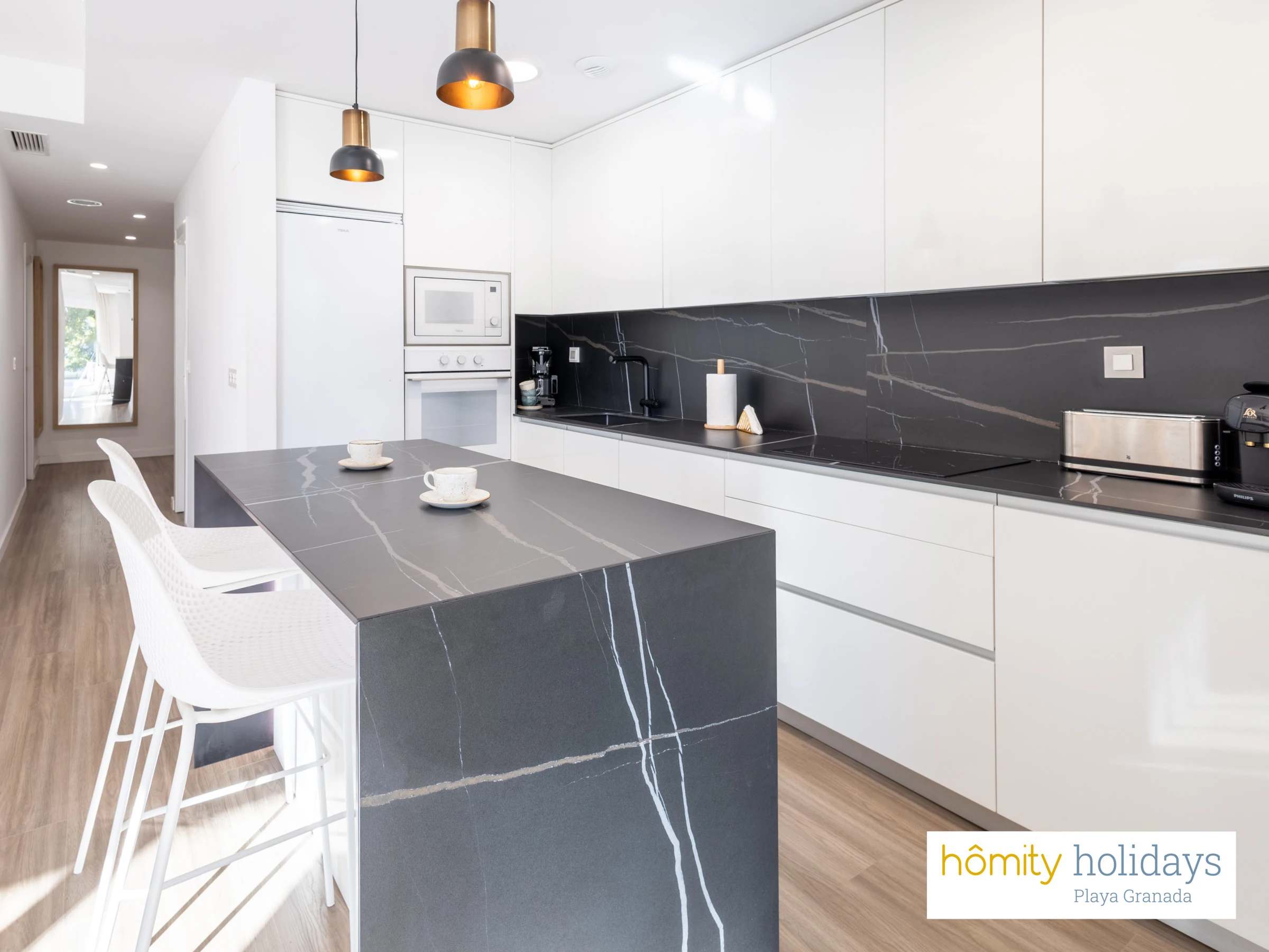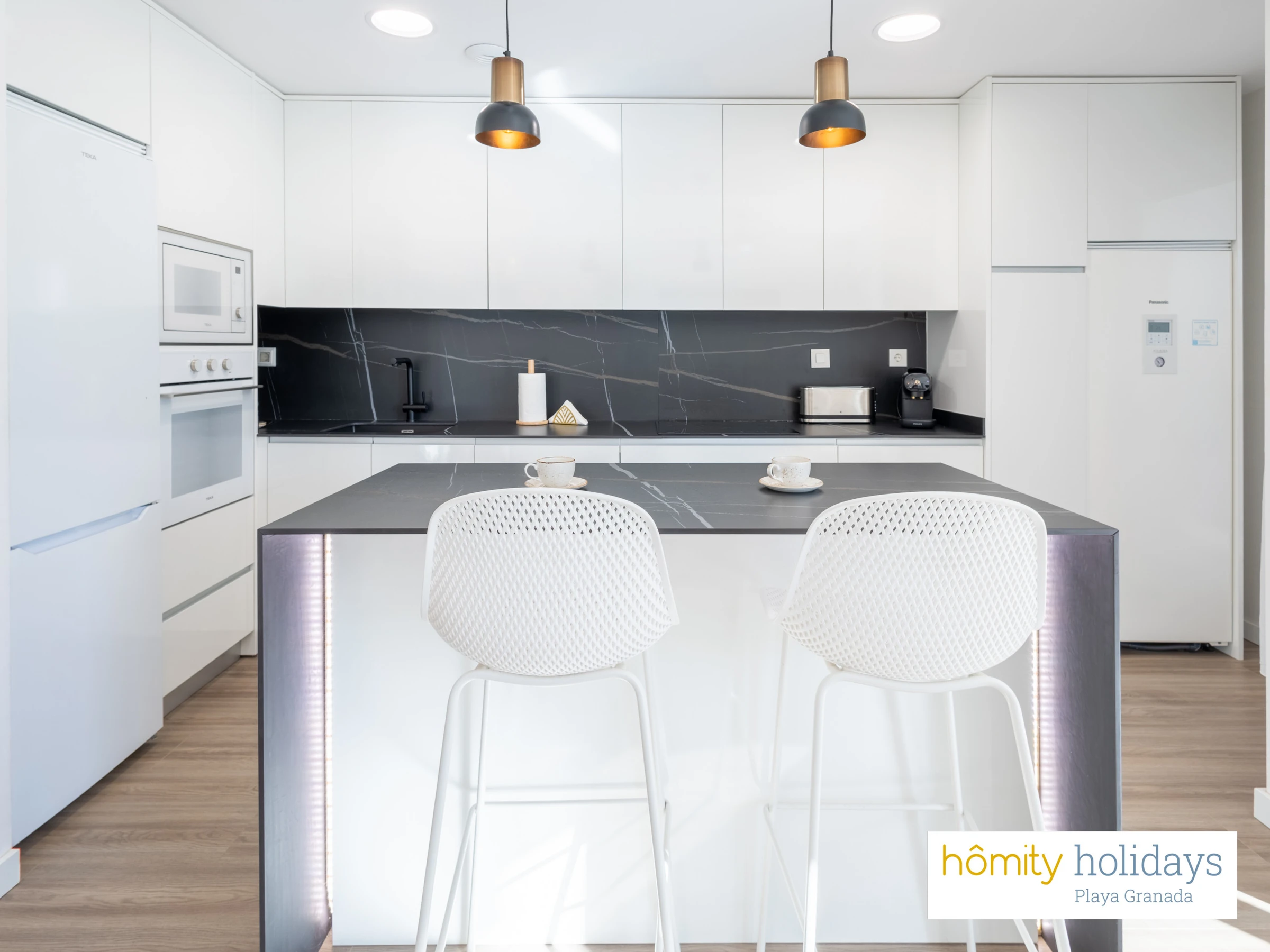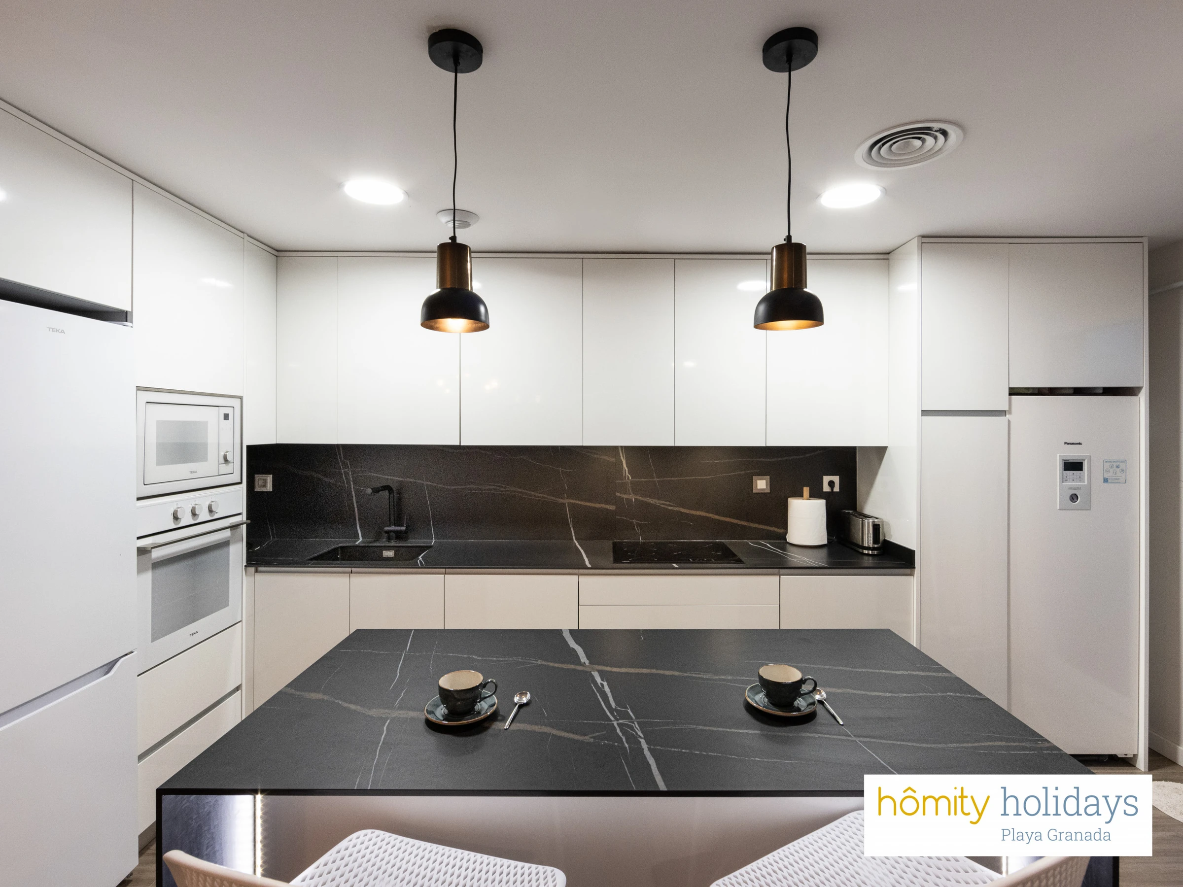 La cuisine américaine, à induction, est équipée avec réfrigérateur, micro-ondes, four, congélateur, lave-vaisselle, vaisselle/couverts, ustensiles/cuisine, cafetière, grille pain, bouilloire et presse-agrumes.