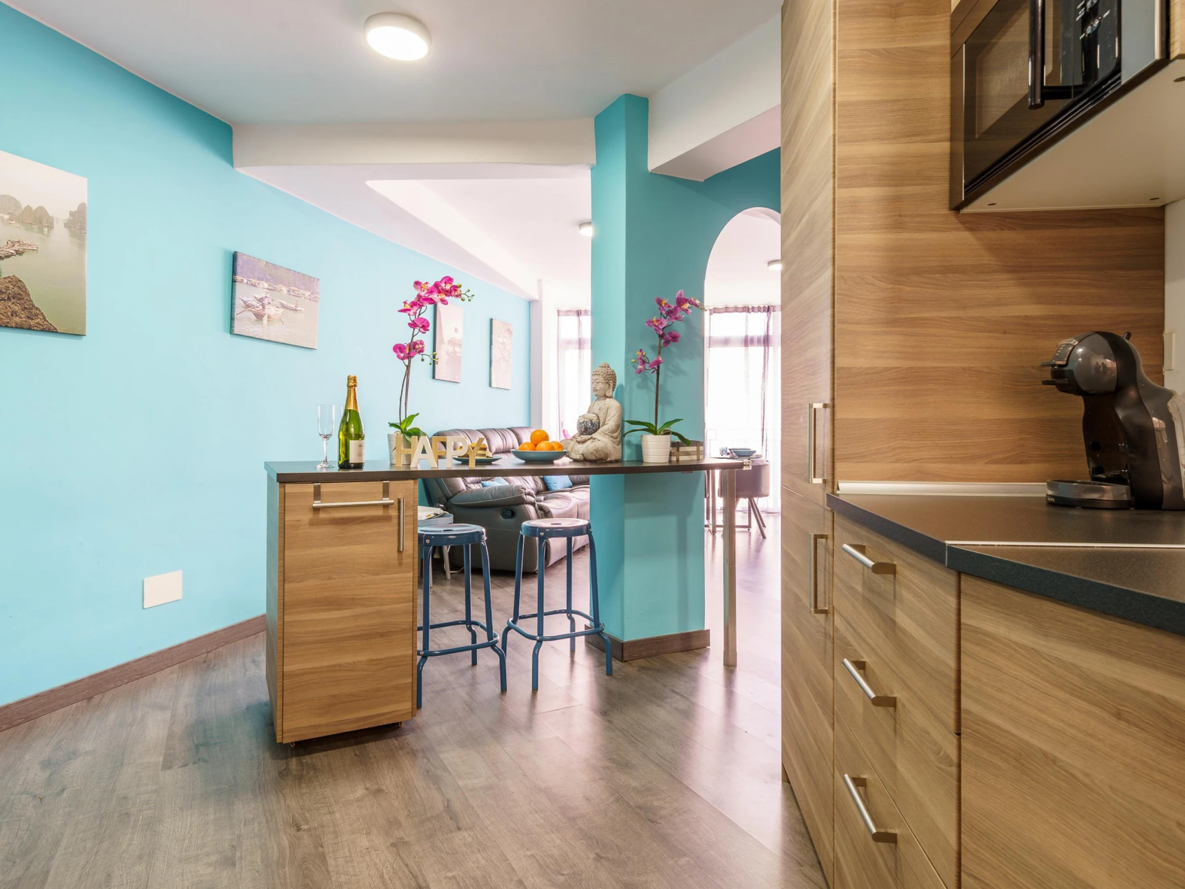 La cuisine, est équipée avec micro-ondes, congélateur, lave-vaisselle, cafetière et grille pain.