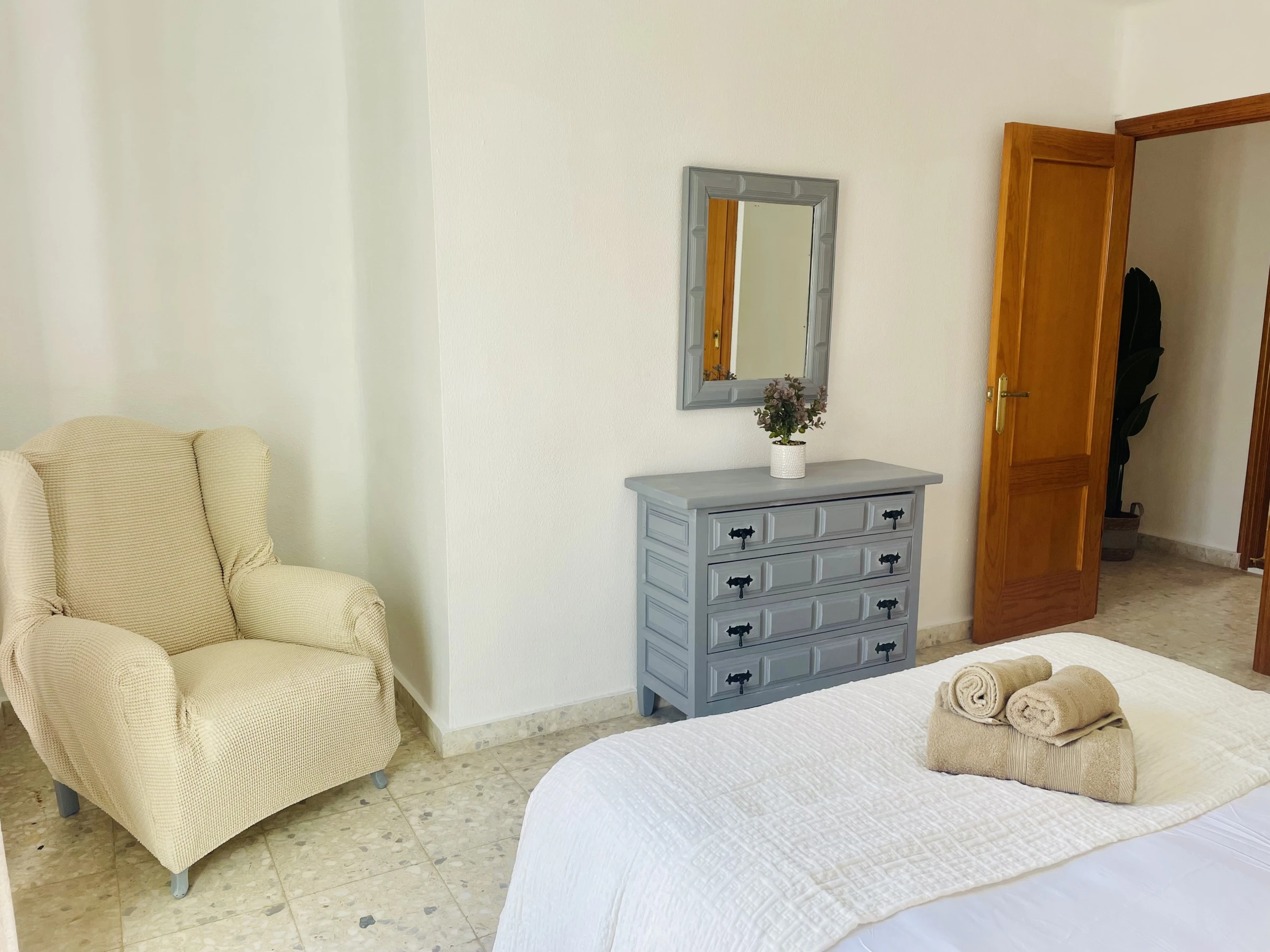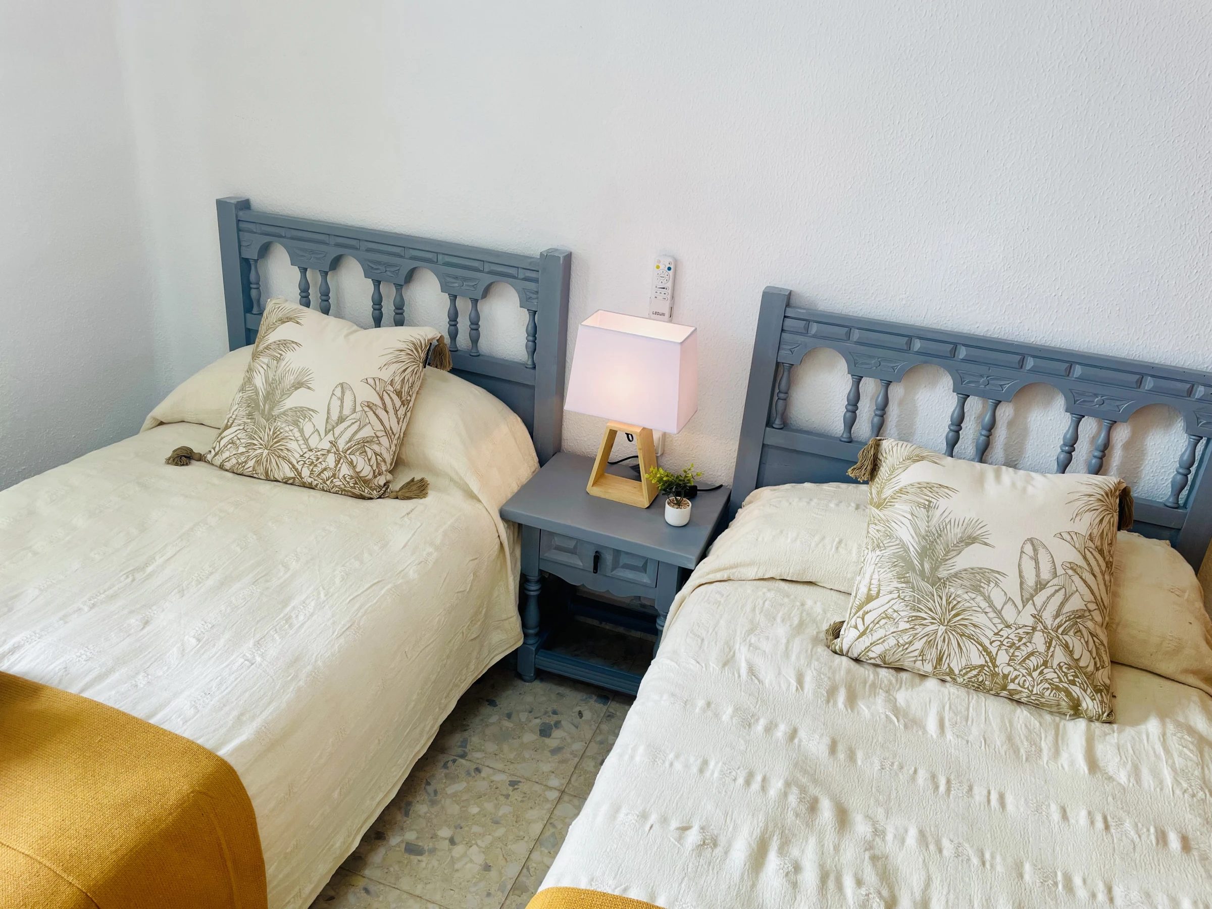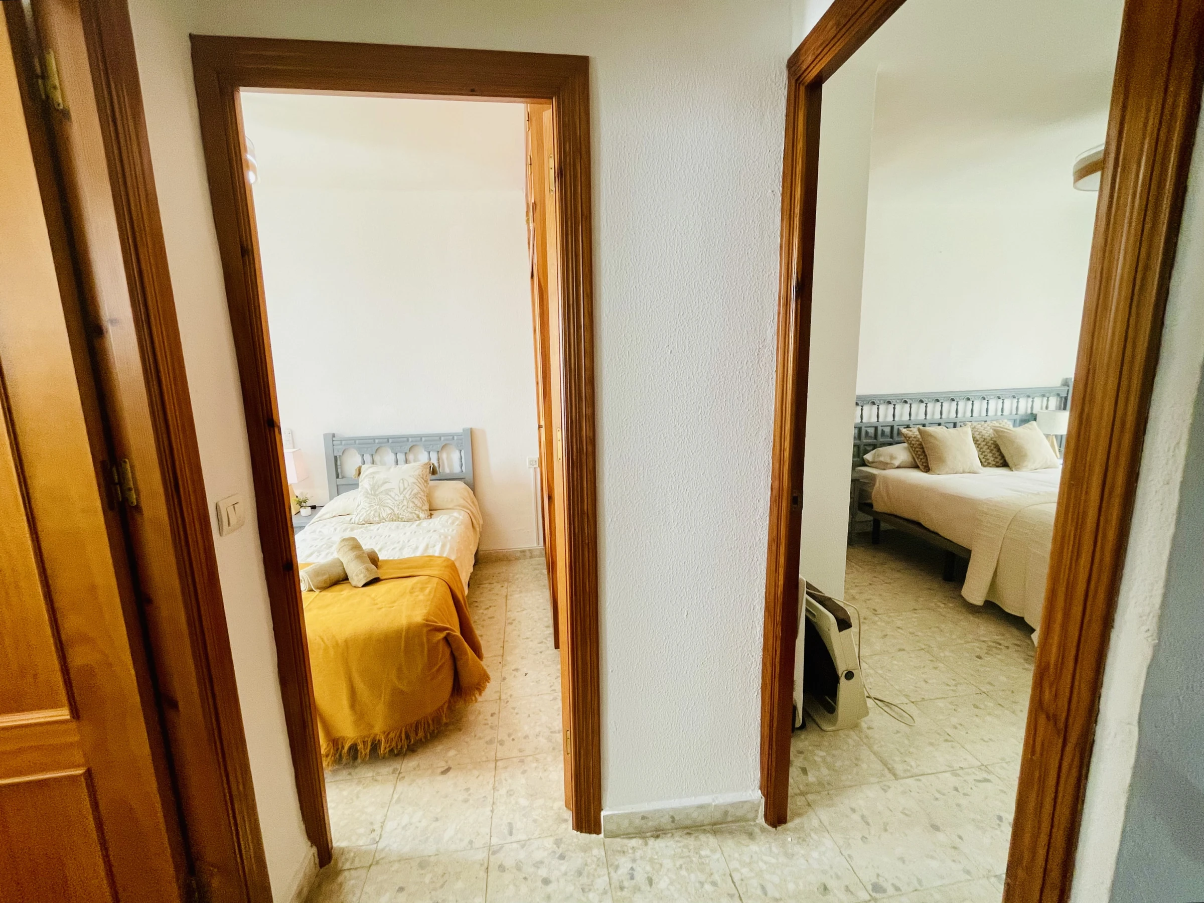 À l’étage supérieur, il y a deux chambres, toutes deux avec placards intégrés, ventilateurs de plafond et accès à une terrasse, idéales pour profiter de l’extérieur.