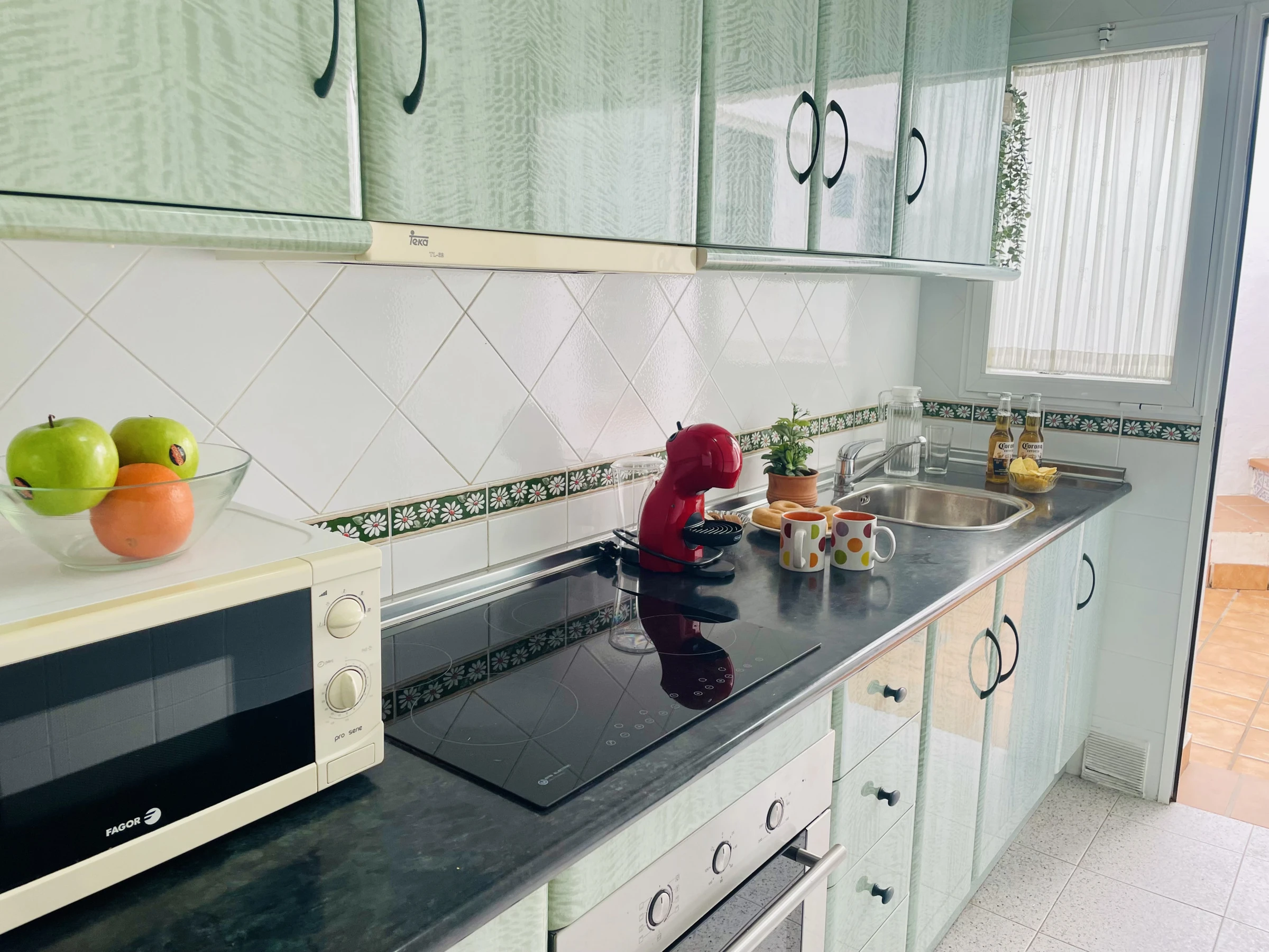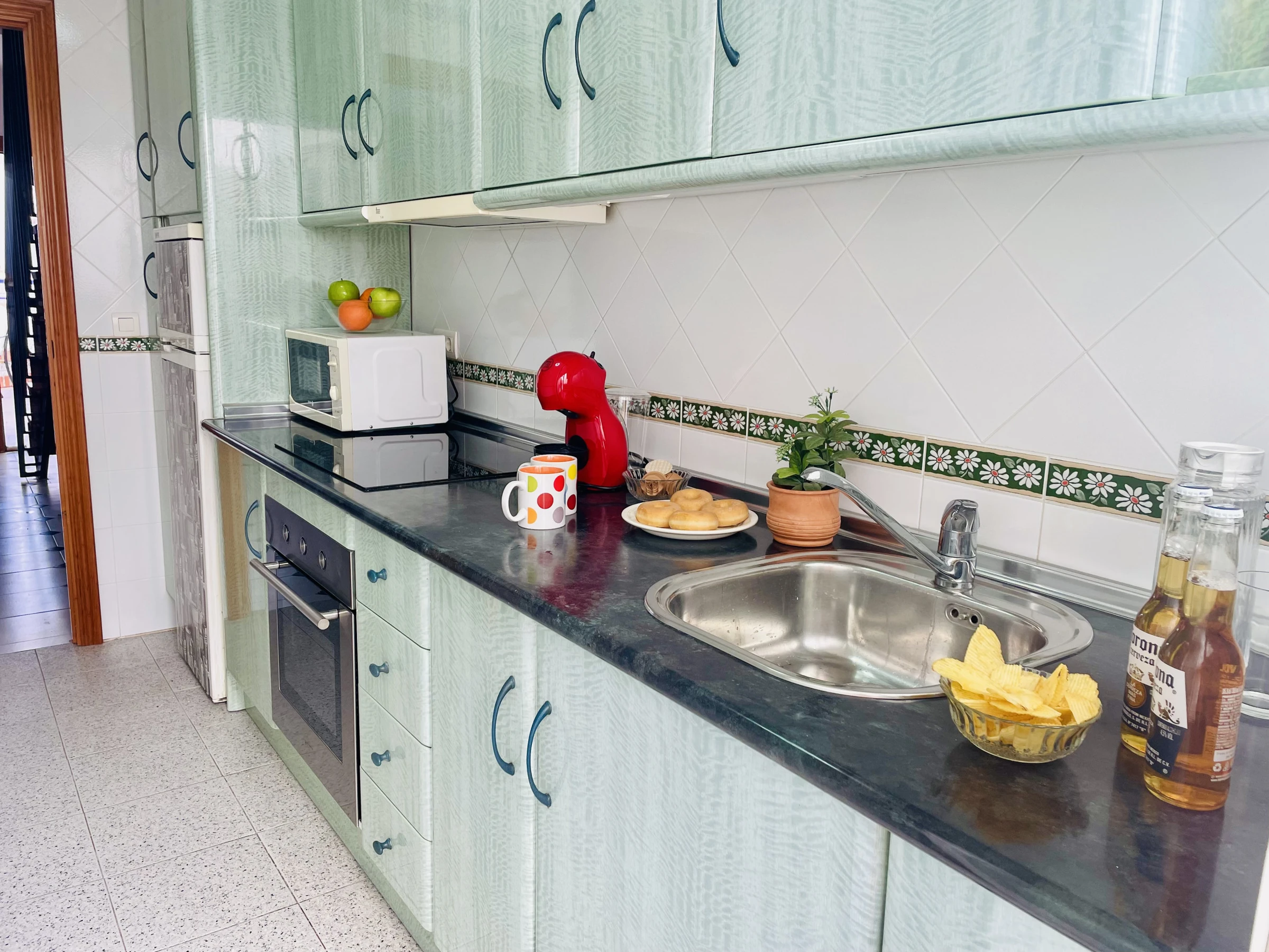 La cuisine indépendante est entièrement équipée avec plaque vitrocéramique, four, réfrigérateur, cafetière à capsules et tout le nécessaire pour cuisiner confortablement pendant votre séjour.