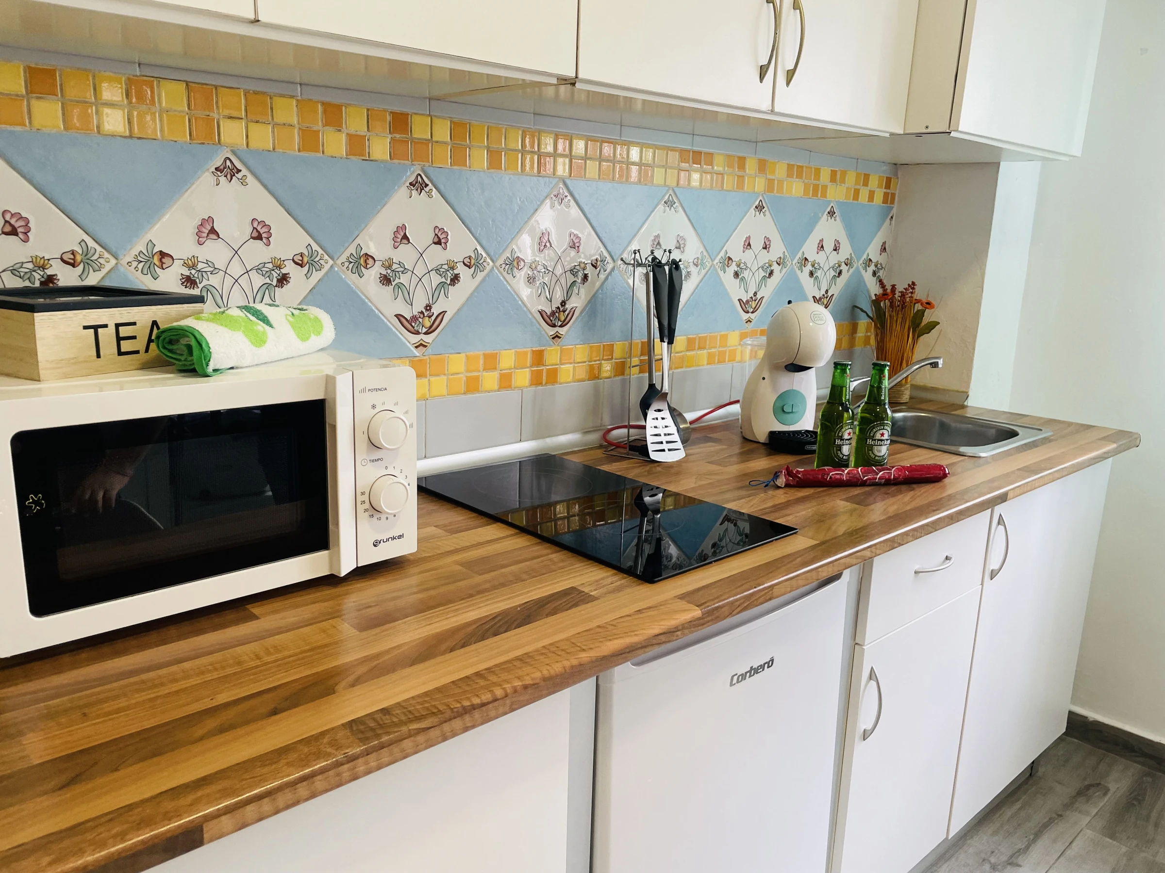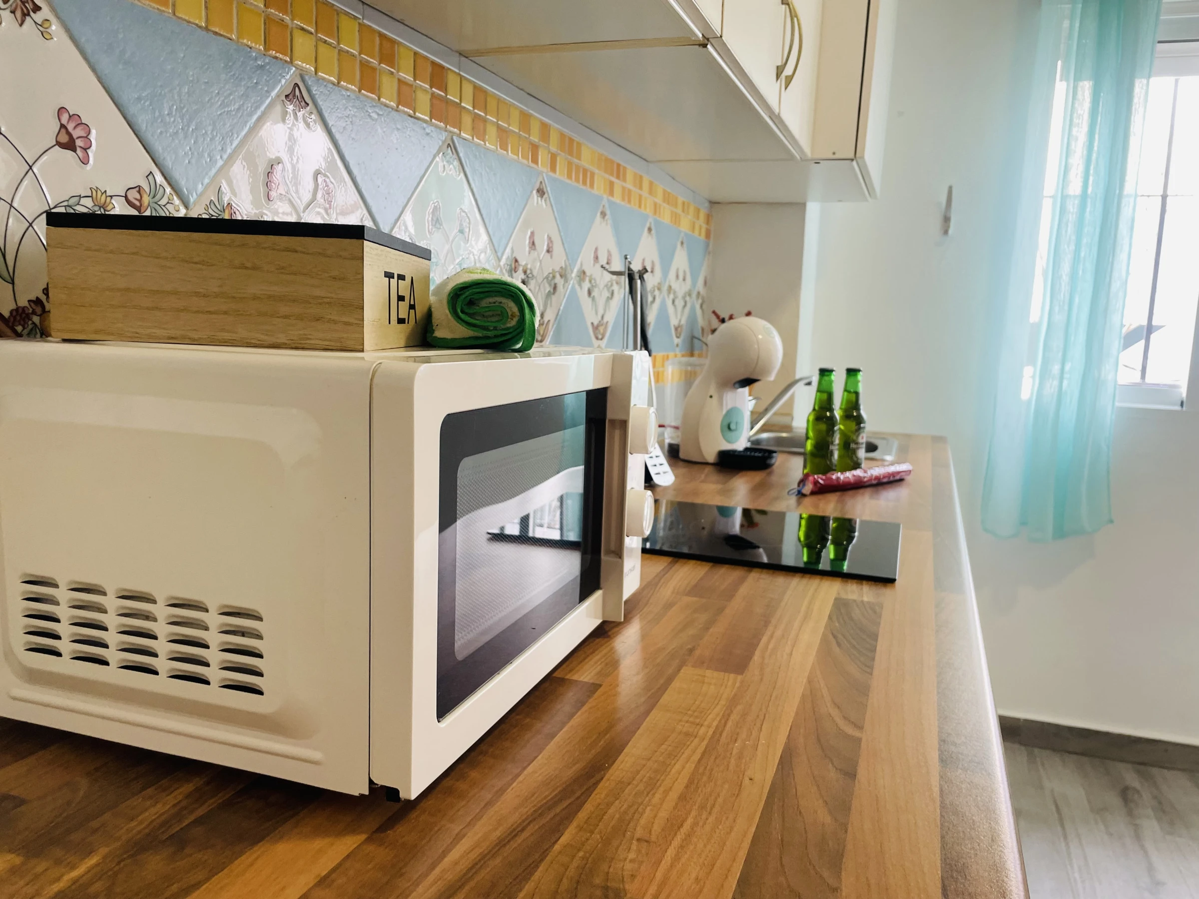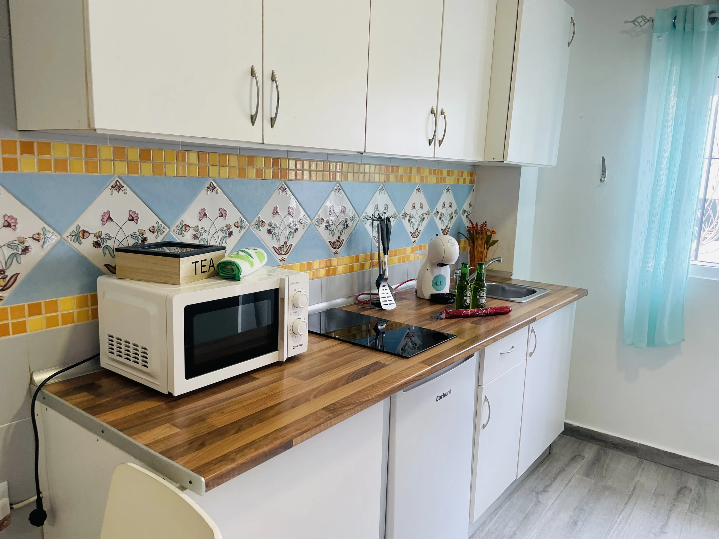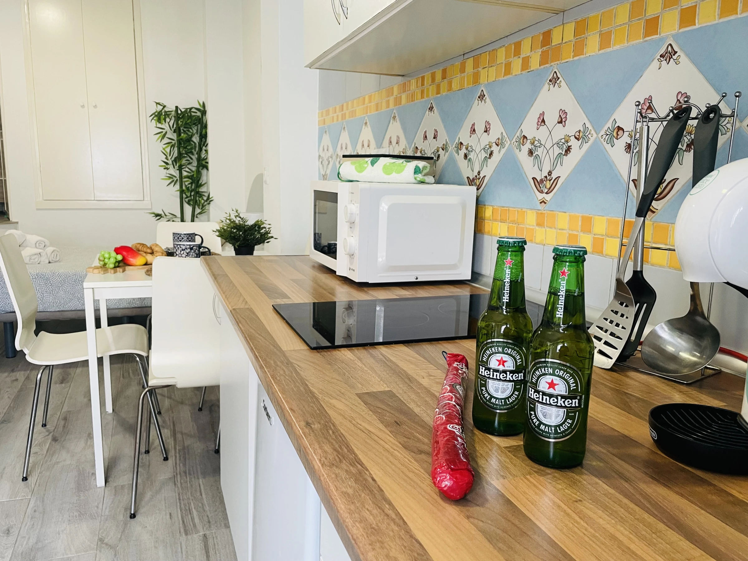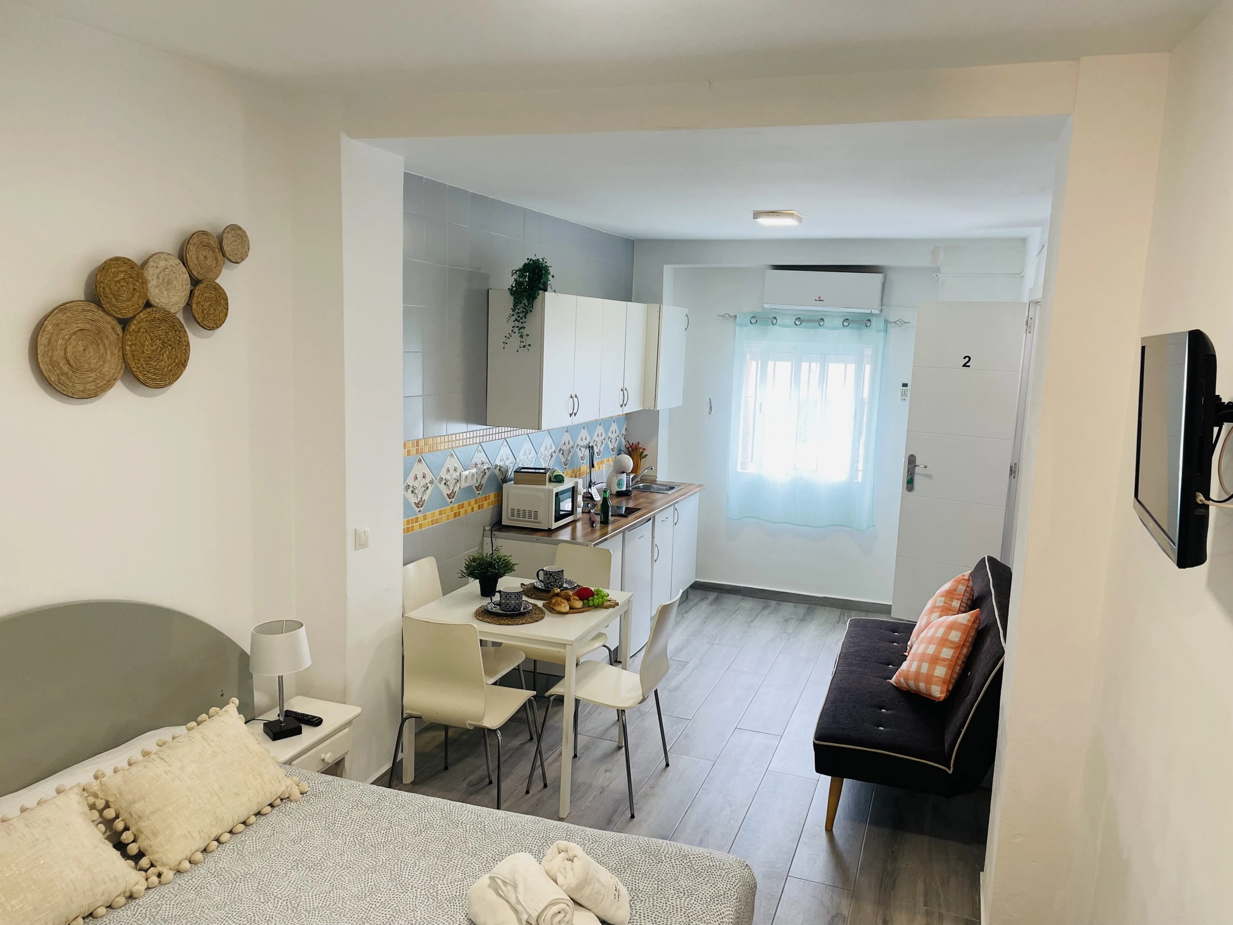 Le coquet studio dispose d'une TV, d'une petite cuisine entièrement équipée avec plaque vitrocéramique, micro-ondes, réfrigérateur, cafetière à capsules, bouilloire et ustensiles de cuisine, un lit double, un canapé-lit, draps, serviettes, wifi, climatisation et tout ce qui est nécessaire pour passer de merveilleuses vacances.