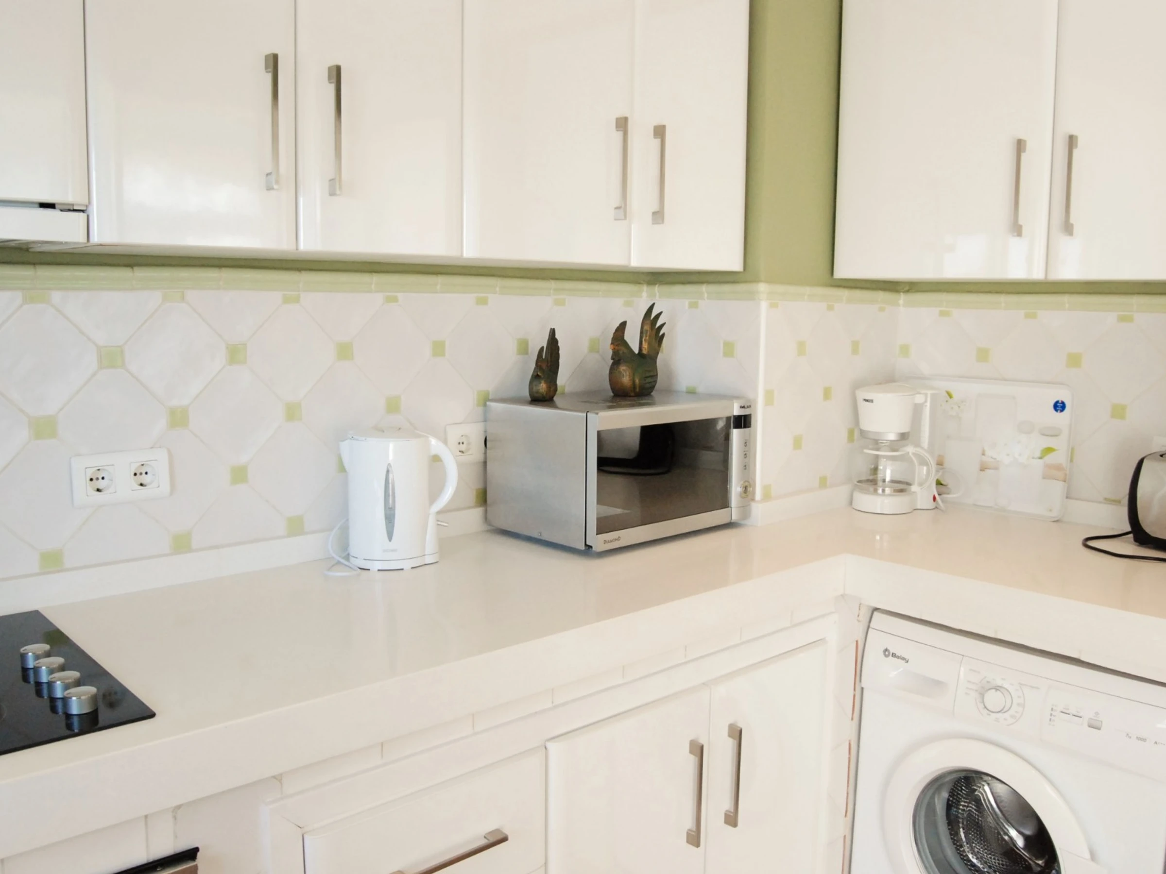 La cuisine américaine, à vitrocéramique, est équipée avec réfrigérateur, micro-ondes, four, congélateur, lave-vaisselle, vaisselle/couverts, ustensiles/cuisine, cafetière, grille pain et bouilloire.