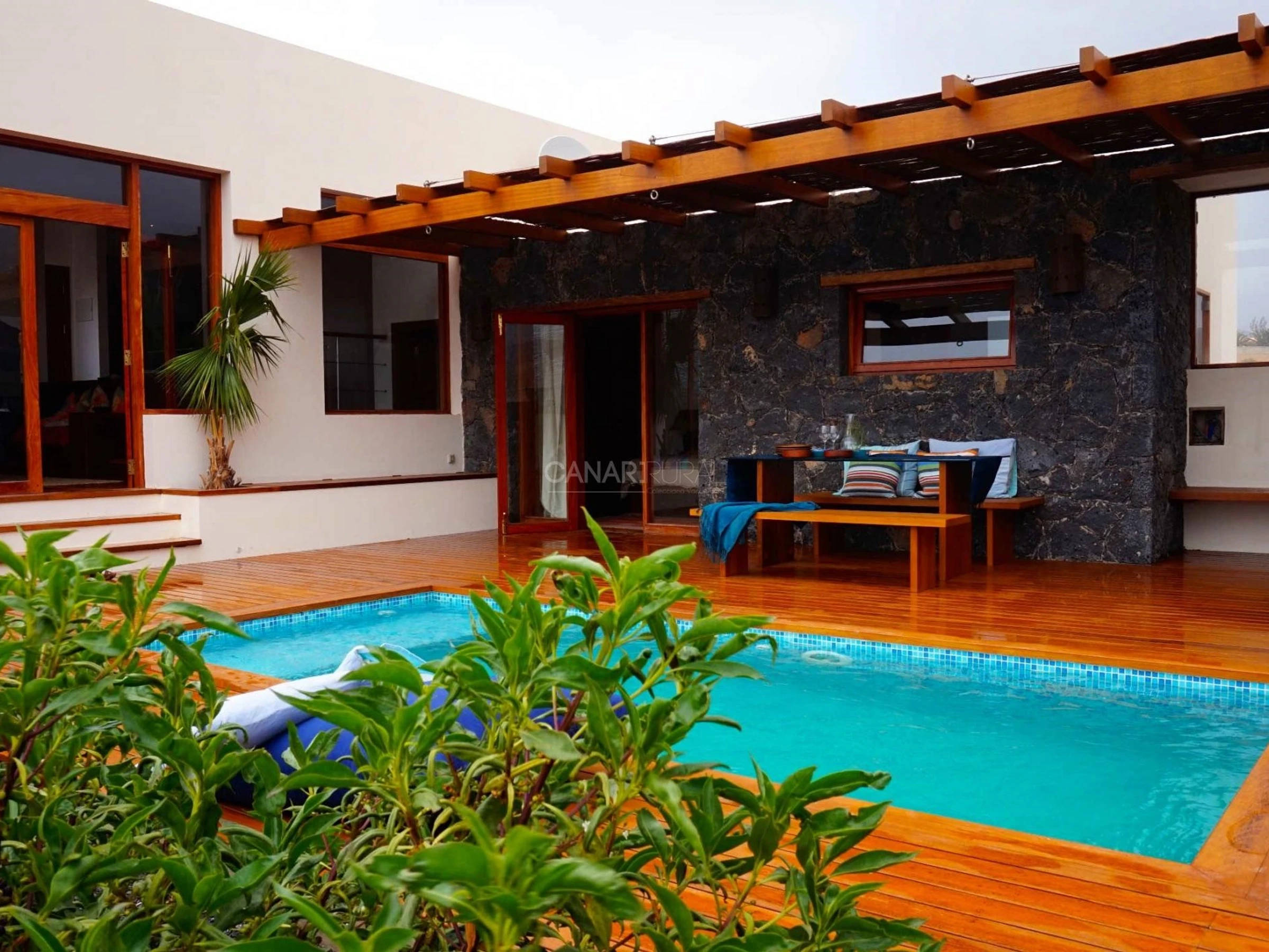 A l’extérieur de la maison, la piscine climatisée et la pergola en bois permettent de profiter des repas, des lectures et activités à l’air libre, également les jours les plus chauds de l’été.