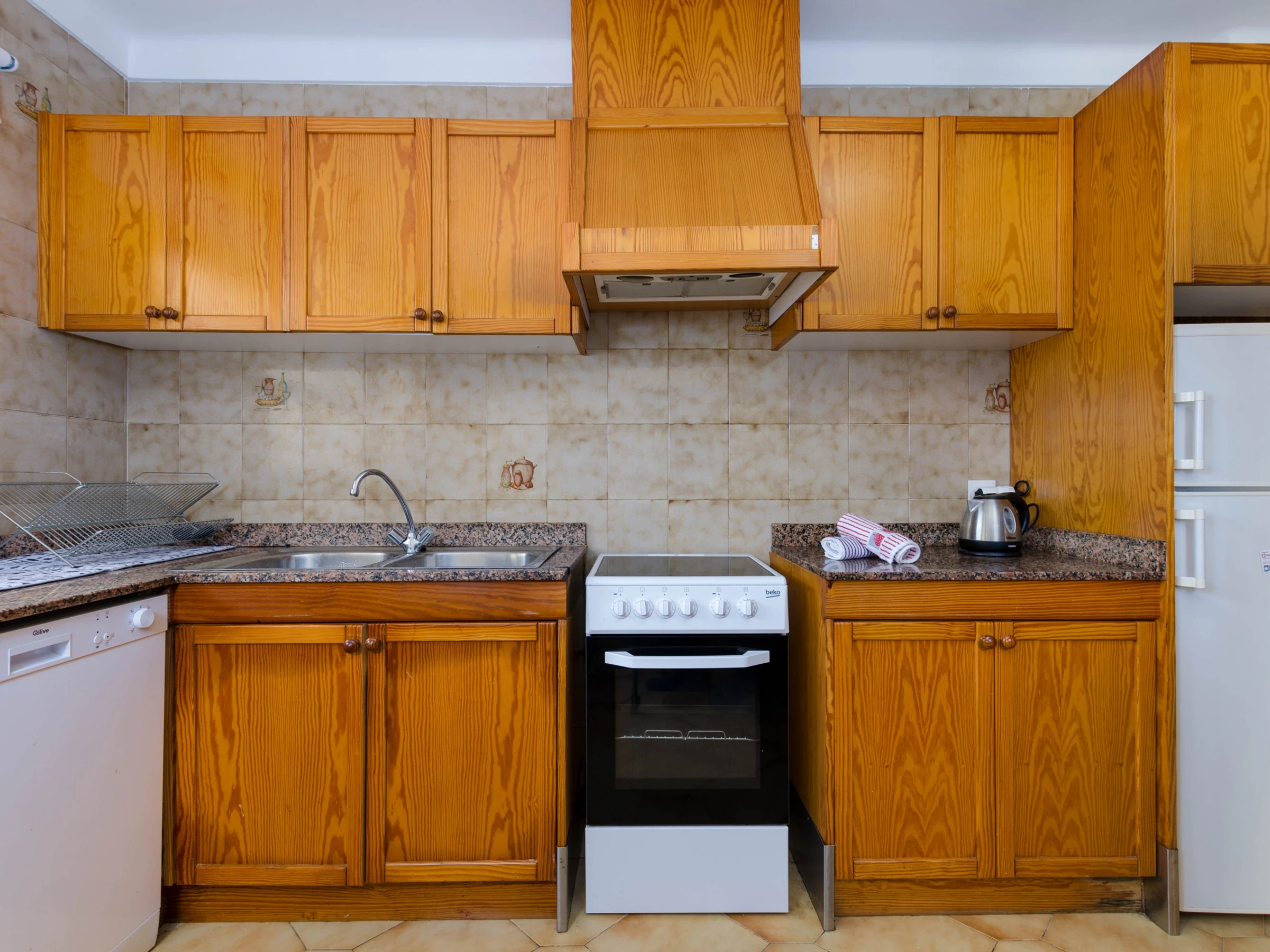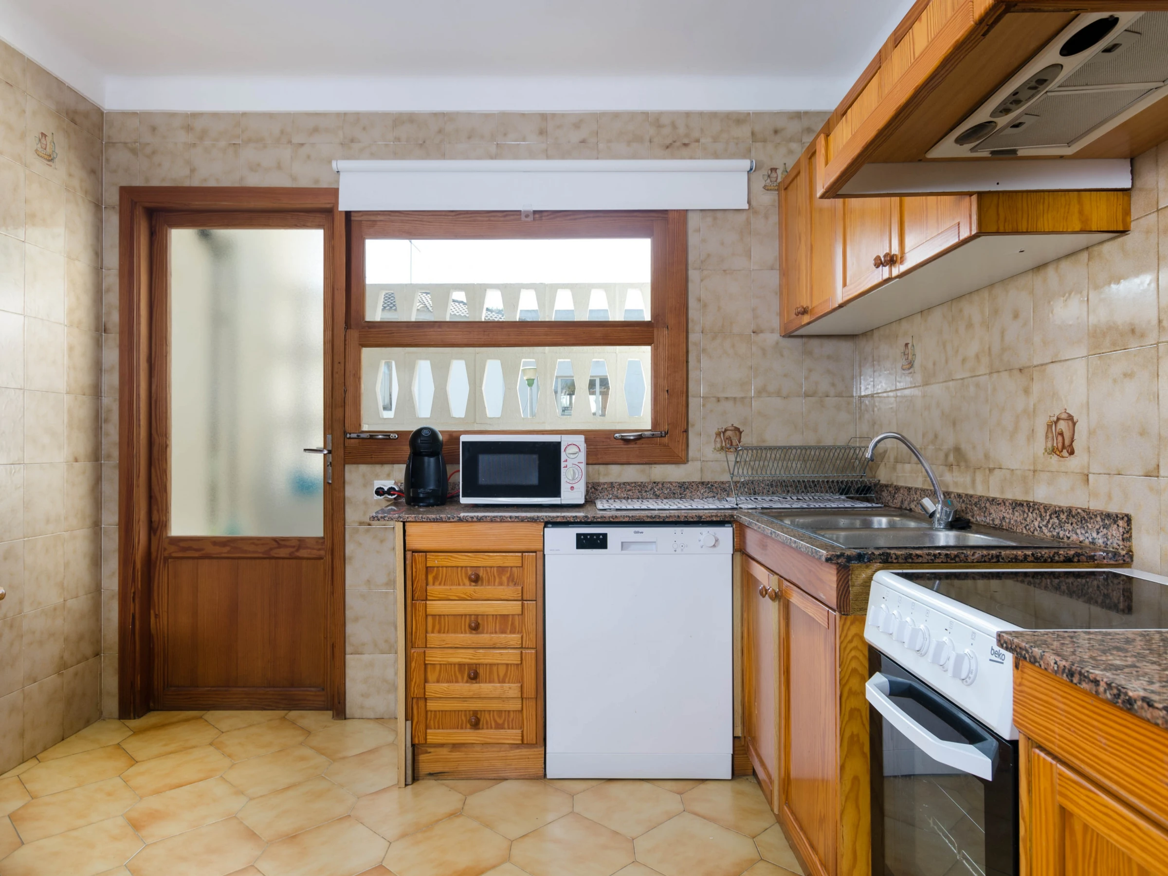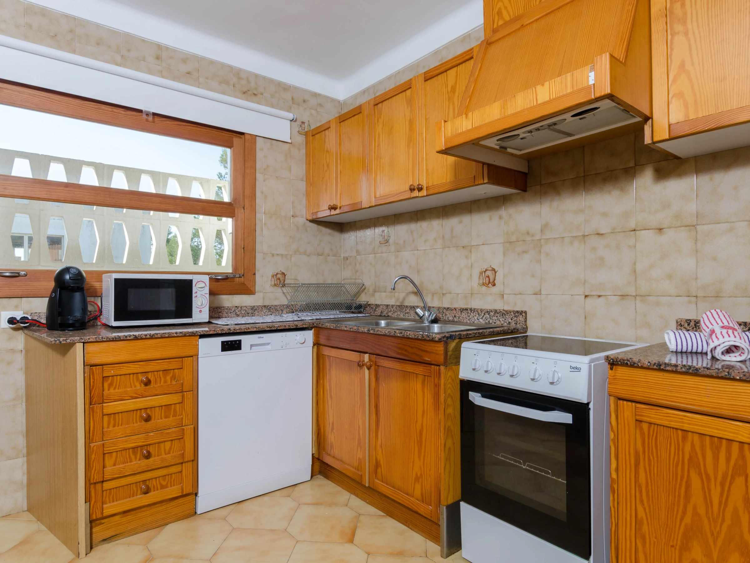 La cuisine, est équipée avec micro-ondes, congélateur, lave-vaisselle, cafetière et grille pain.