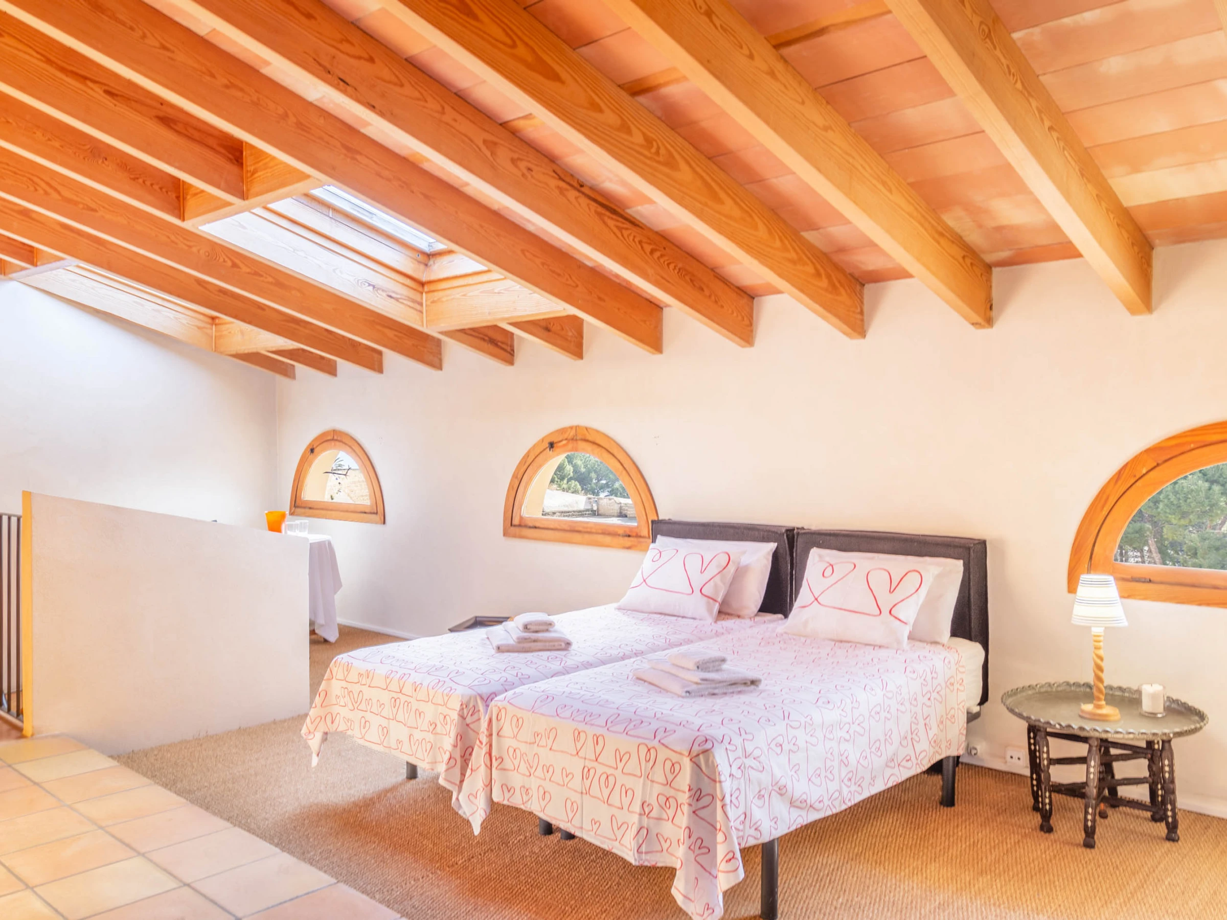 Go up another level to the third huge bedroom with two single beds, seating area, table and chairs with views to the sea, there is also a bathroom with walk in shower.