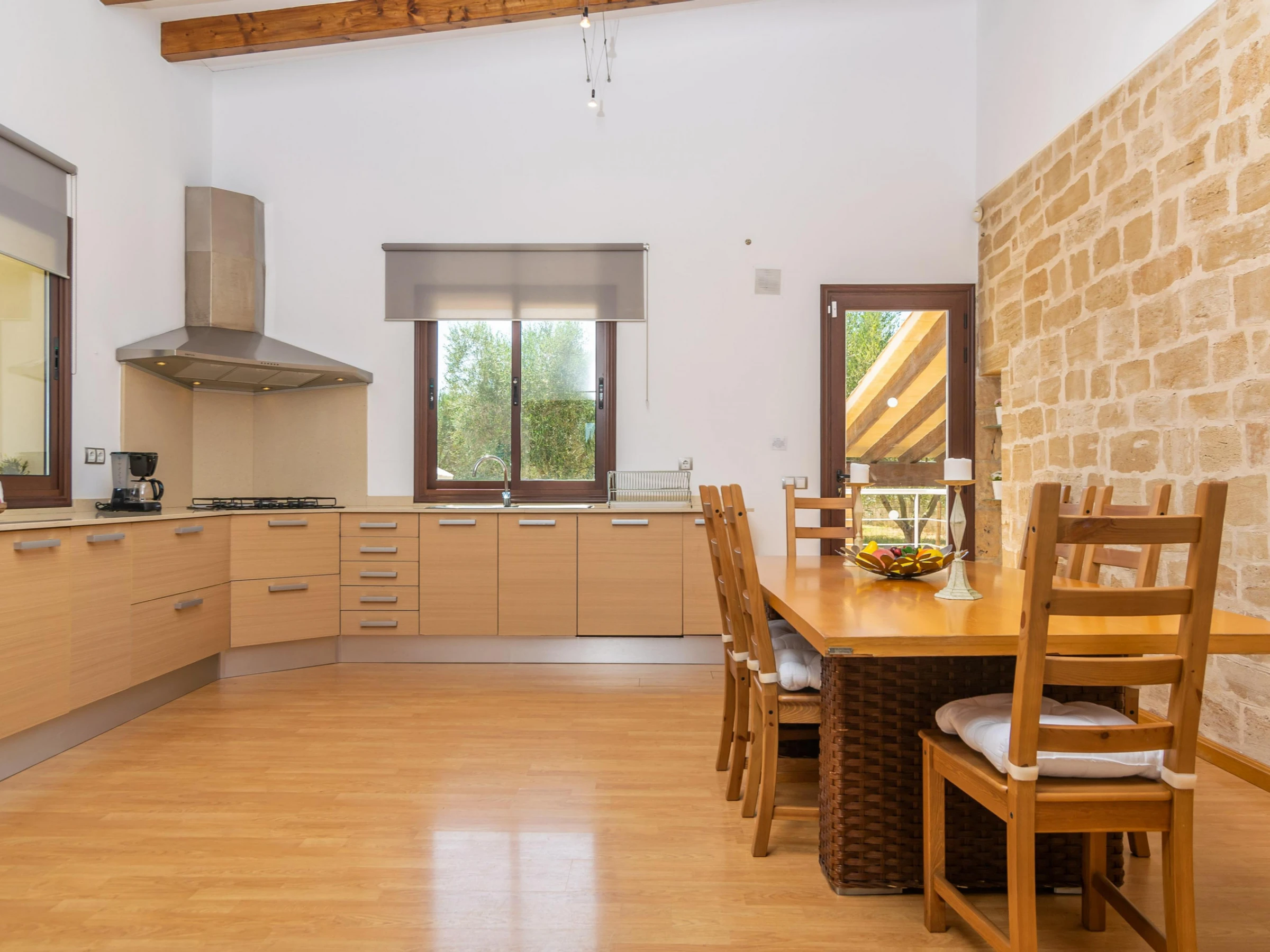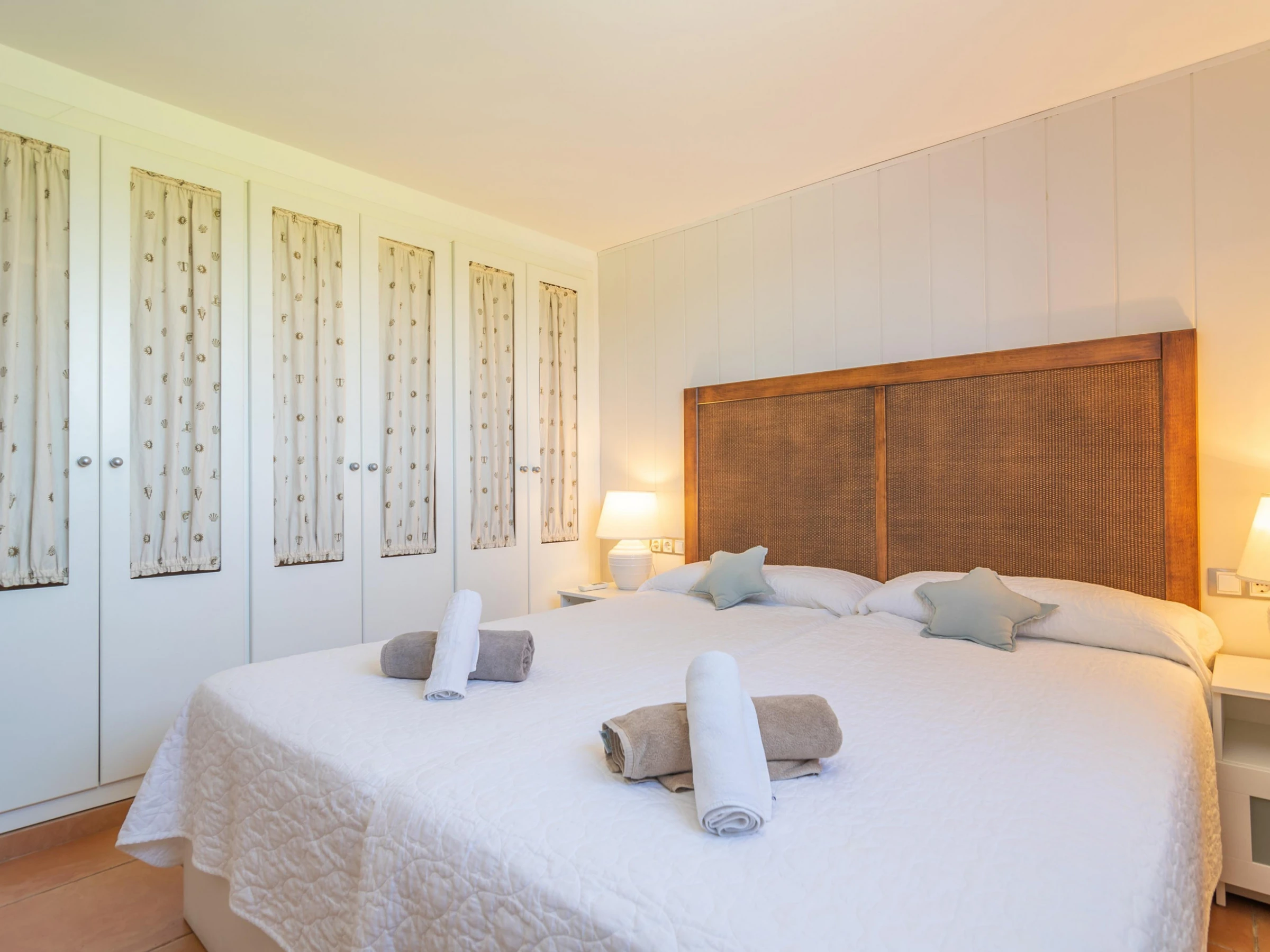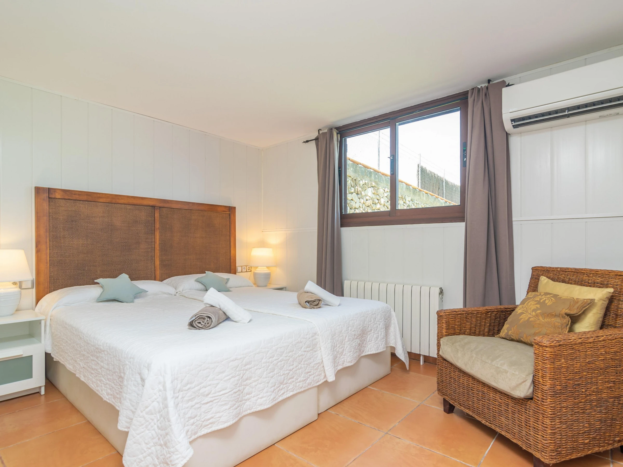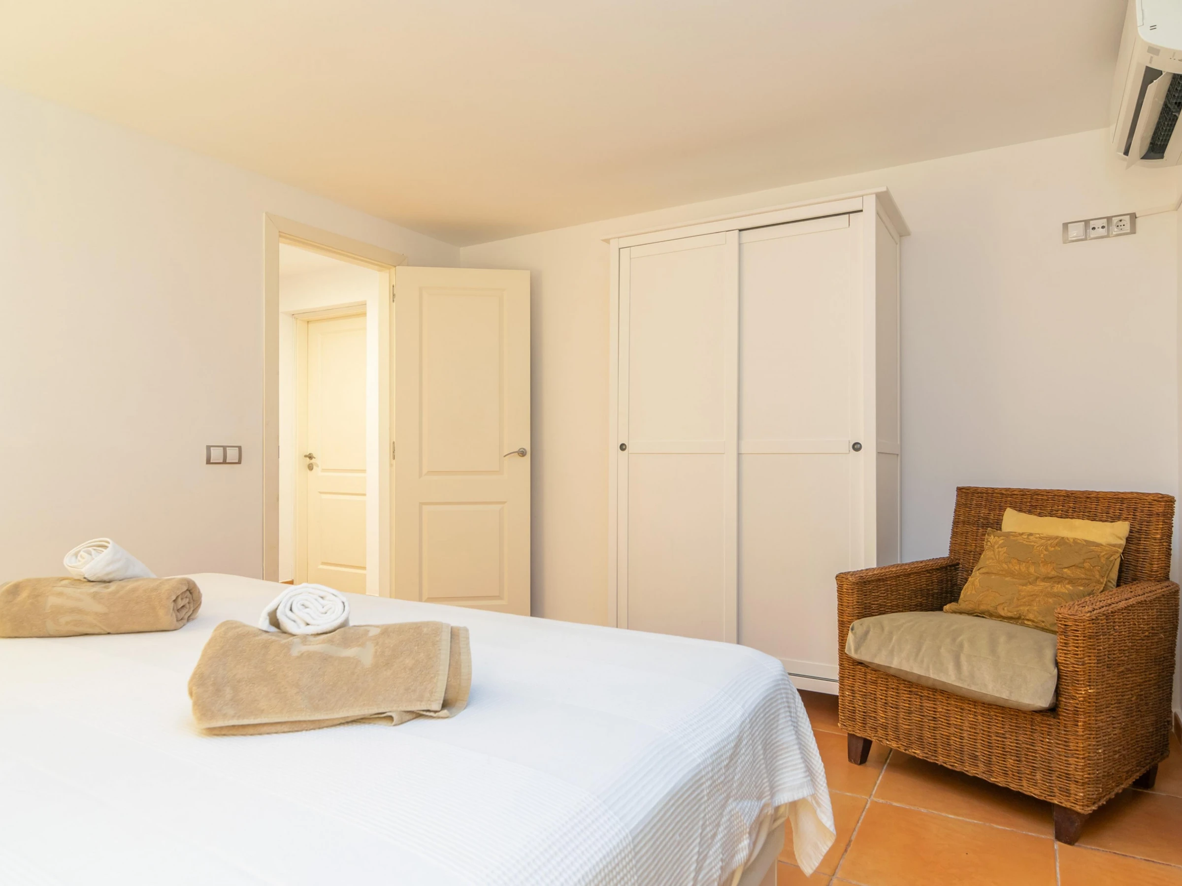La maison est répartie sur deux niveaux : le rez-de-chaussée et le premier étage. Au rez-de-chaussée, vous trouverez un spacieux salon avec télévision par satellite, ouvert sur la cuisine équipée d'une plaque de cuisson au gaz. À chaque étage, vous trouverez deux chambres, l'une avec des lits jumeaux et l'autre avec un lit double. Toutes les chambres disposent d'un placard. Un lit bébé et une chaise haute sont également à votre disposition. La maison dispose de deux salles de bains : une avec douche au rez-de-chaussée et une avec baignoire au rez-de-chaussée. Toutes les pièces sont climatisées. La buanderie est équipée d'un lave-linge, d'un fer et d'une planche à repasser.