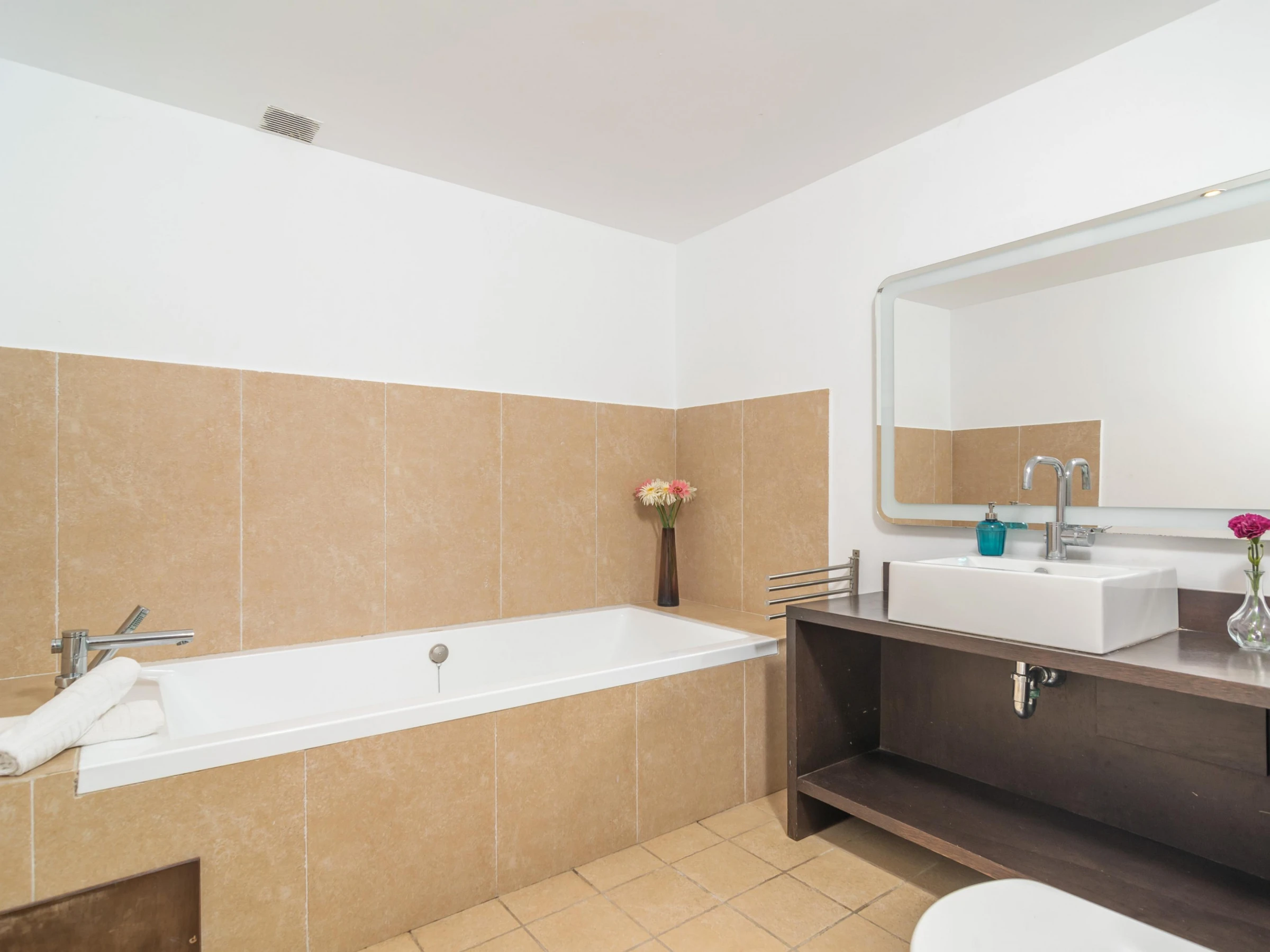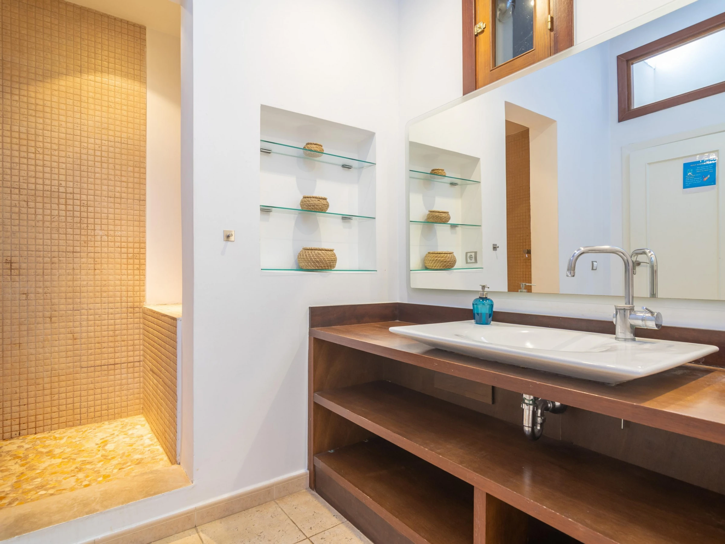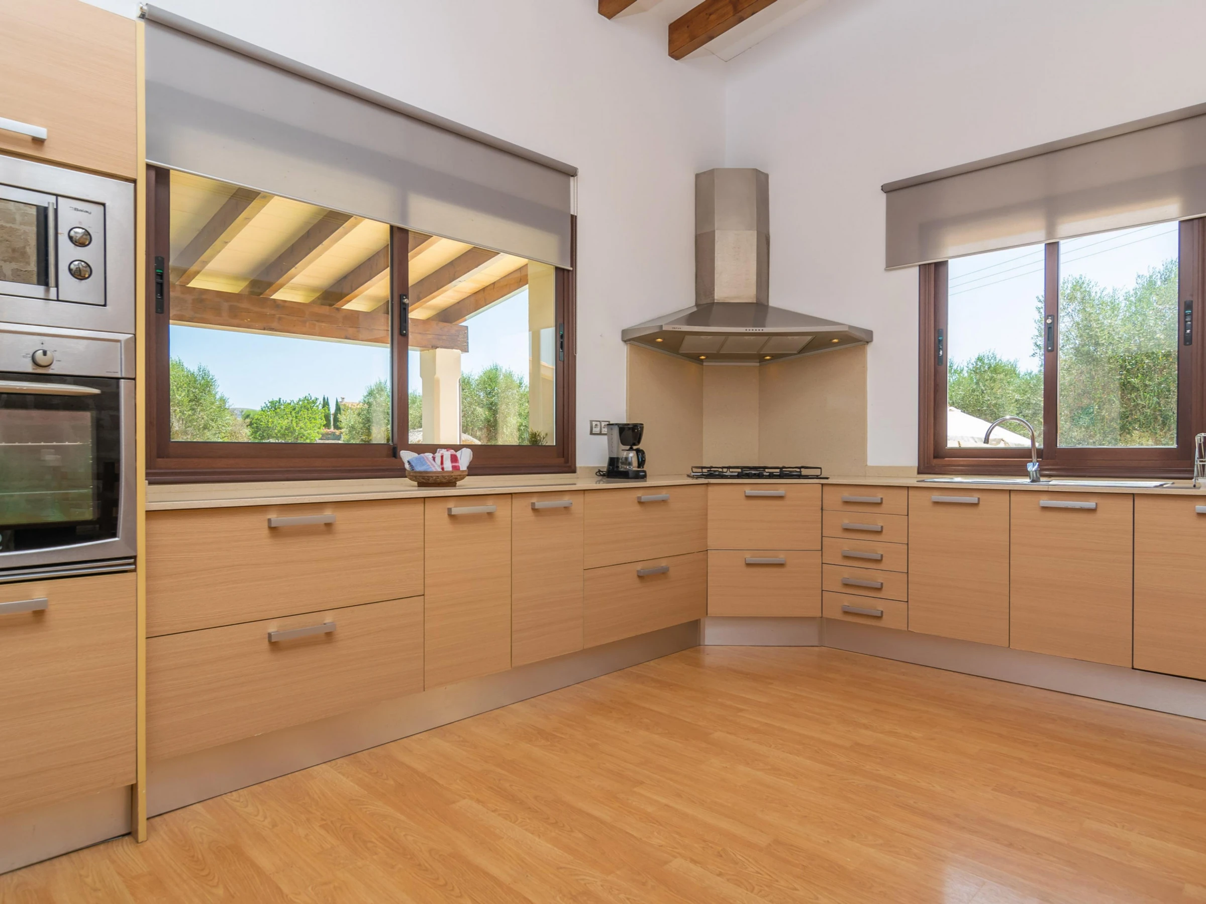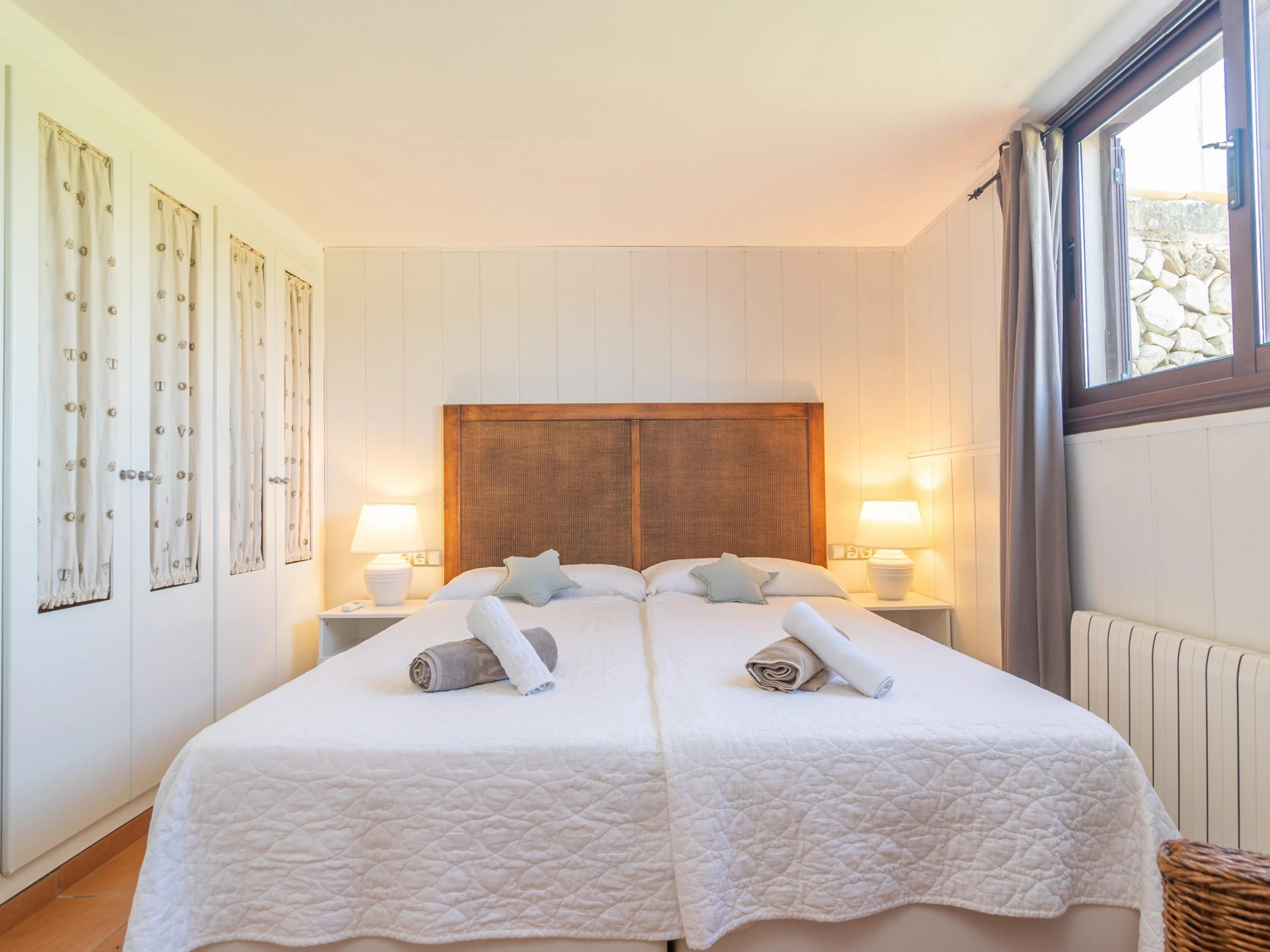 La maison est répartie sur deux niveaux : le rez-de-chaussée et le premier étage. Au rez-de-chaussée, vous trouverez un spacieux salon avec télévision par satellite, ouvert sur la cuisine équipée d'une plaque de cuisson au gaz. À chaque étage, vous trouverez deux chambres, l'une avec des lits jumeaux et l'autre avec un lit double. Toutes les chambres disposent d'un placard. Un lit bébé et une chaise haute sont également à votre disposition. La maison dispose de deux salles de bains : une avec douche au rez-de-chaussée et une avec baignoire au rez-de-chaussée. Toutes les pièces sont climatisées. La buanderie est équipée d'un lave-linge, d'un fer et d'une planche à repasser.