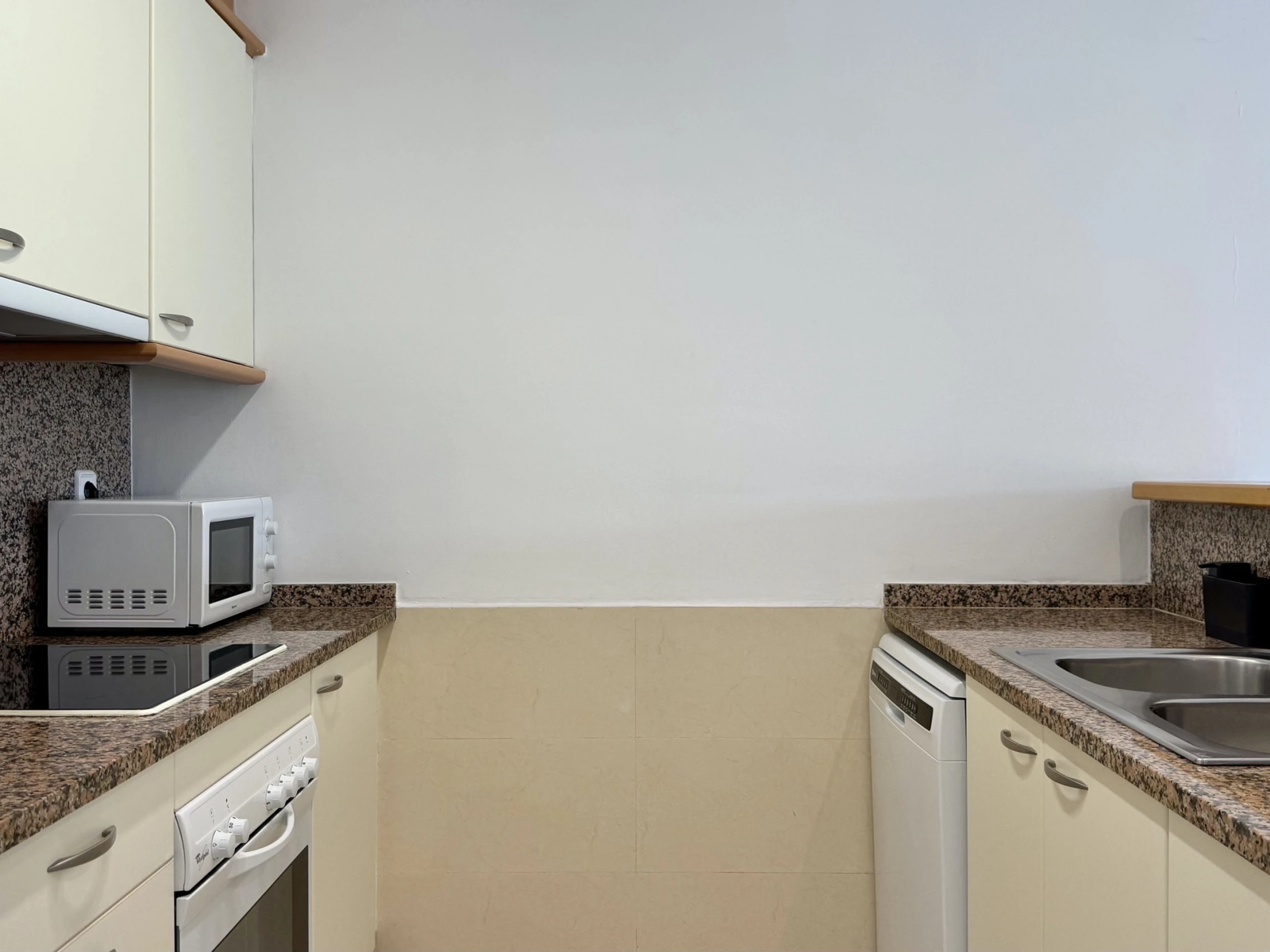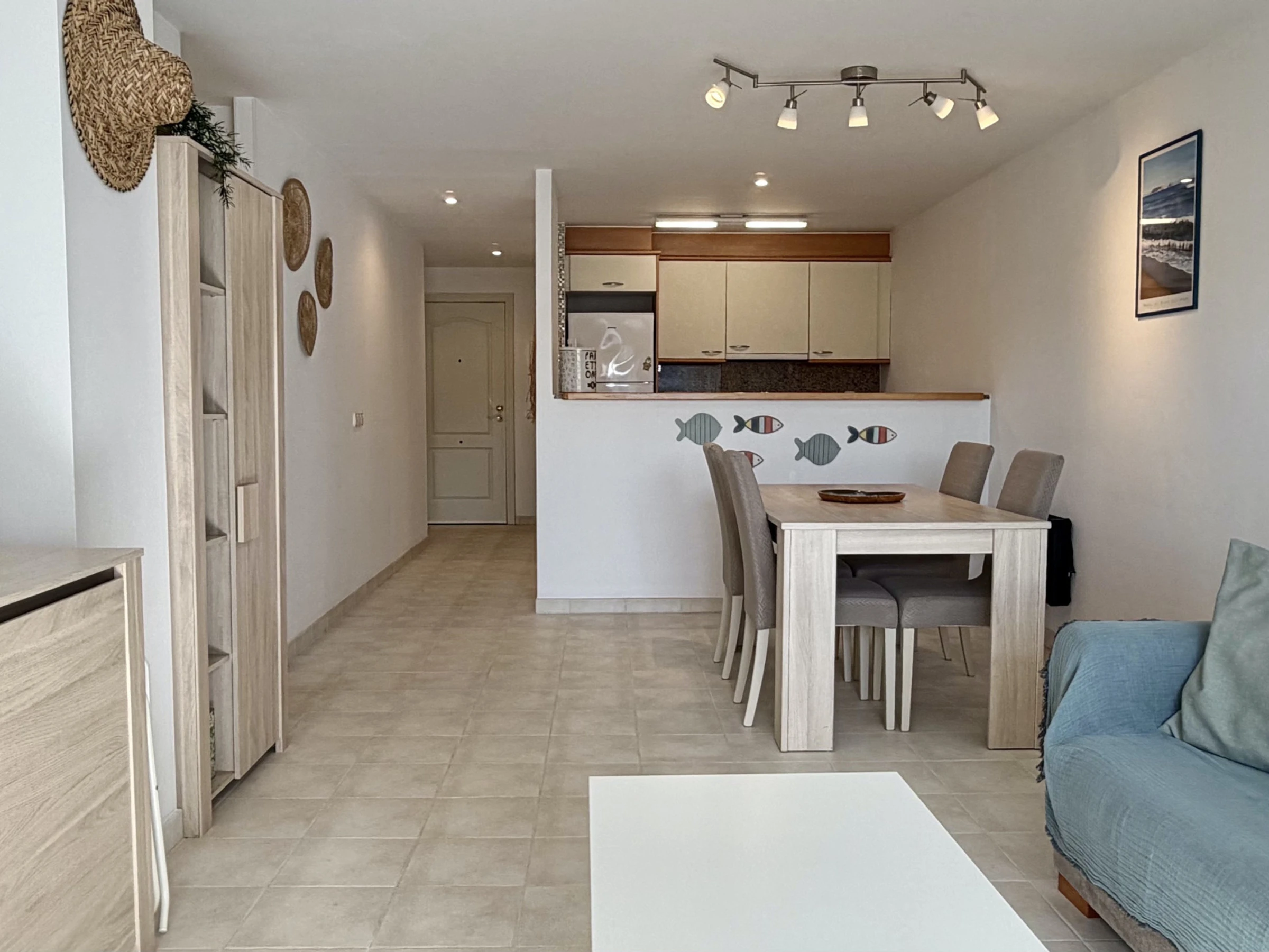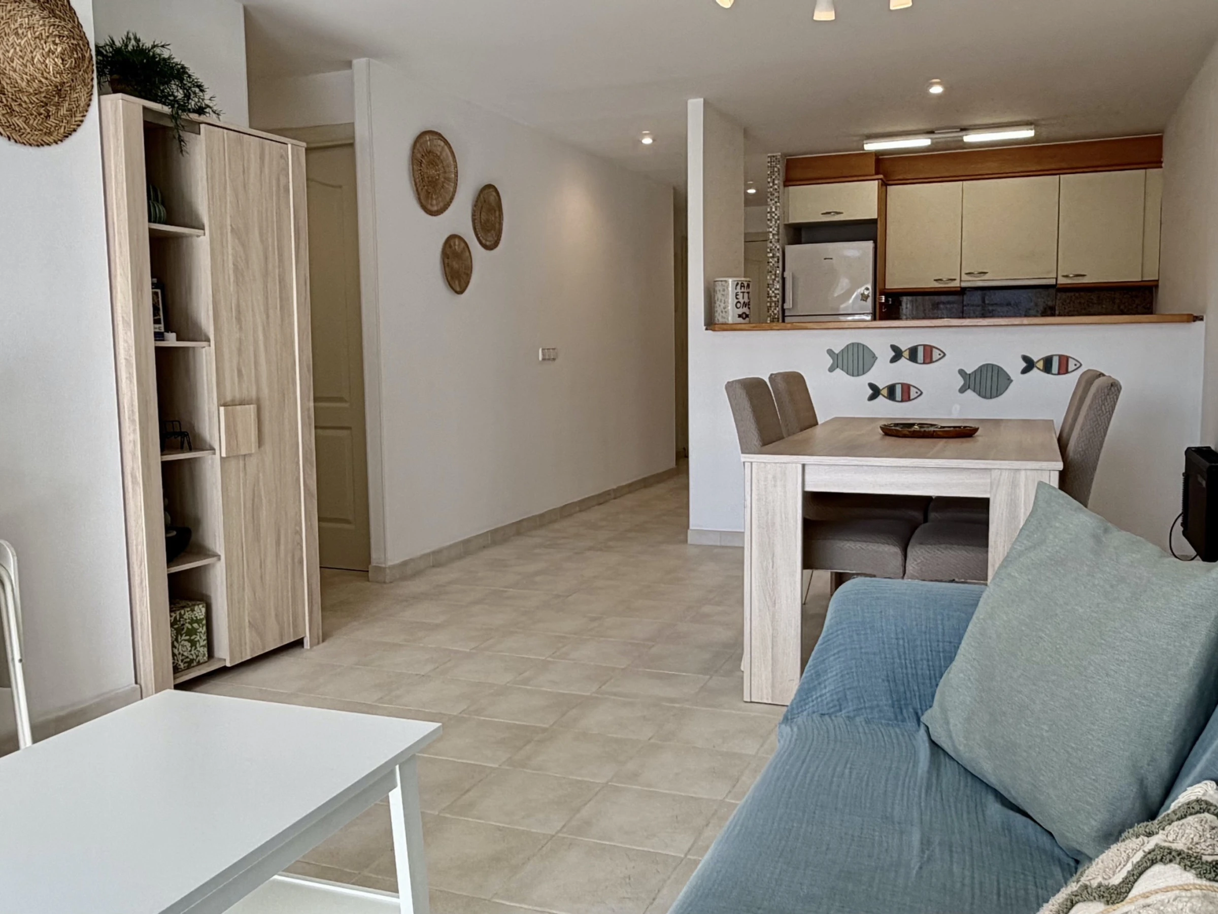 La cuisine américaine est entièrement équipée d'appareils électroménagers modernes, y compris un lave-linge, un lave-vaisselle, un four, un micro-ondes, un grille-pain et une machine à café. Elle dispose d'un réfrigérateur et d'un congélateur pour maintenir les aliments frais pendant le séjour. L'appartement offre 3 lits : un lit double et deux lits individuels, s'adaptant parfaitement aux différentes configurations familiales.