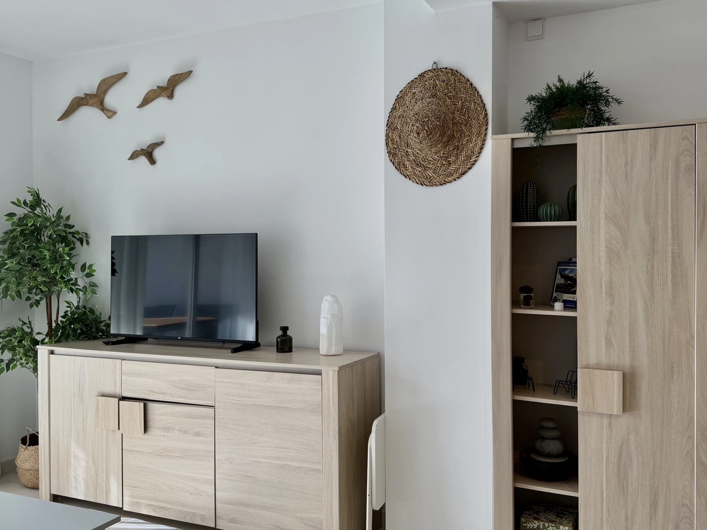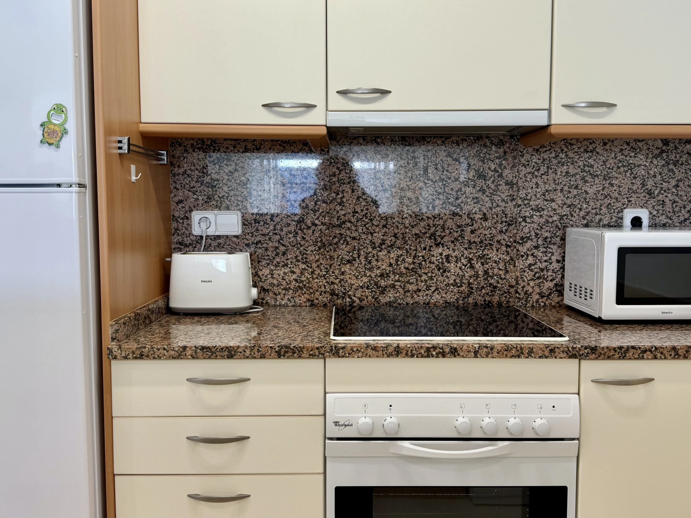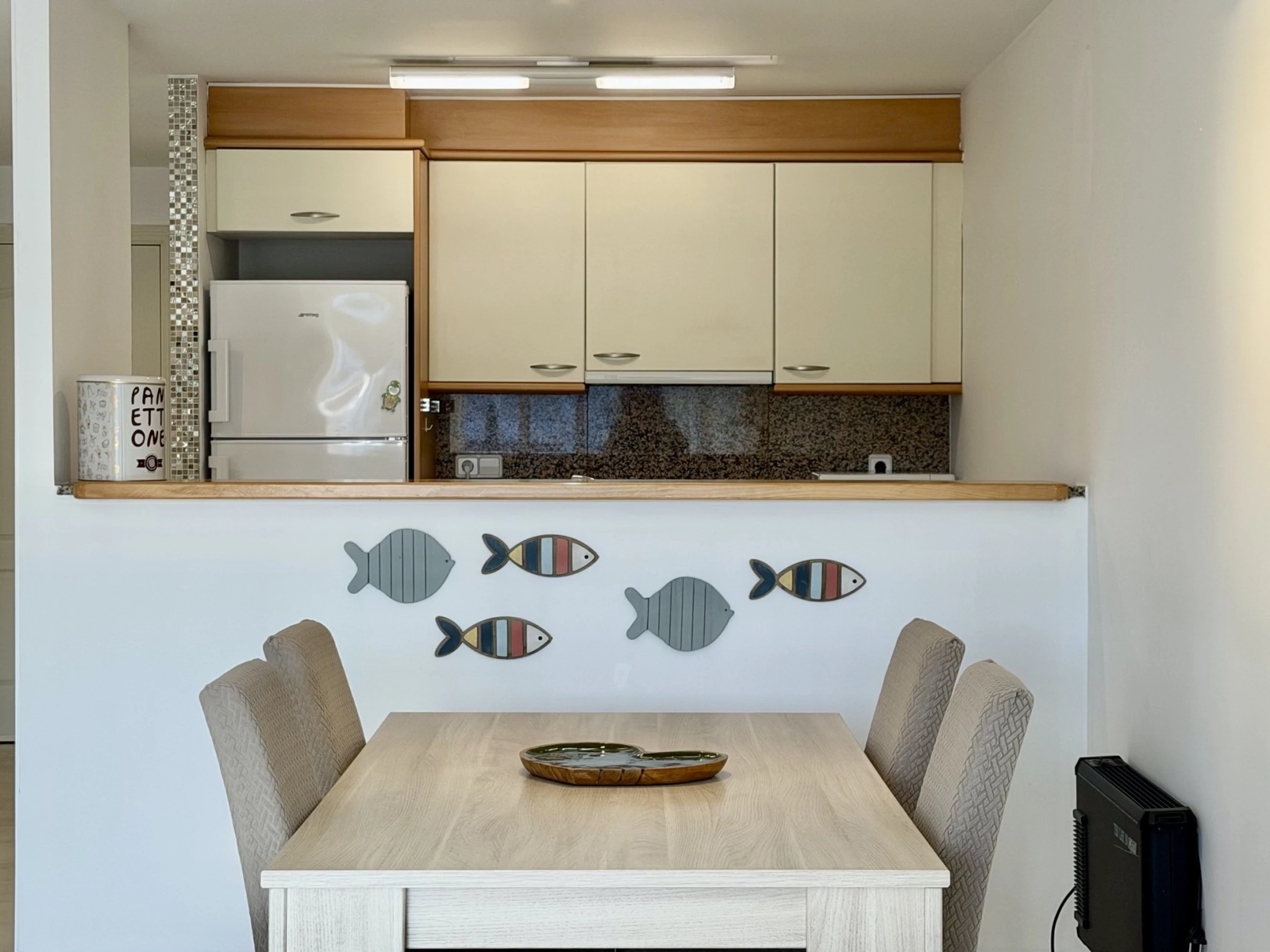 La cuisine américaine est entièrement équipée d'appareils électroménagers modernes, y compris un lave-linge, un lave-vaisselle, un four, un micro-ondes, un grille-pain et une machine à café. Elle dispose d'un réfrigérateur et d'un congélateur pour maintenir les aliments frais pendant le séjour. L'appartement offre 3 lits : un lit double et deux lits individuels, s'adaptant parfaitement aux différentes configurations familiales.