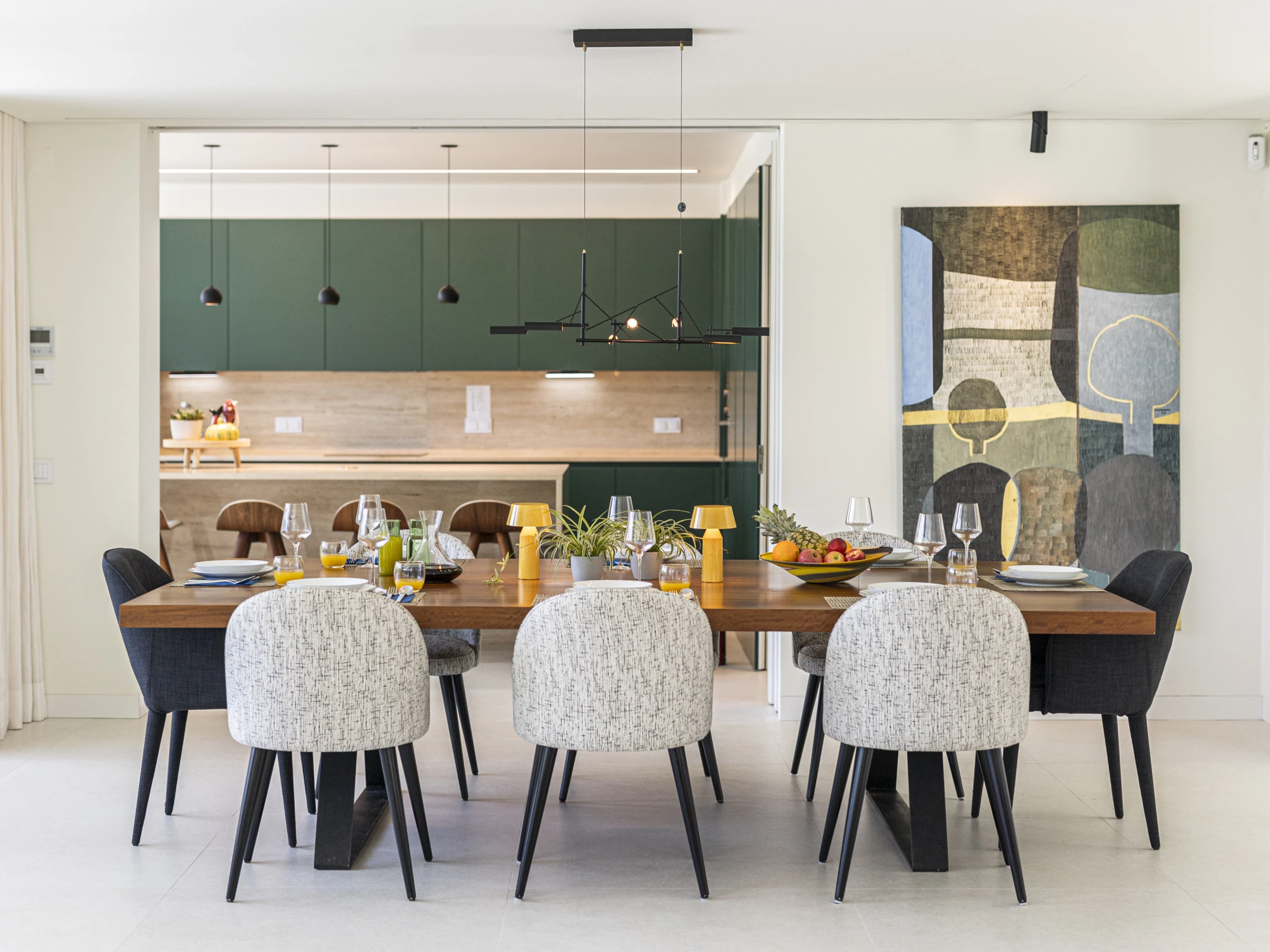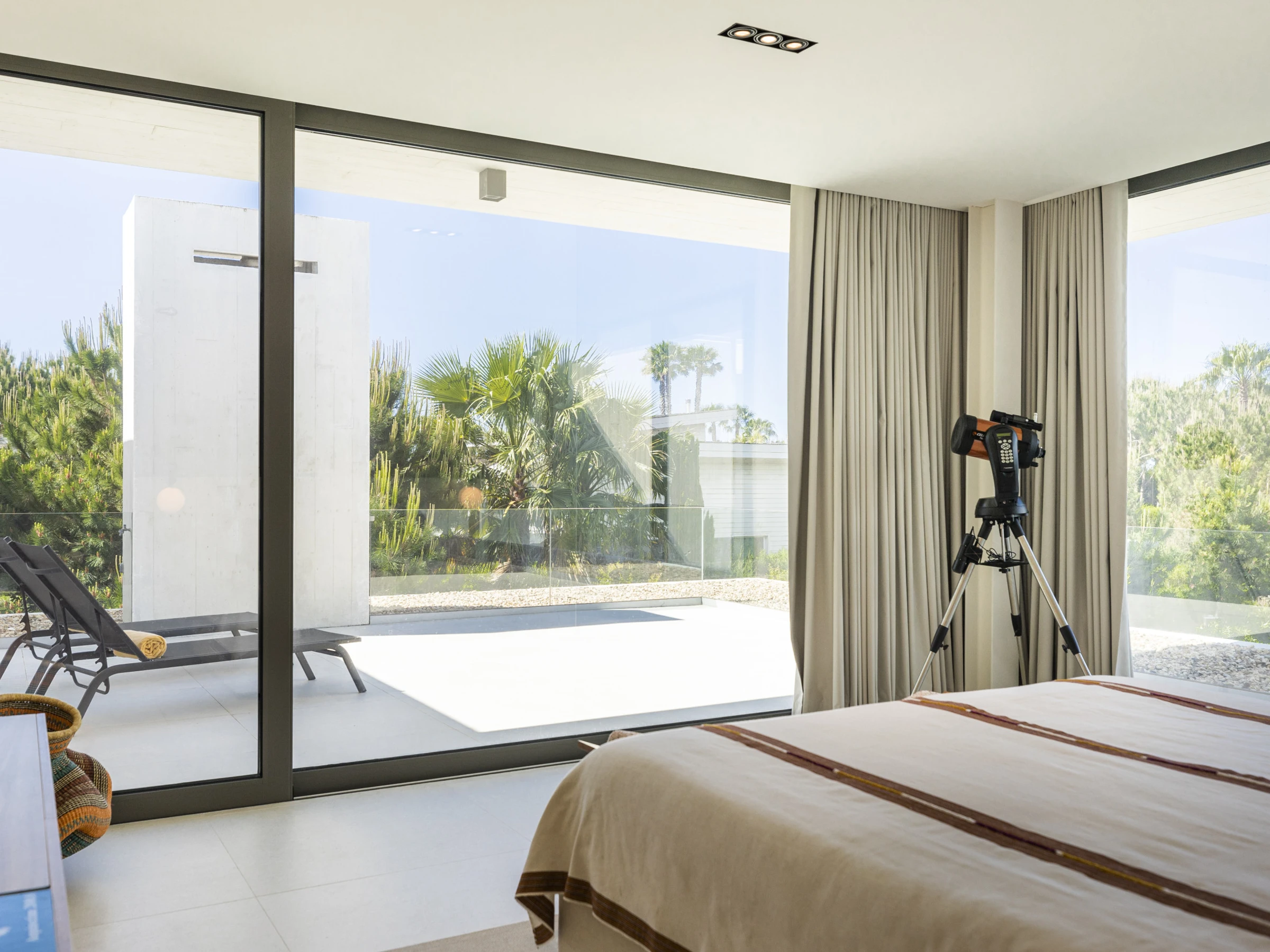 Une cuisine entièrement équipée, baignée de soleil, comprenant un Thermomix Bimby, dessert un salon/salle à manger élégant aux couleurs audacieuses et à l'art éclectique. Les portes vitrées inondent la pièce de lumière et permettent un accès direct au jardin et à l'espace repas extérieur. Une cheminée aidera à chasser le froid pendant les nuits plus fraîches, tandis que toute la villa est équipée de la climatisation pour les mois d'été plus chauds, et dispose d'un chauffage au sol qui se transforme en système de refroidissement en été.